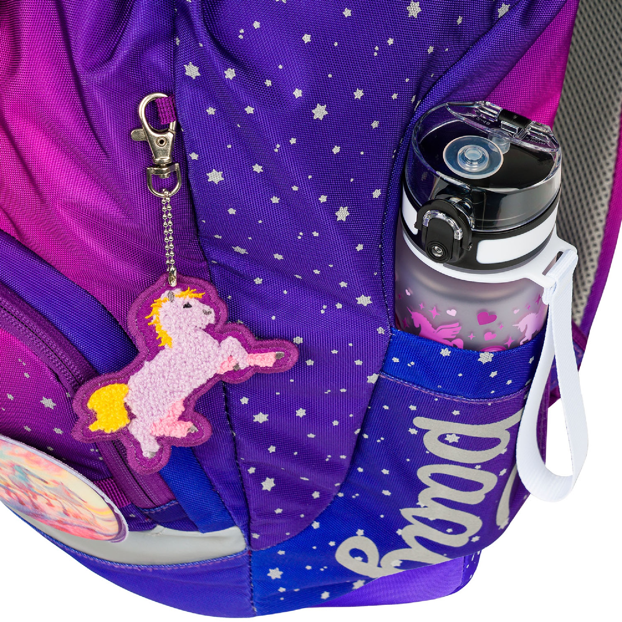 Jednokomorové vnitřní uspořádání s kapsou a gumičkou pro uchycení desek na zádové straně slouží ke snadné organizaci všech školních pomůcek.