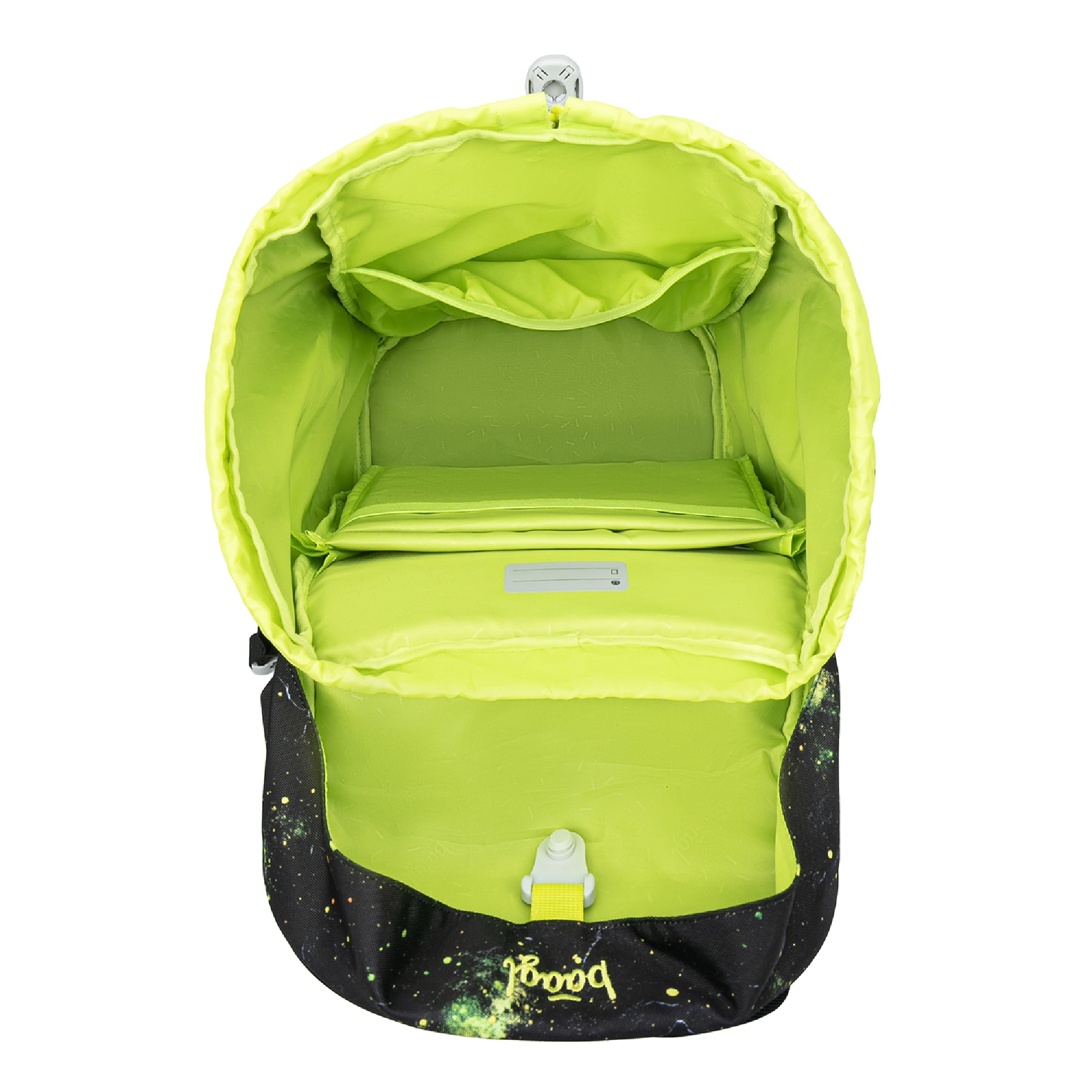 Jednokomorové vnitřní uspořádání s kapsou a gumičkou pro uchycení desek na zádové straně slouží ke snadné organizaci všech školních pomůcek.