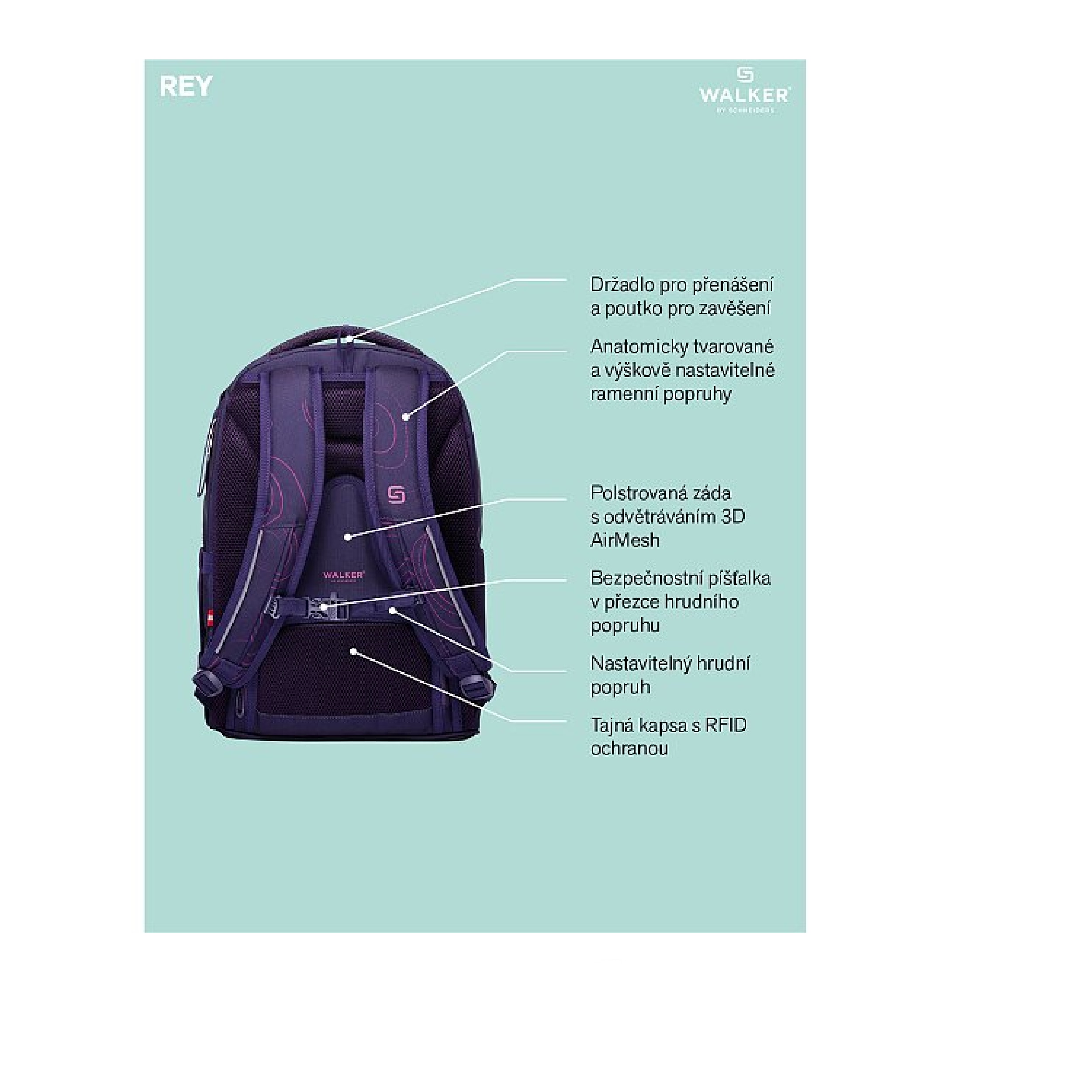 Popis:Školní batoh Layers Grey z řady Walker Rey s reflexními prvky. Batoh má polstrovaná prodyšná záda s odvětráváním 3D AirMesh. (Struktura 3D AirMesh zahrnuje síťovité vrstvy, které vytvářejí trojrozměrné vzduchové kapsy. Tyto kapsy zvyšují ventilaci a pomáhají rychle odvádět vlhkost). Anatomicky tvarované, výškově nastavitelné ramenní popruhy. Tajná kapsa v bederní časti batohu s RFID ochranou (dokáže zablokovat příchozí bezdrátové komunikace a zamezí tak nežádoucímu čtení dat z kreditních karet). Zadní komora s polstrovanou kapsou pro notebook do velikosti 15“, polstrovanou kapsou na tablet a kapsou na mobilní telefon. Stabilní a ochranný materiál dna. Odnímatelná karabina s poutkem. Materiál z 50 % z recyklovaného polyesteru vyrobeného z recyklovaných PET lahví. Speciální materiál 600 D Ripstop Polyester zvyšuje odolnost proti roztržení a v případě roztržení zabraňuje zvětšení trhliny. Materiál s impregnací proti vodě a špíně.
