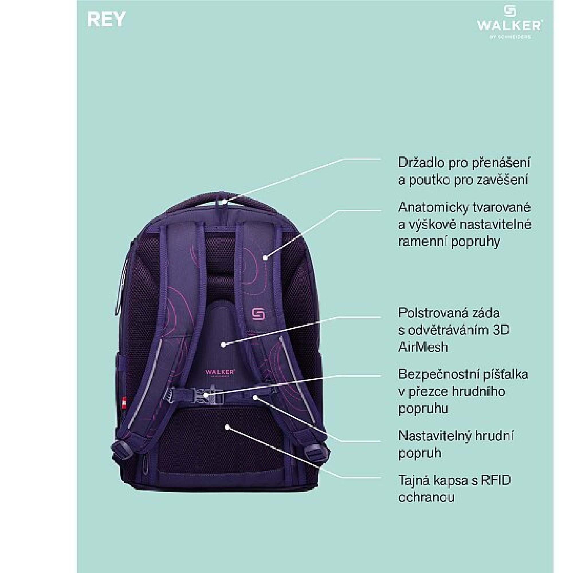 Popis:Školní batoh Purple Frequency z řady Walker Rey s reflexními prvky. Batoh má polstrovaná prodyšná záda s odvětráváním 3D AirMesh. (Struktura 3D AirMesh zahrnuje síťovité vrstvy, které vytvářejí trojrozměrné vzduchové kapsy. Tyto kapsy zvyšují ventilaci a pomáhají rychle odvádět vlhkost). Anatomicky tvarované, výškově nastavitelné ramenní popruhy. Tajná kapsa v bederní časti batohu s RFID ochranou (dokáže zablokovat příchozí bezdrátové komunikace a zamezí tak nežádoucímu čtení dat z kreditních karet). Zadní komora s polstrovanou kapsou pro notebook do velikosti 15“, polstrovanou kapsou na tablet a kapsou na mobilní telefon. Stabilní a ochranný materiál dna. Odnímatelná karabina s poutkem. Materiál z 50 % z recyklovaného polyesteru vyrobeného z recyklovaných PET lahví. Speciální materiál 600 D Ripstop Polyester zvyšuje odolnost proti roztržení a v případě roztržení zabraňuje zvětšení trhliny. Materiál s impregnací proti vodě a špíně.