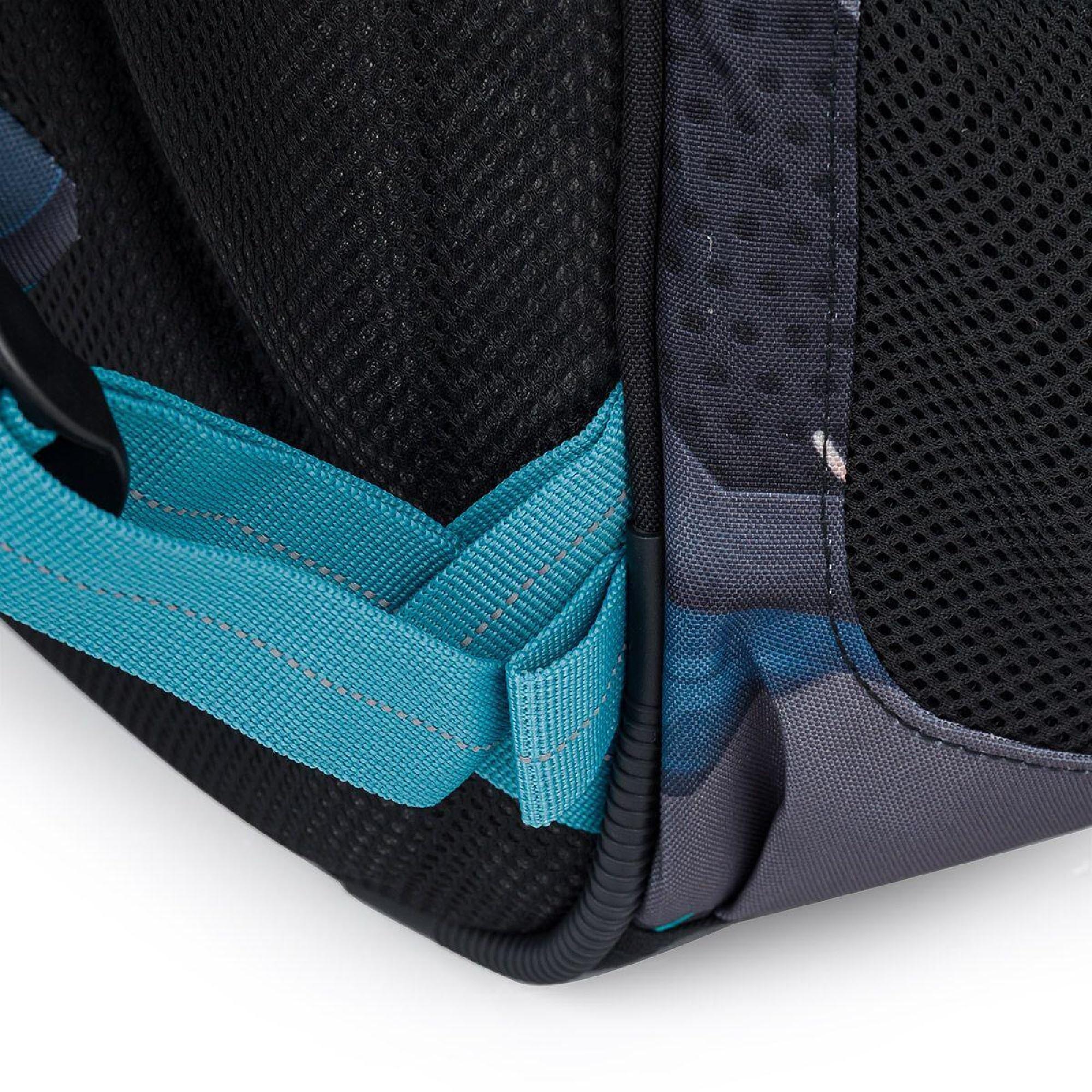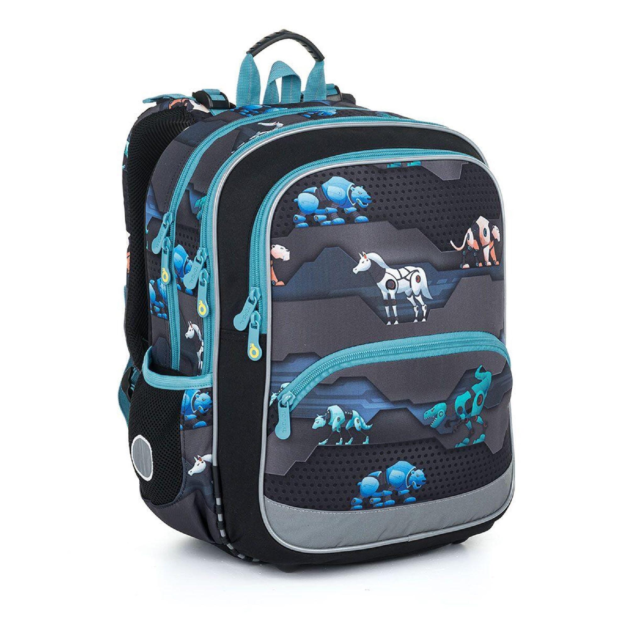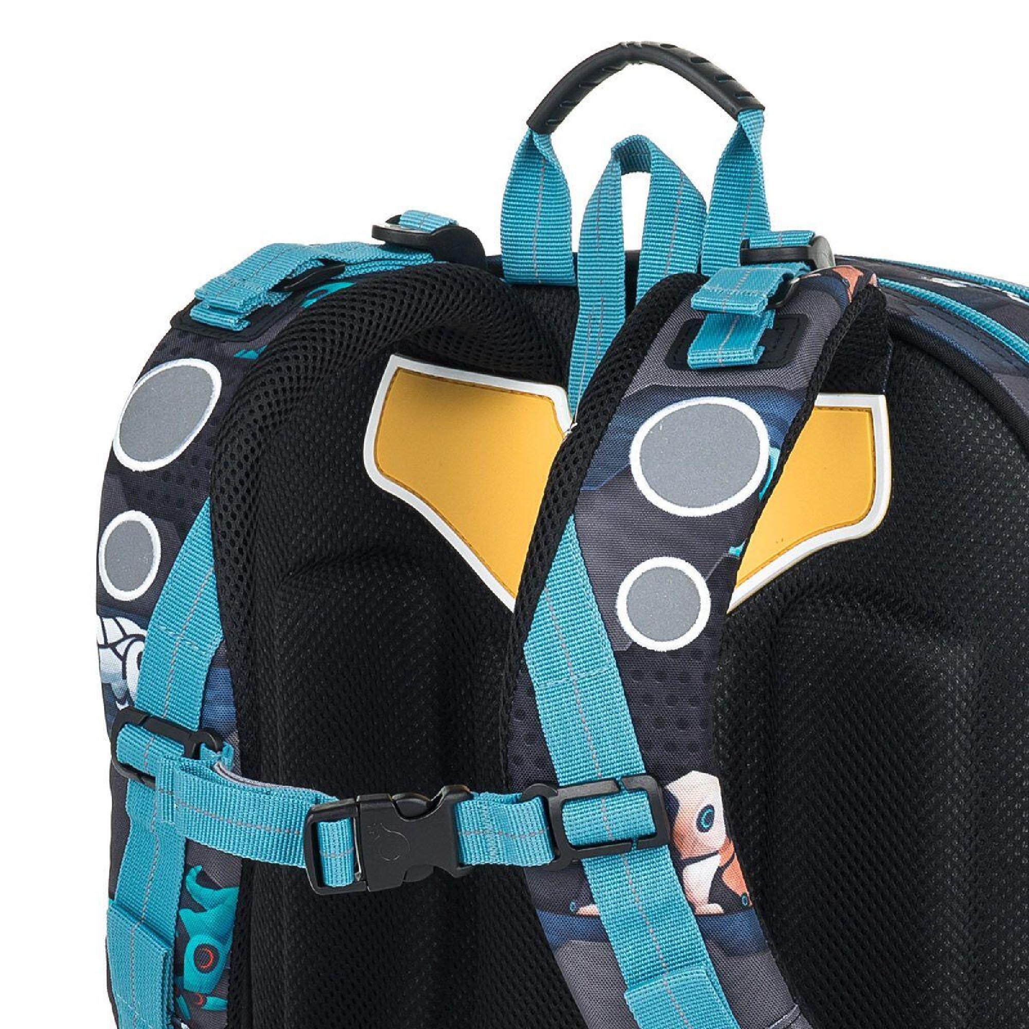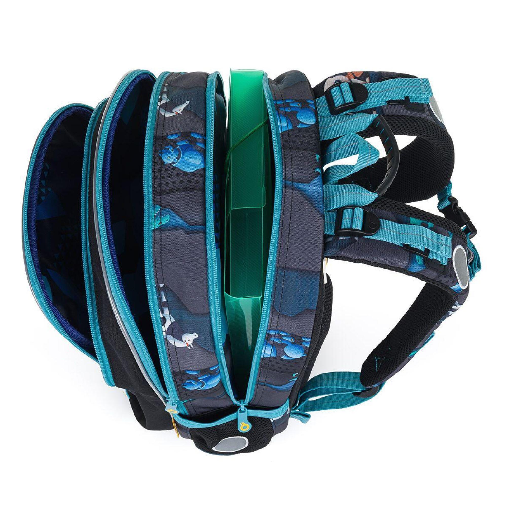 Batoh má dvě hlavní objemné komory. Zadní komora batohu je širší, proto do ní vložte nejtěžší učivo a směrem dopředu odlehčujte. V prostřední komoře je umístěna síťová kapsa na zip a jmenovka.