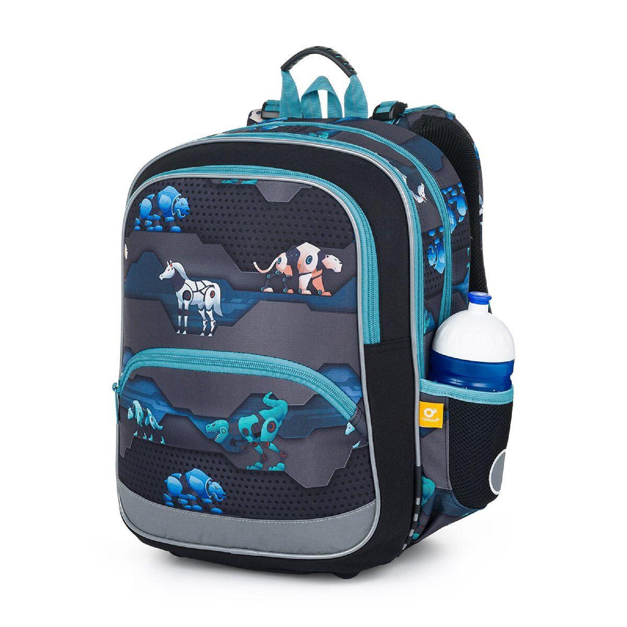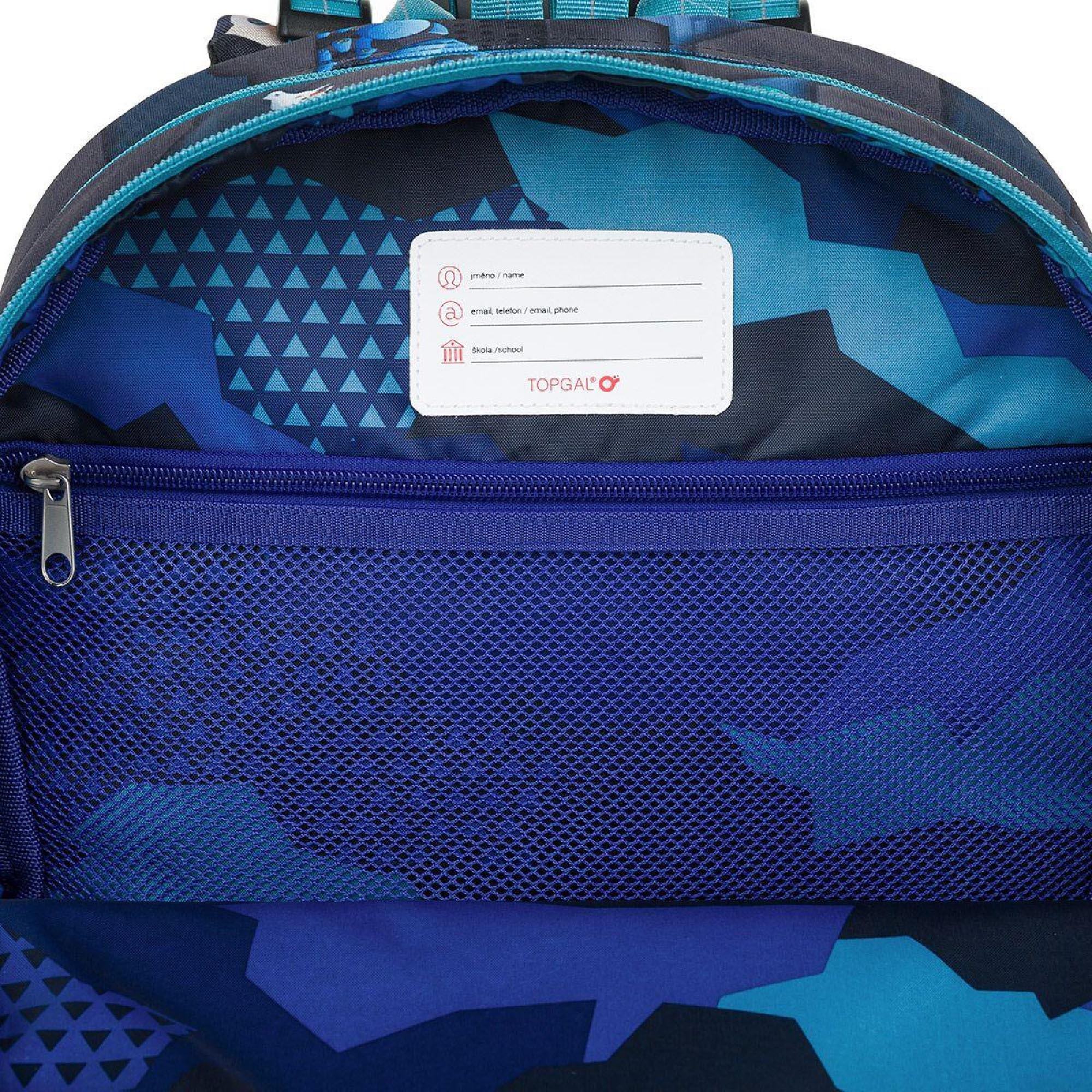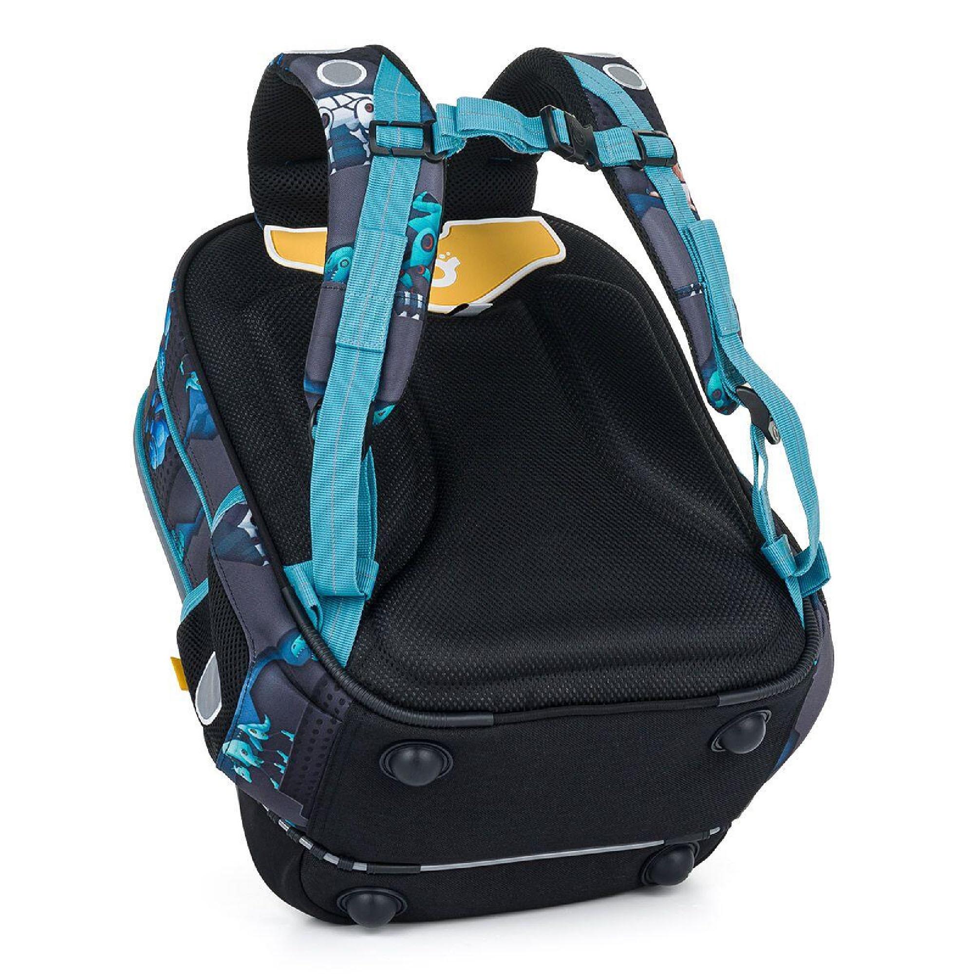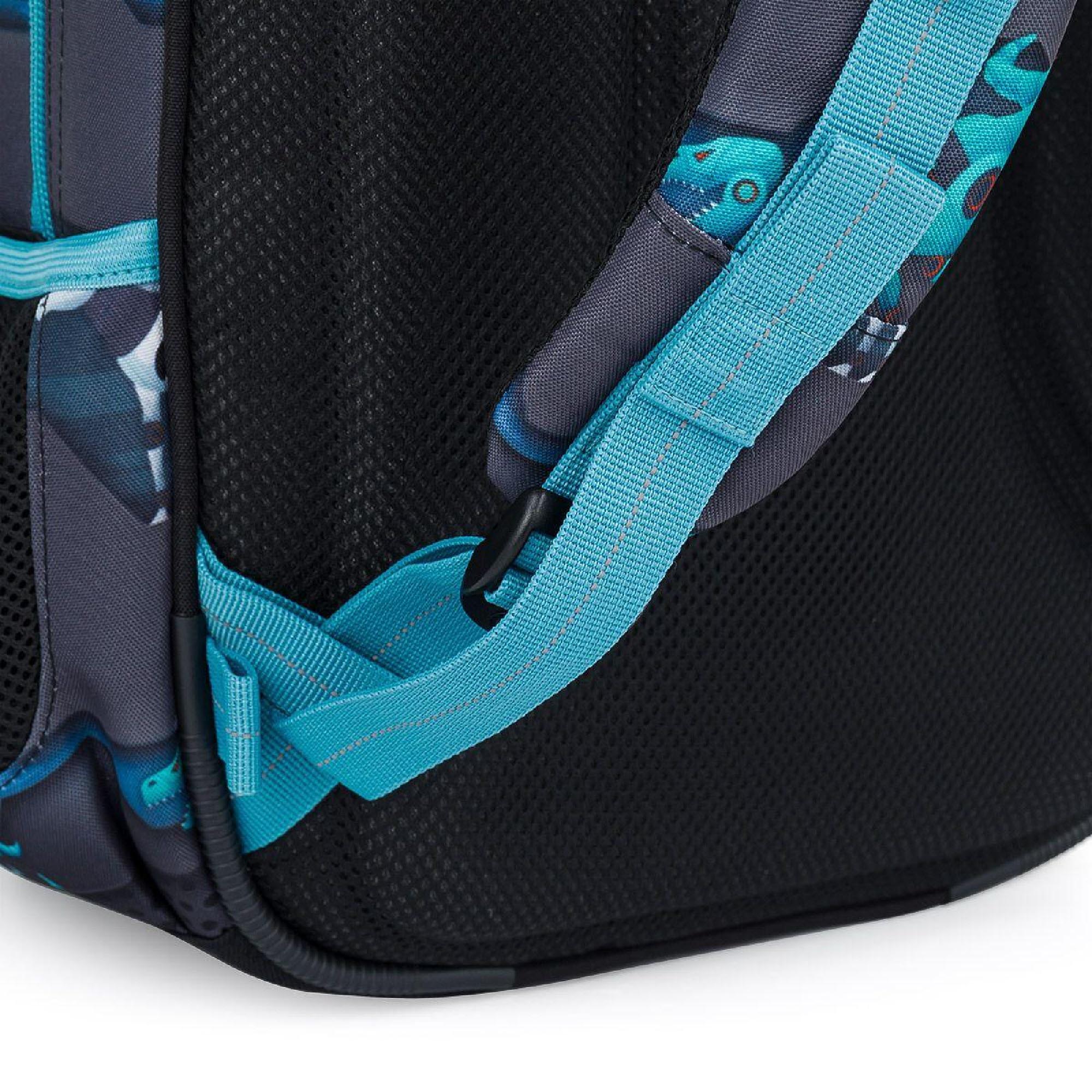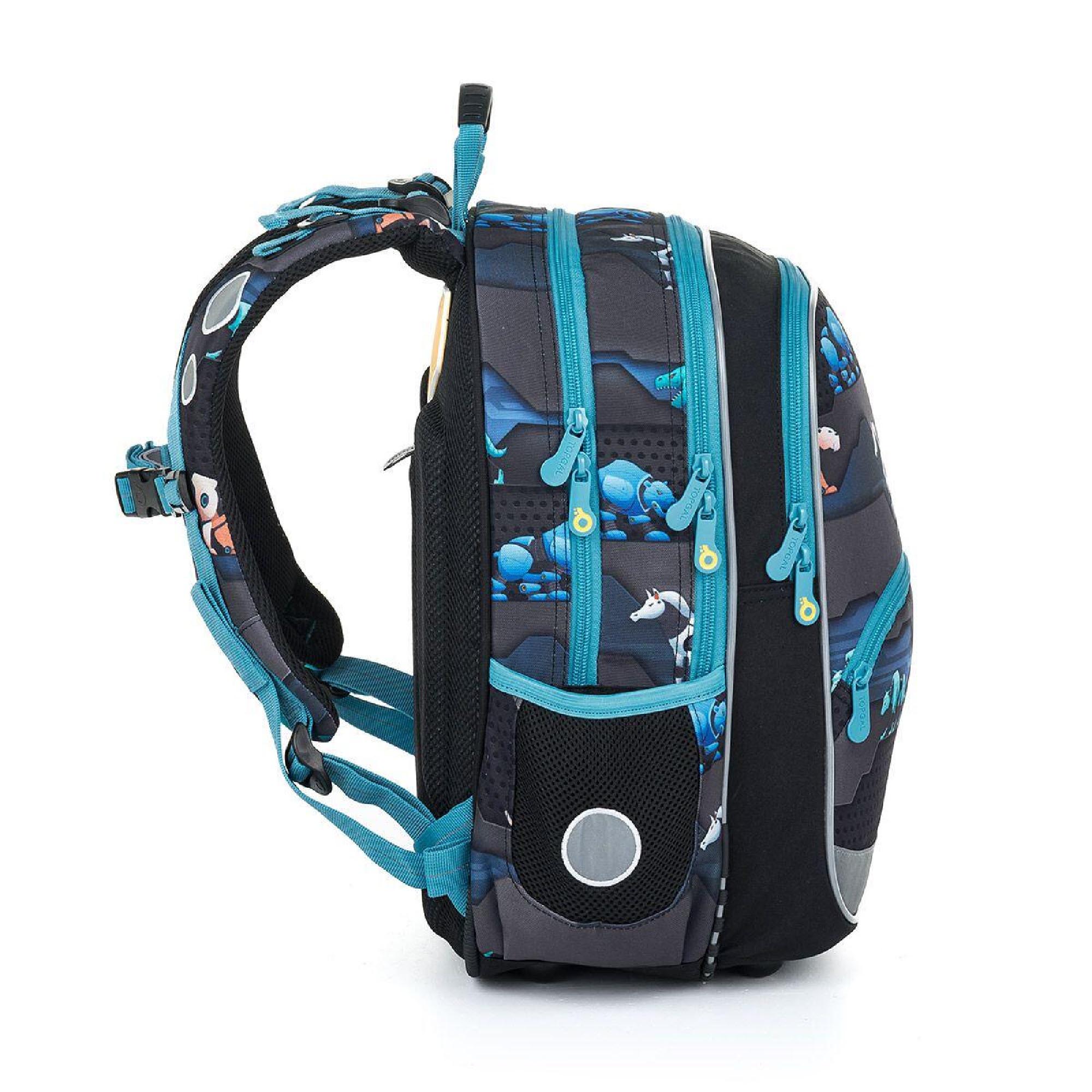 Batoh má dvě hlavní objemné komory. Zadní komora batohu je širší, proto do ní vložte nejtěžší učivo a směrem dopředu odlehčujte. V prostřední komoře je umístěna síťová kapsa na zip a jmenovka.