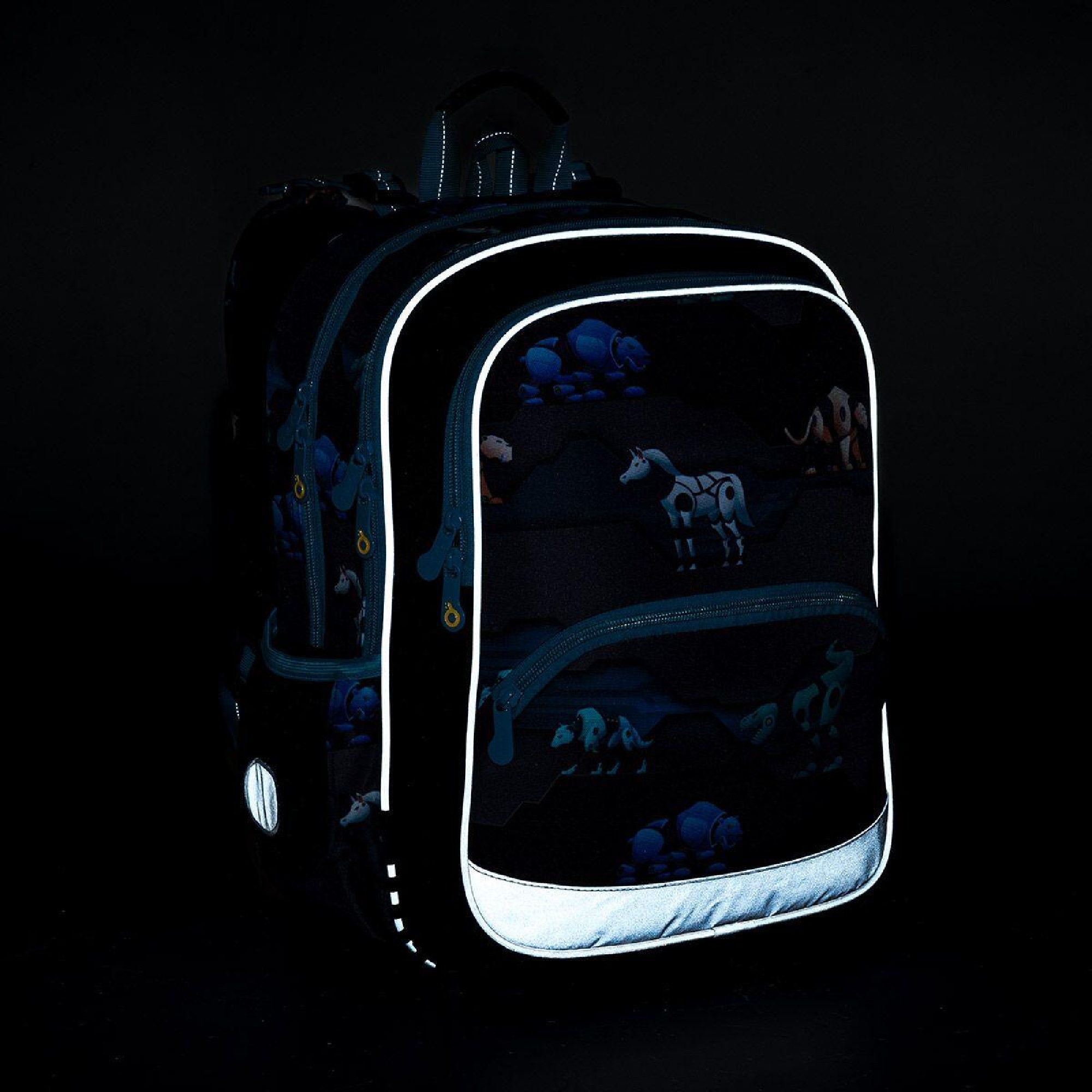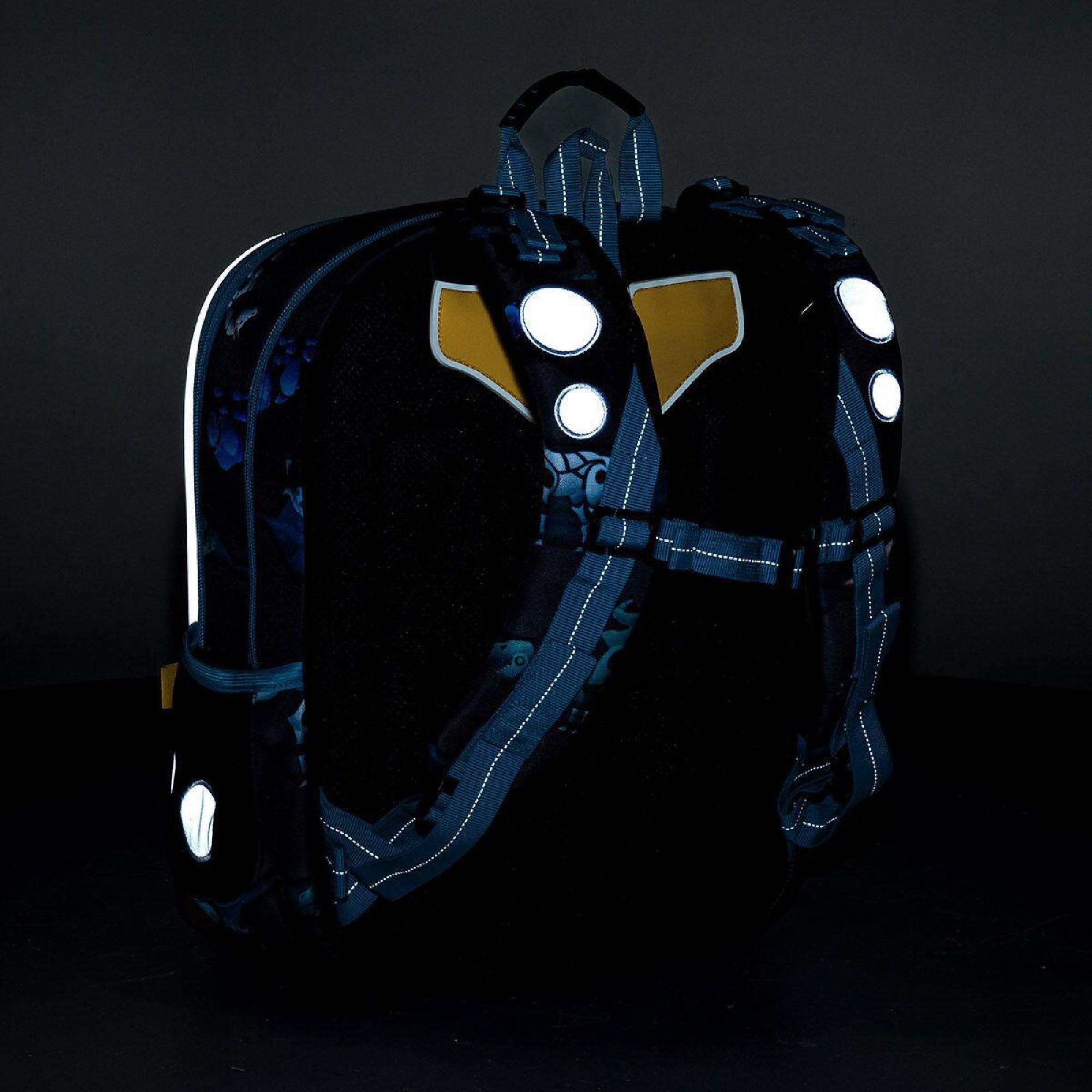 reflexní prvky: na čele a bocích batohu, na ramenních popruzích