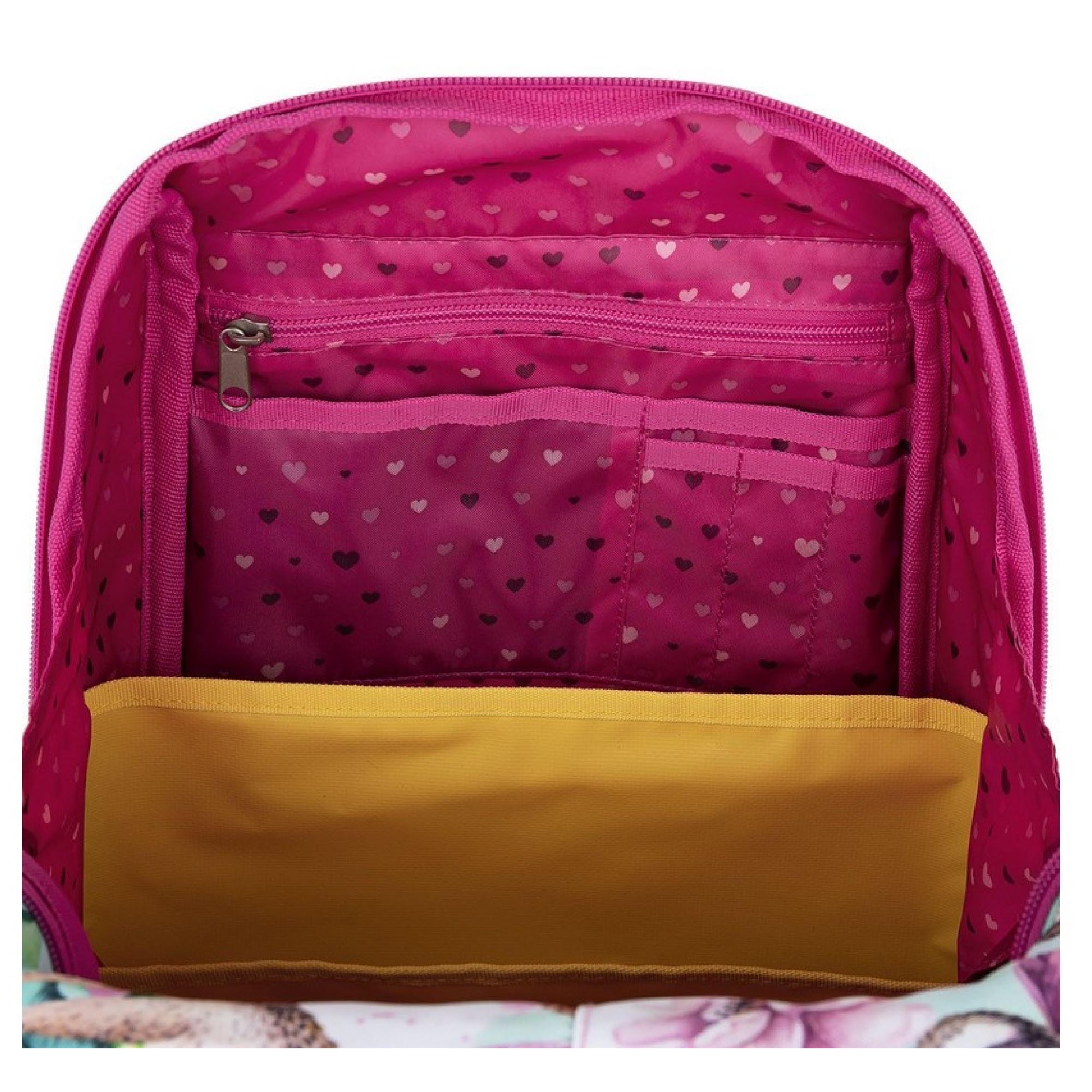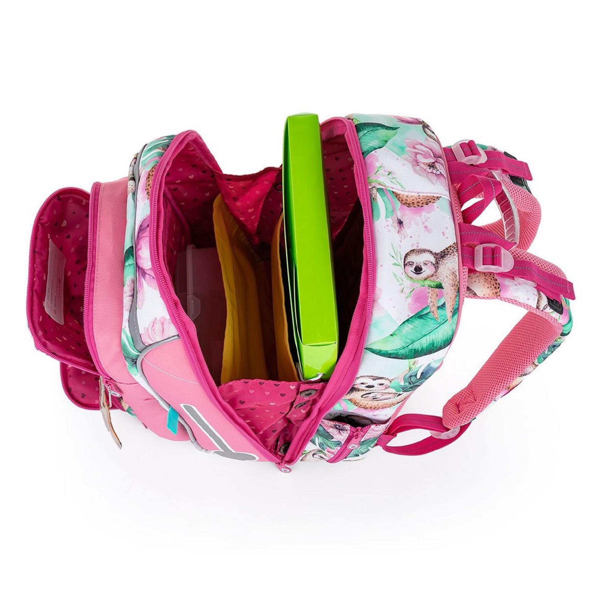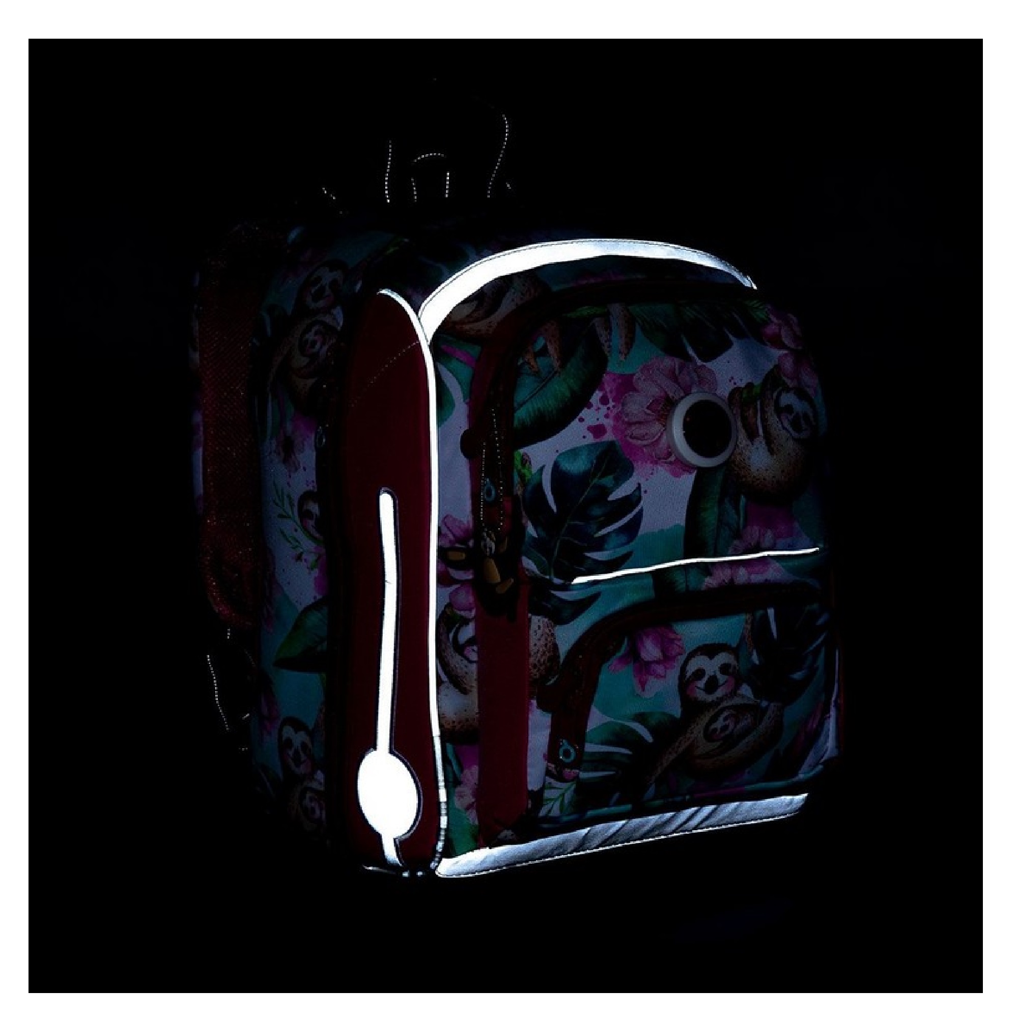 Batoh má jednu velkou komoru se žlutým nepropustným organizérem. Na přední části aktovky najdete další dvě praktické kapsy na zip s blikačkou. Ve vnitřní kapse jmenovku.