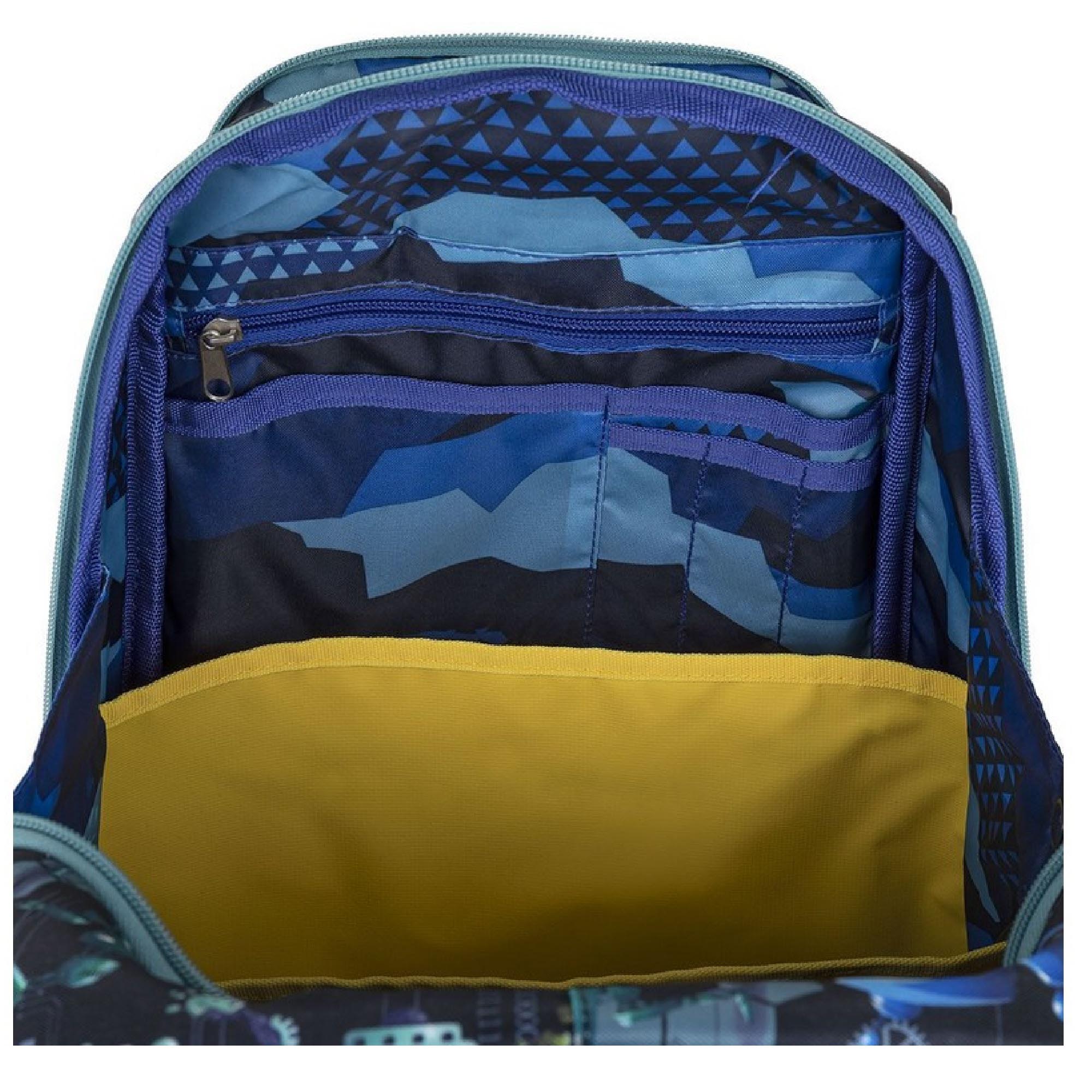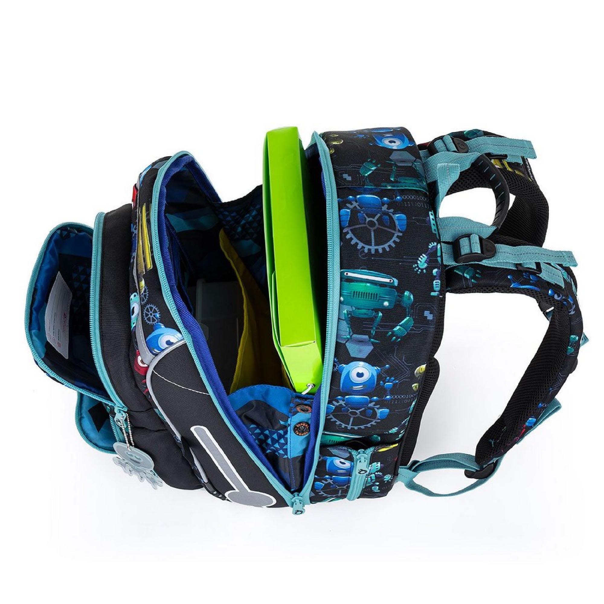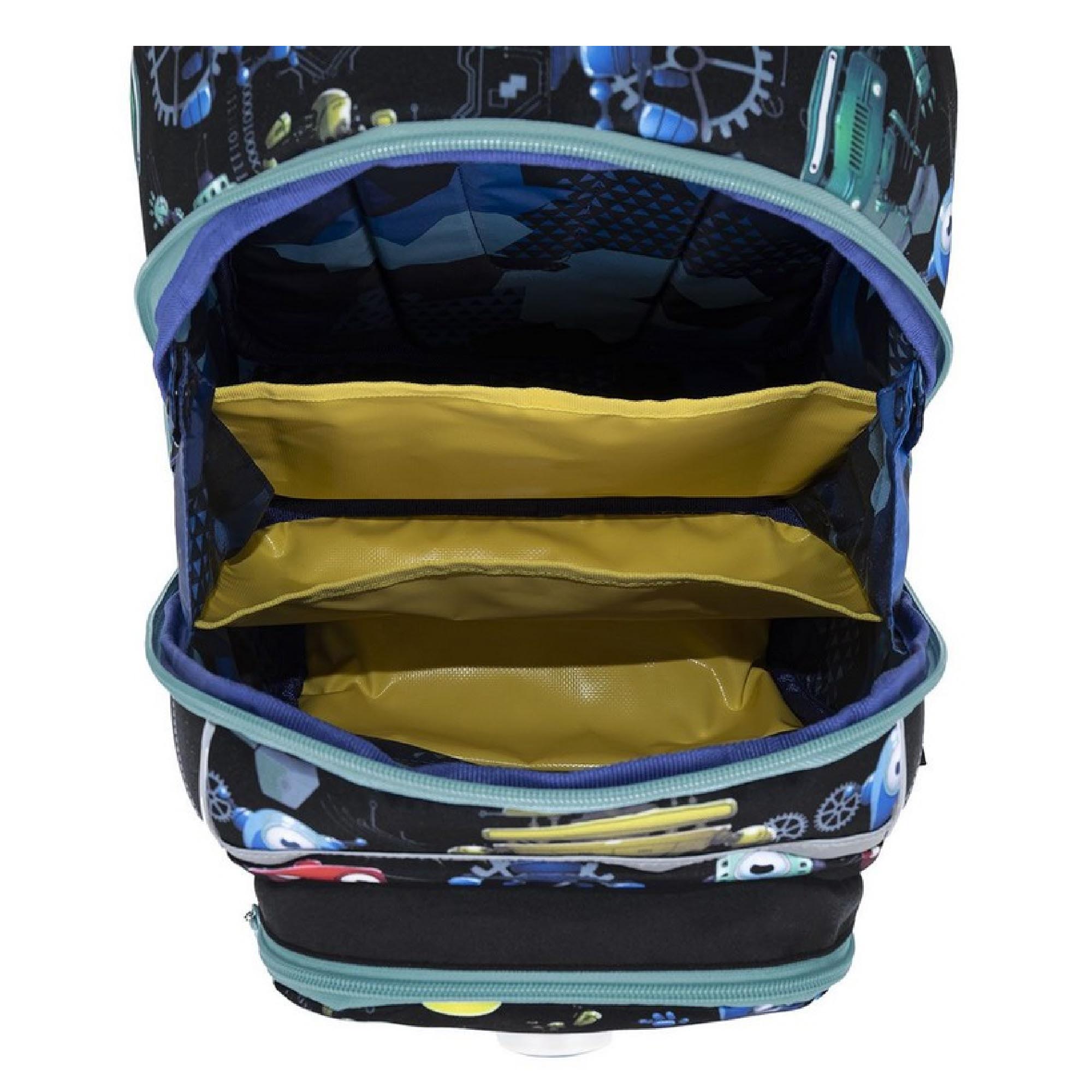 Batoh má jednu velkou komoru se žlutým nepropustným organizérem. Na přední části aktovky najdete další dvě praktické kapsy na zip s blikačkou. Ve vnitřní kapse jmenovku.