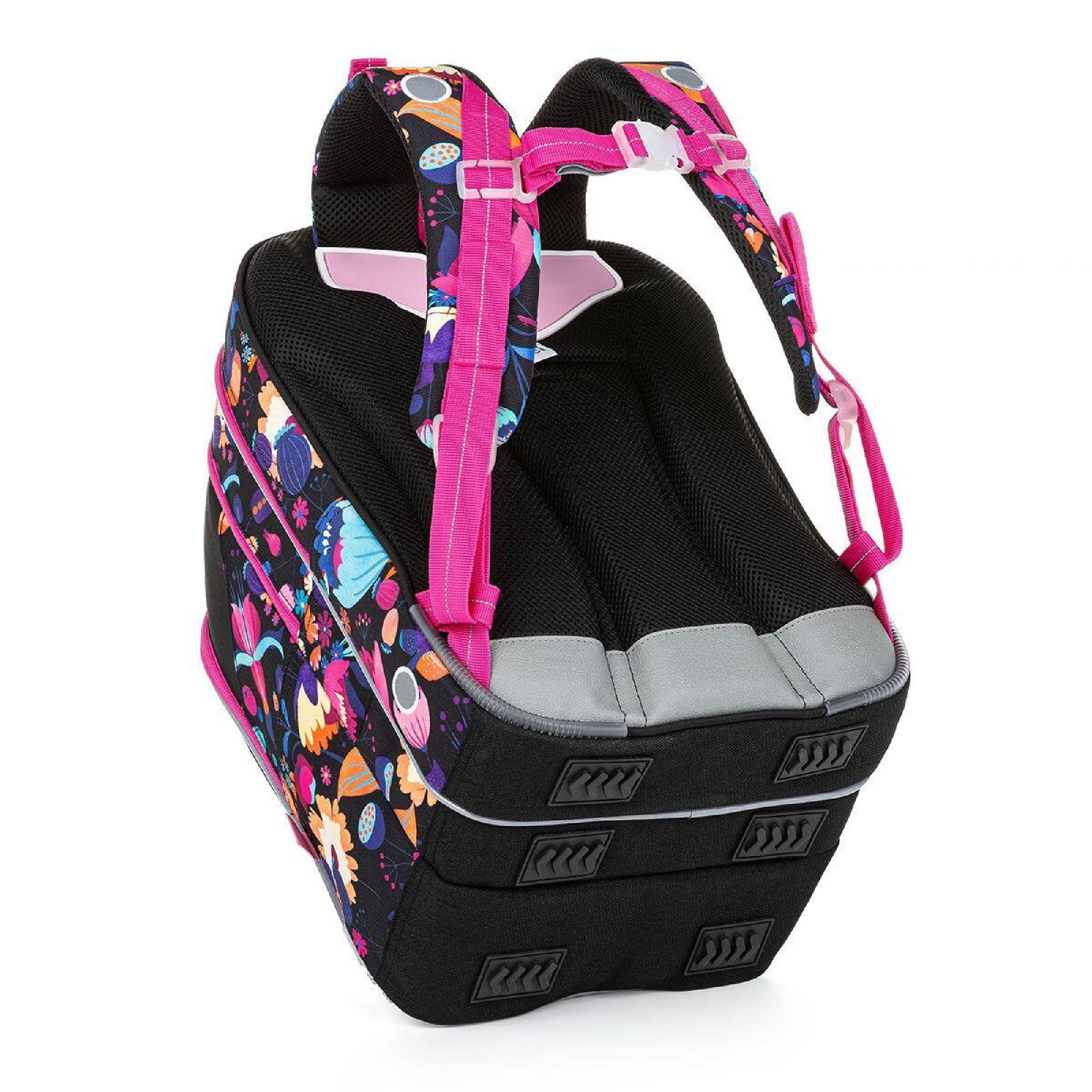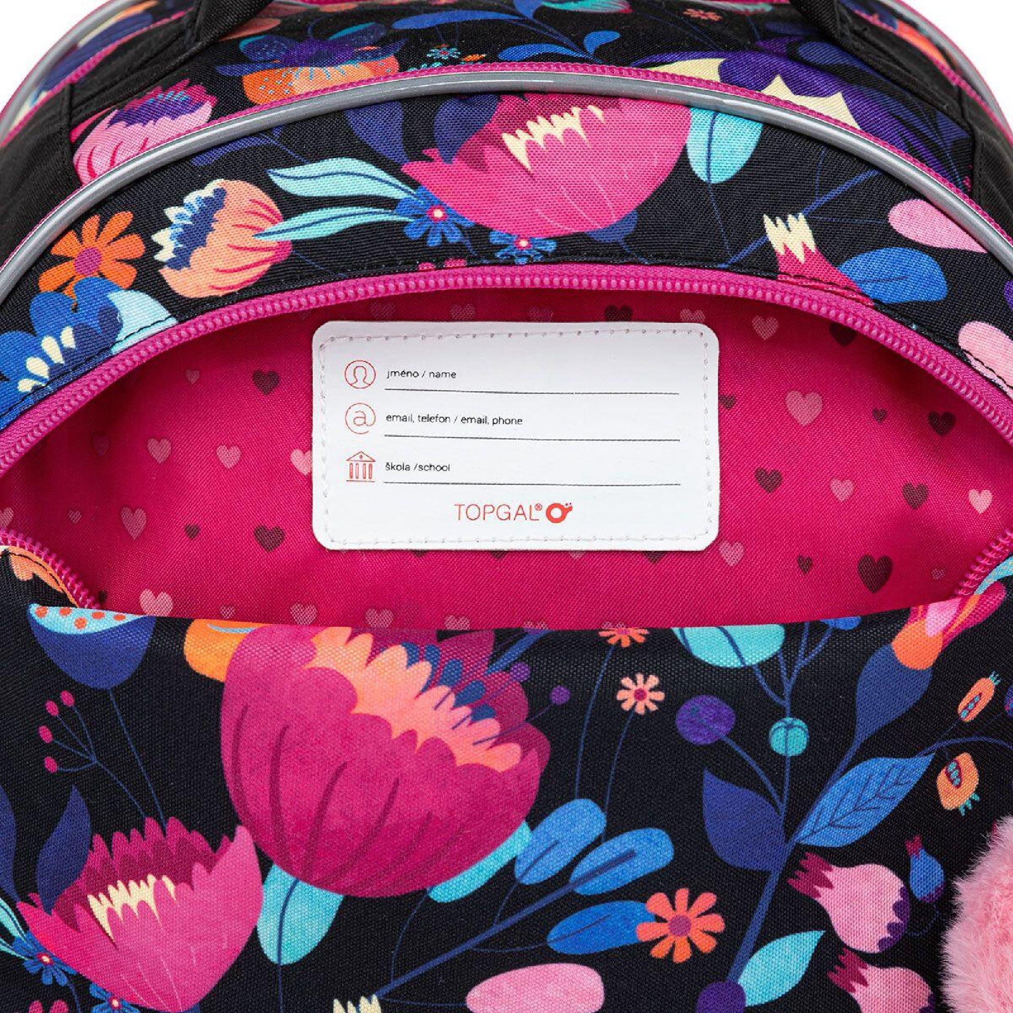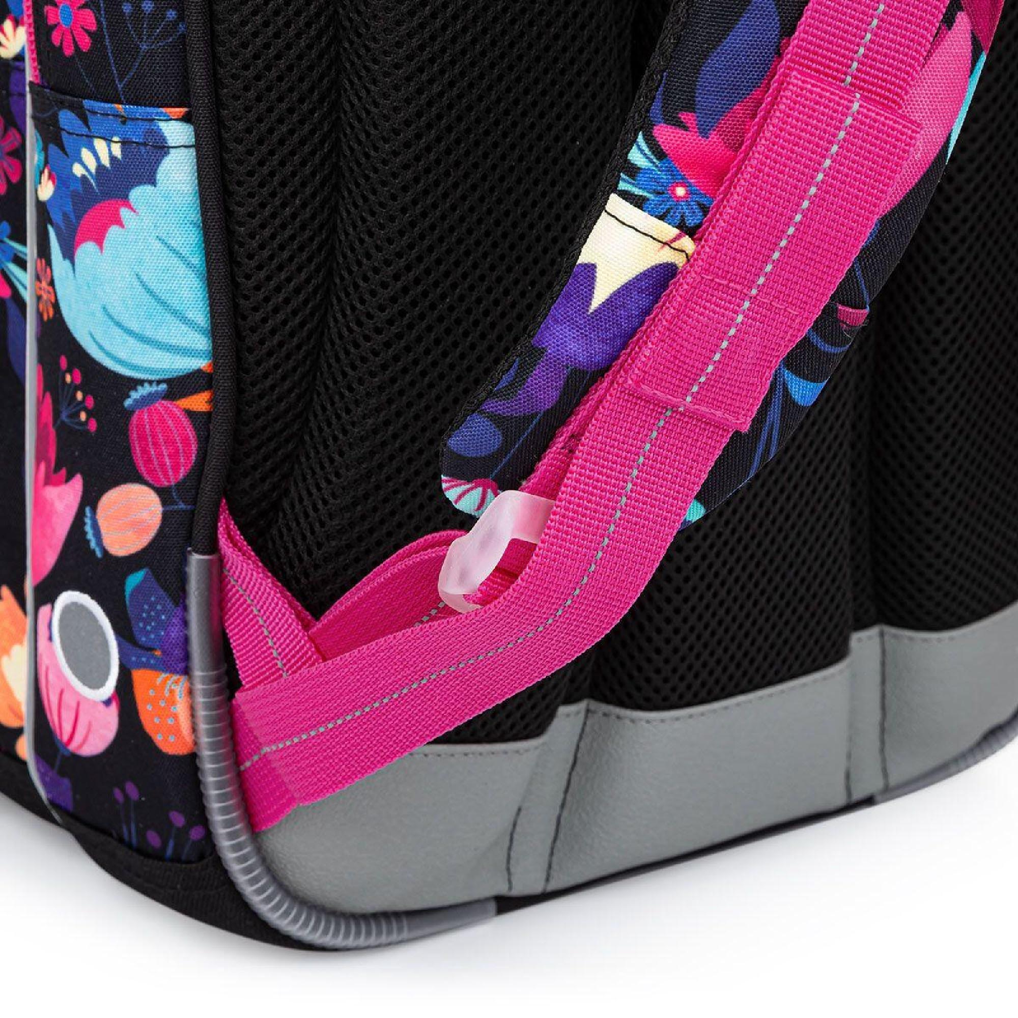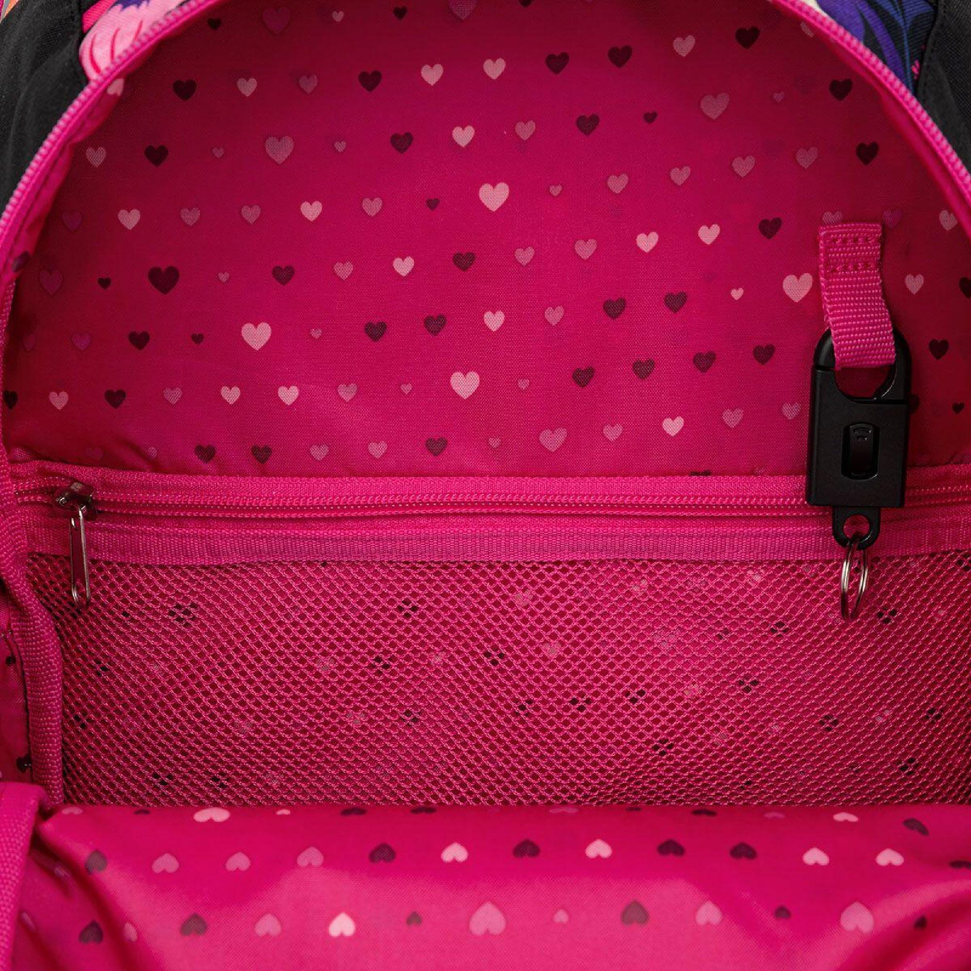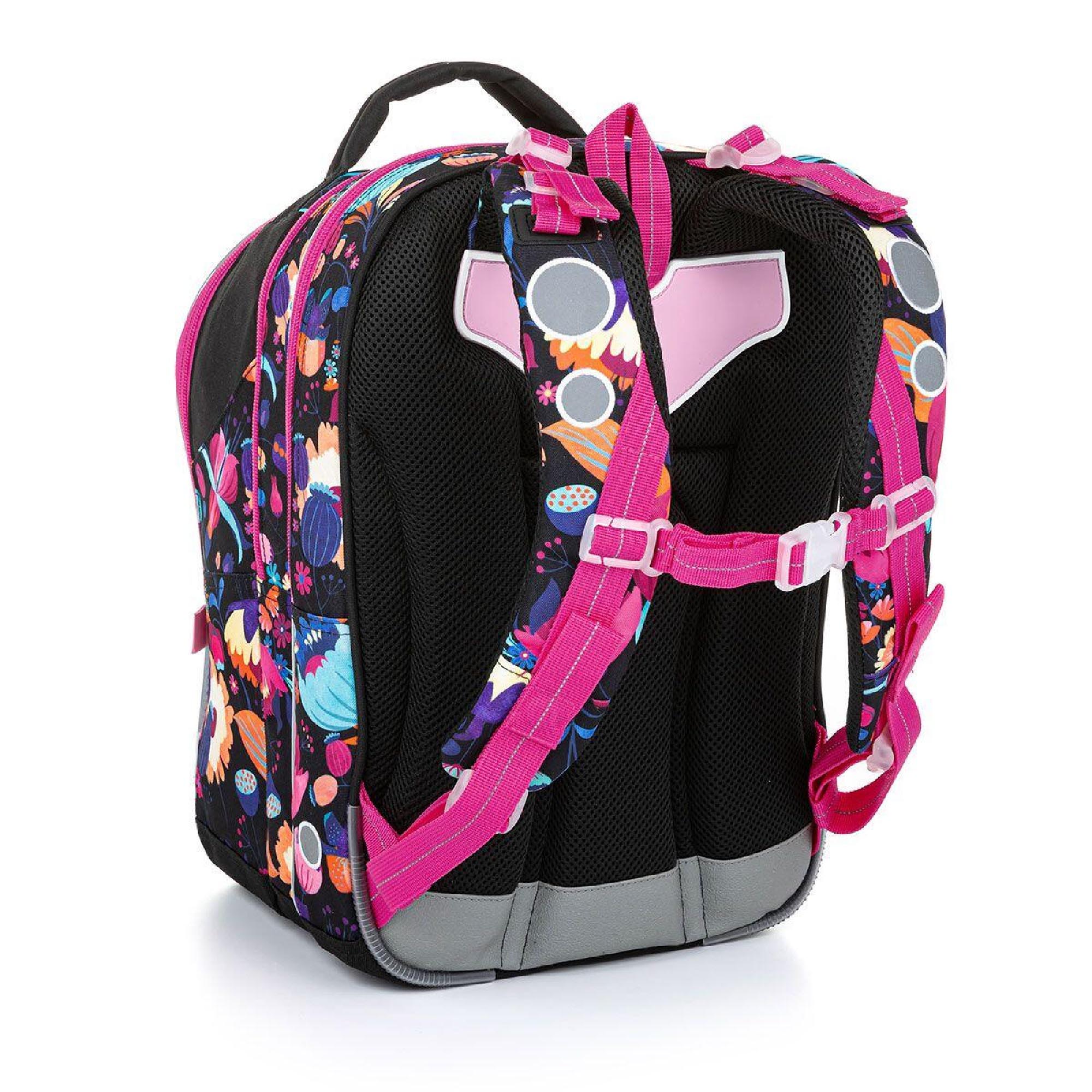 Batoh má tři objemné komory. Zadní komora je širší – doporučujeme k zádům dávat nejtěžší učebnice nebo desky na sešity. Přední komora je o něco užší a je v ní umístěna ještě malá síťová kapsa na zip a jmenovka.