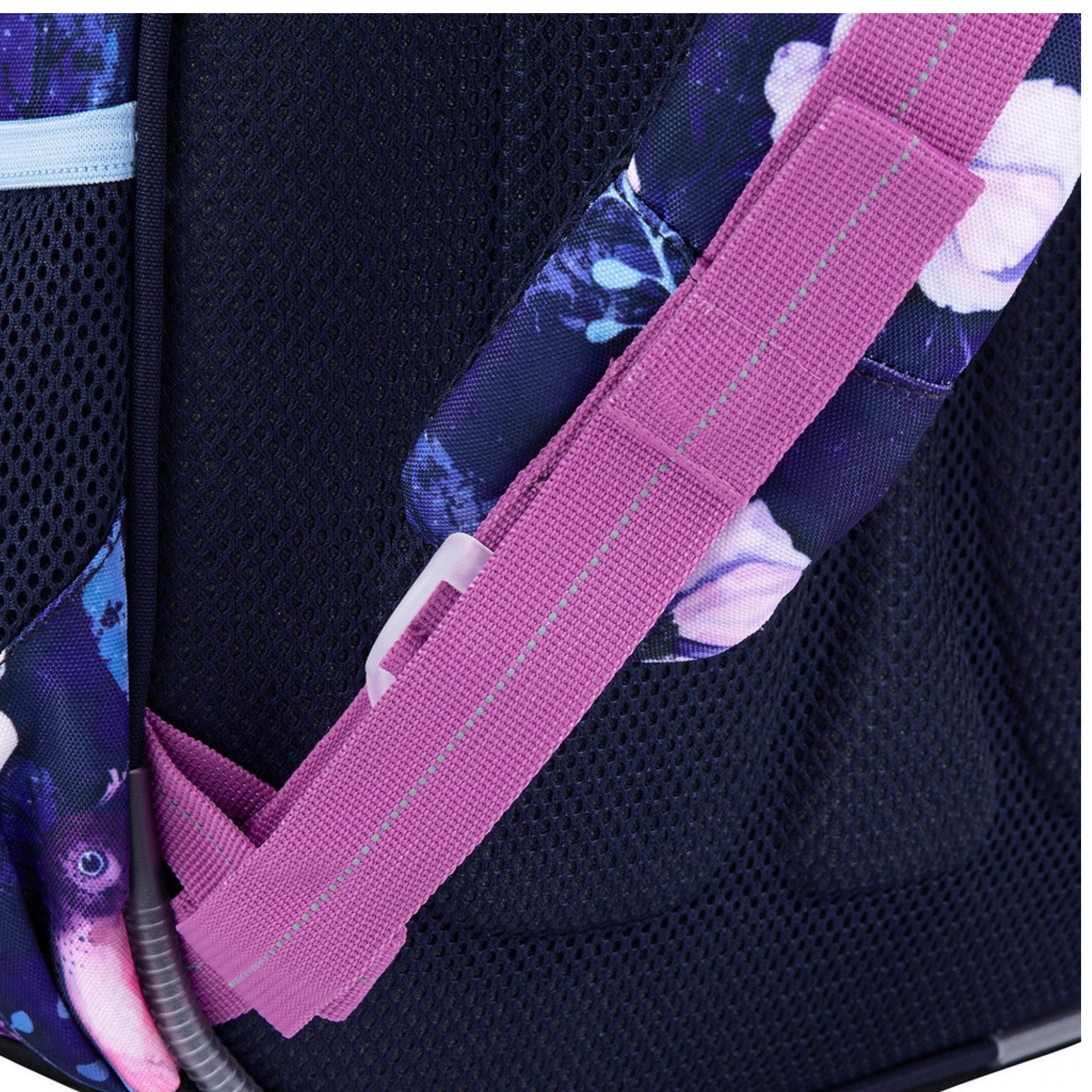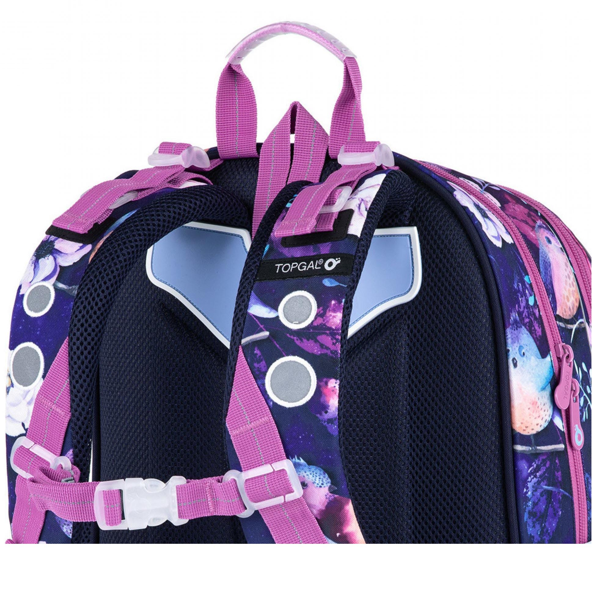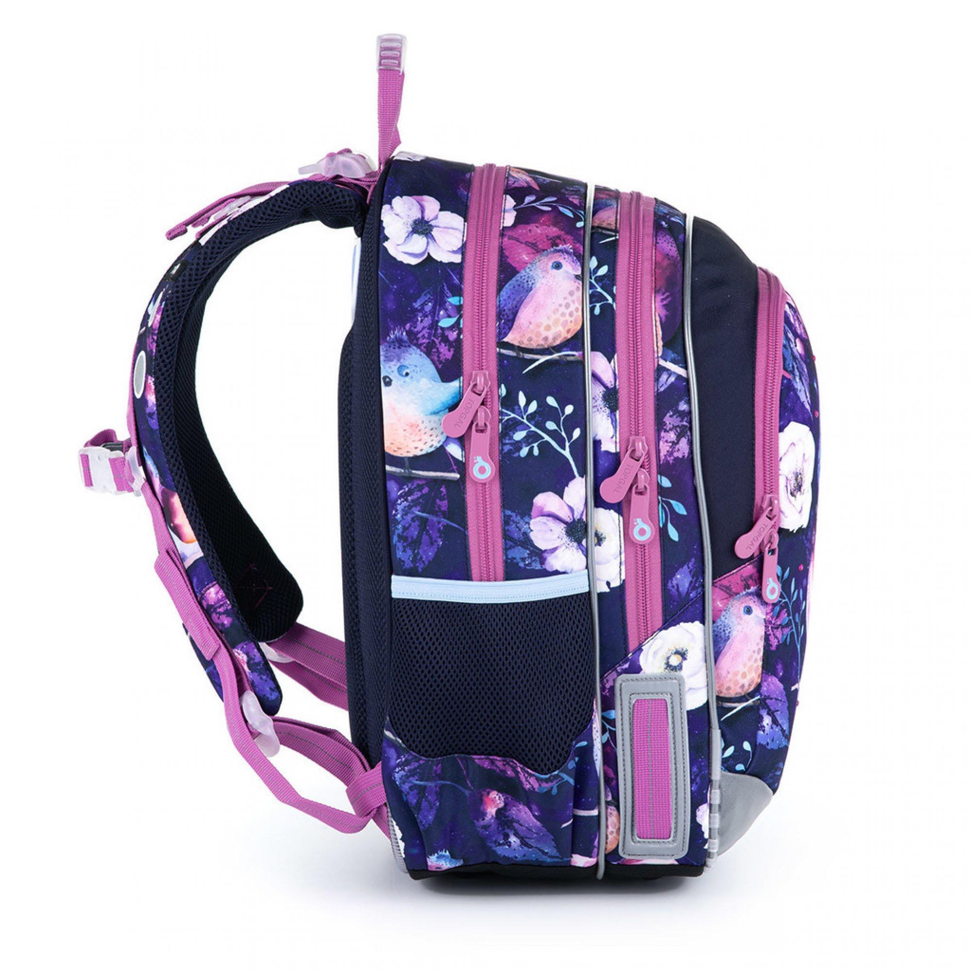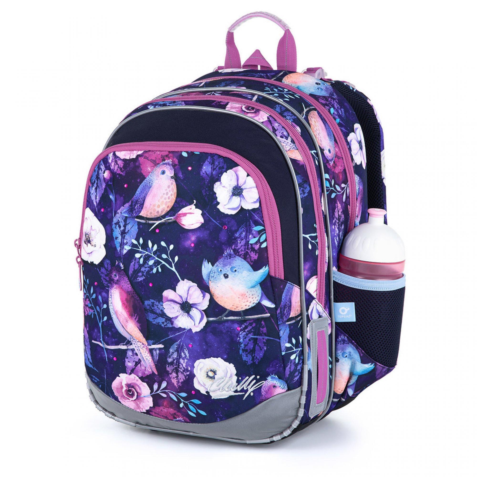 Lehoučký dvoukomorový batoh pro dívky na prvním stupni s motivem ptáčků, kytiček a s fialovými třpytkami.