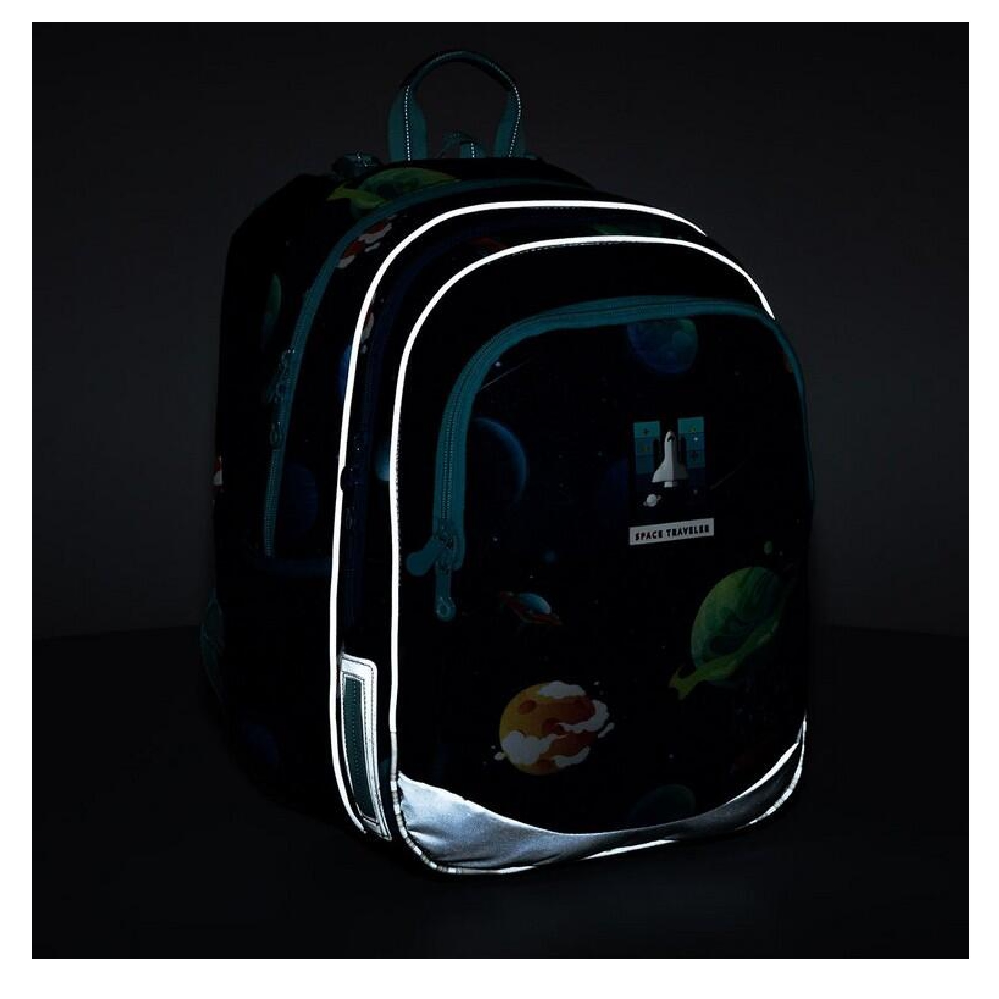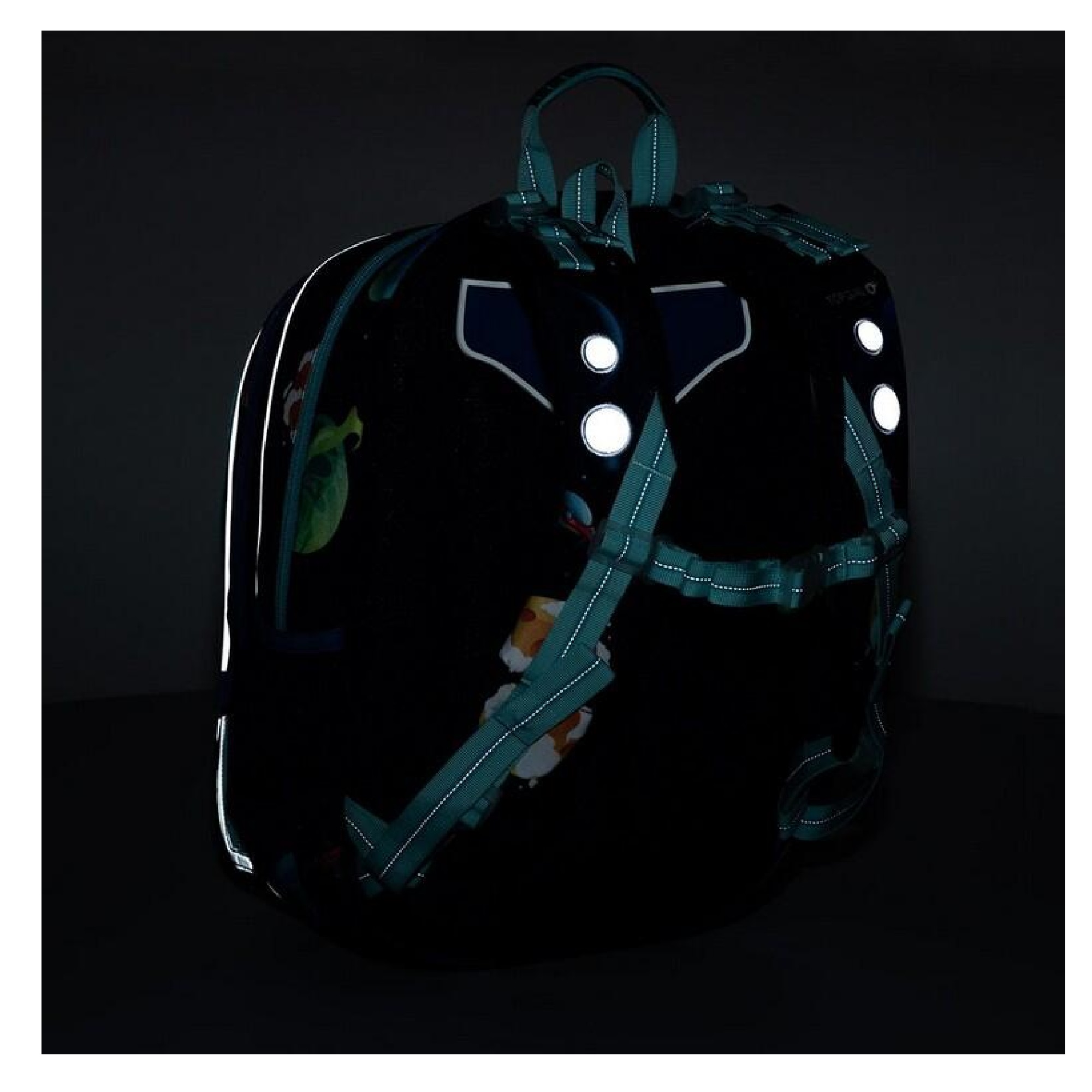 spousta reflexních prvků na všech stranách batohu