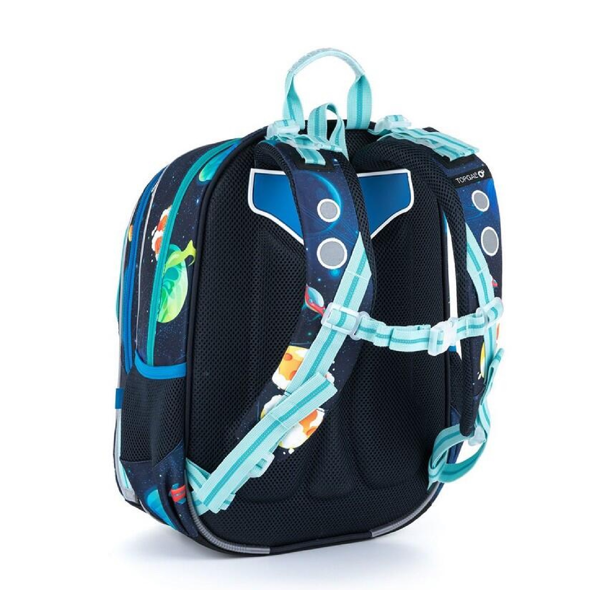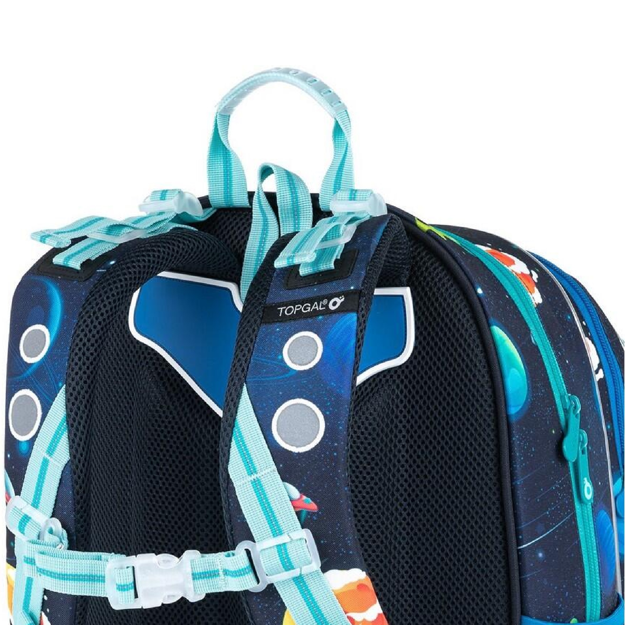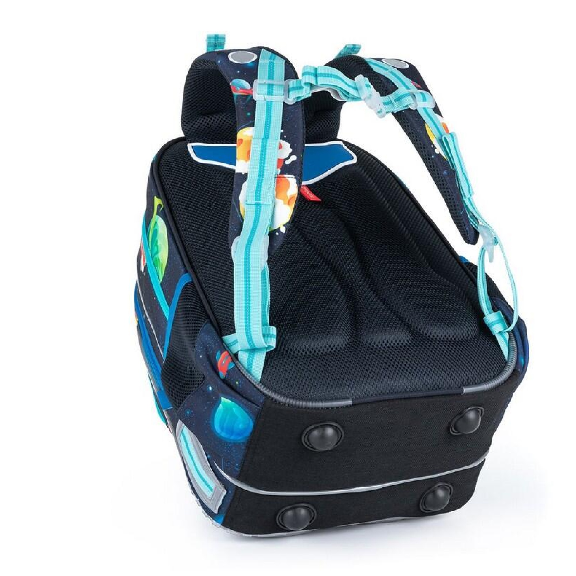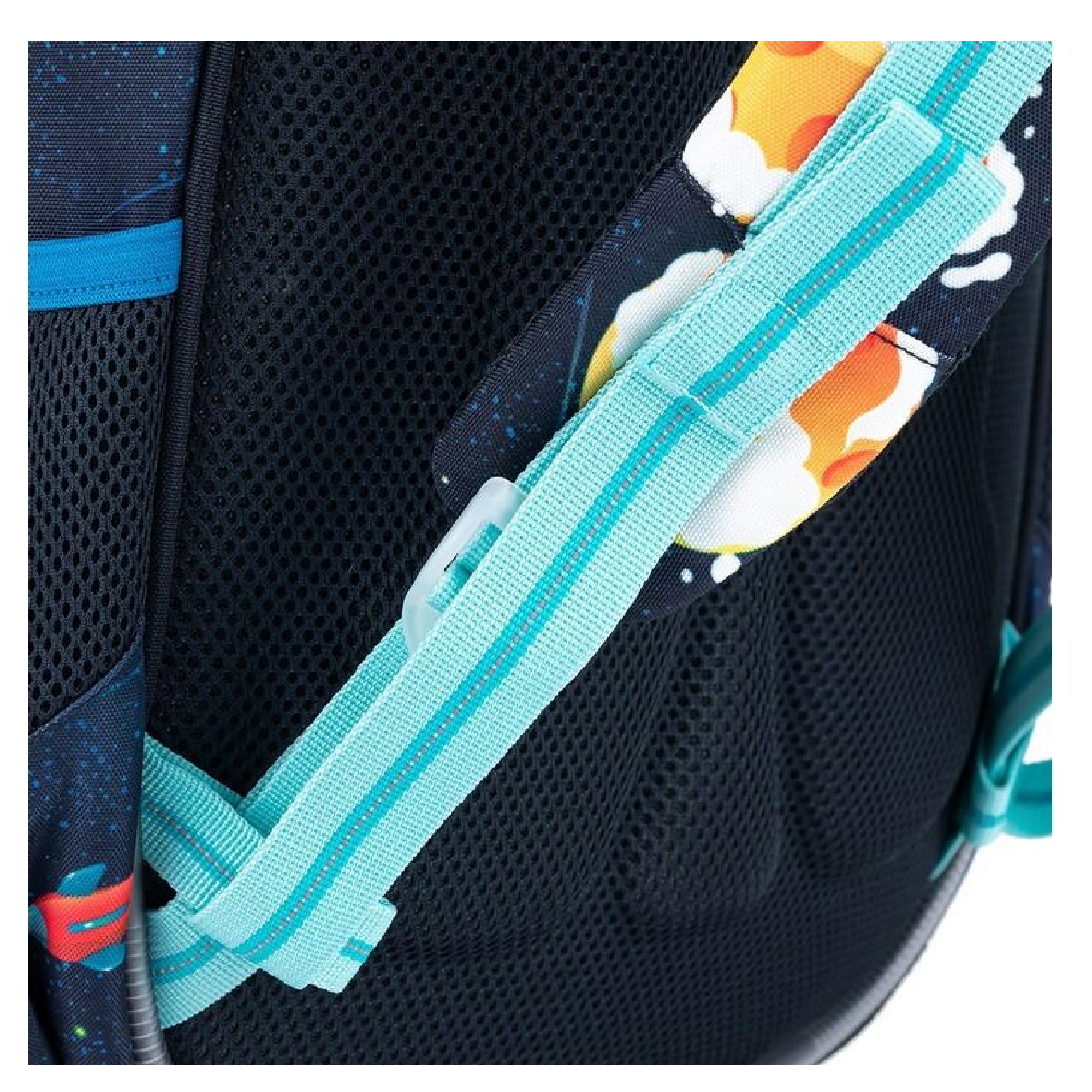 Záda batohu jsou tvořena z lehké tvarované pěny. Díky ergonomicky tvarovaným polstrovaným popruhům bude batoh pohodlně nosit i těžký náklad. Popruhy na záda školáčkovi nejdříve utáhněte ve spodní části na délku tak, aby batoh seděl na kosti křížové.