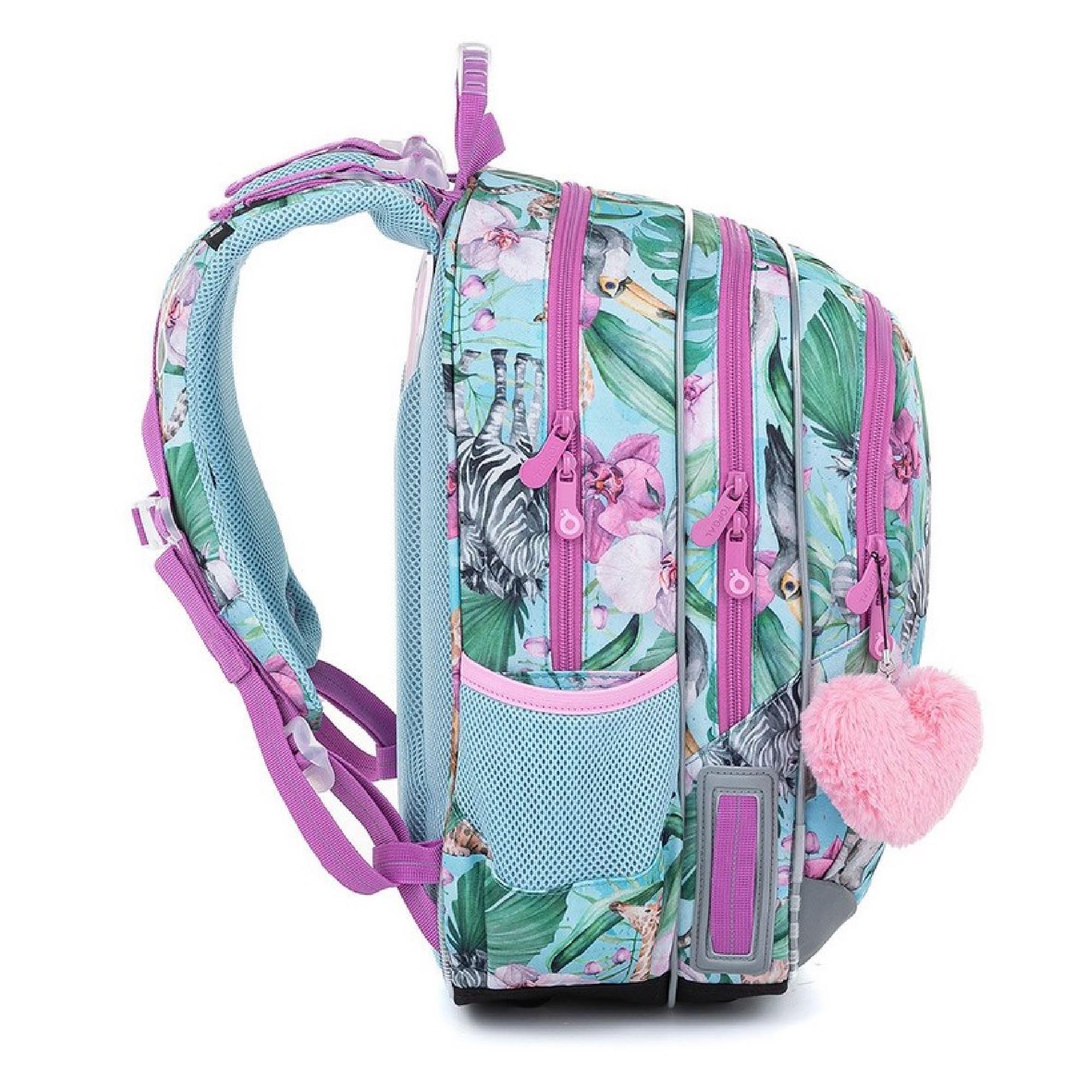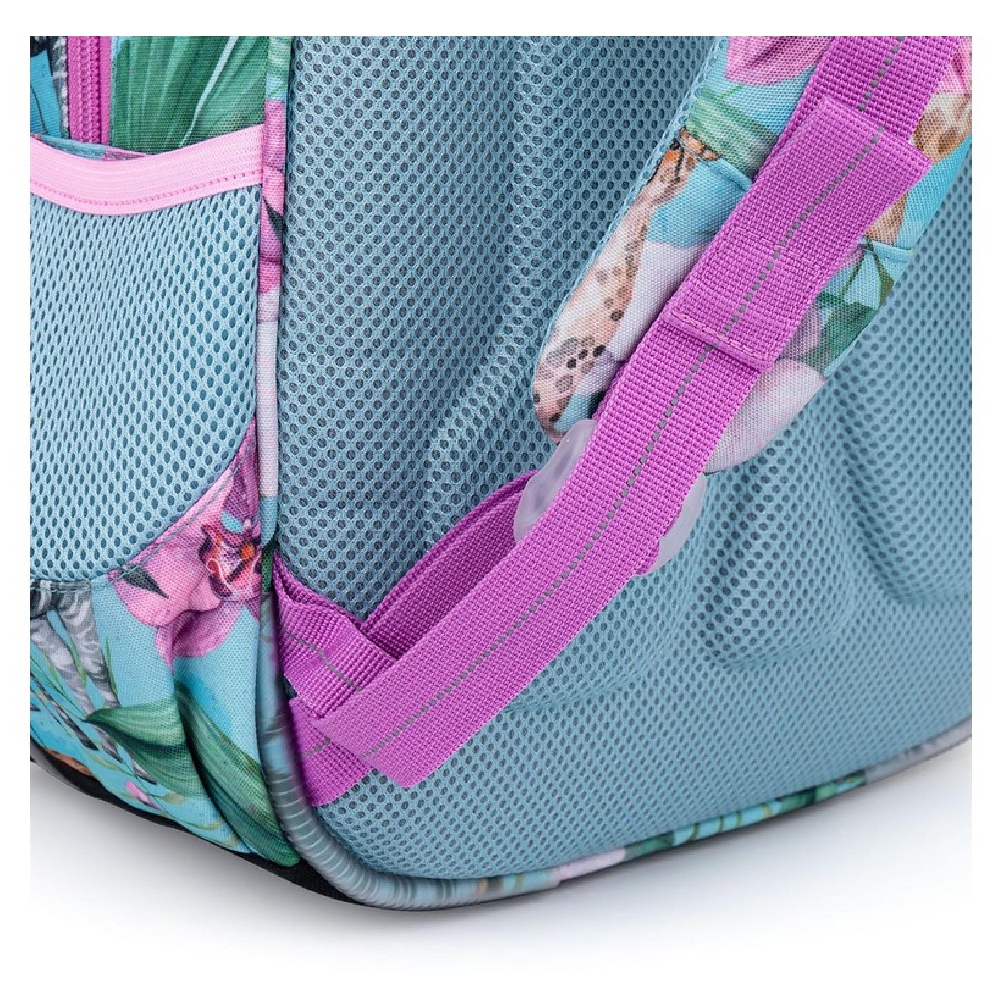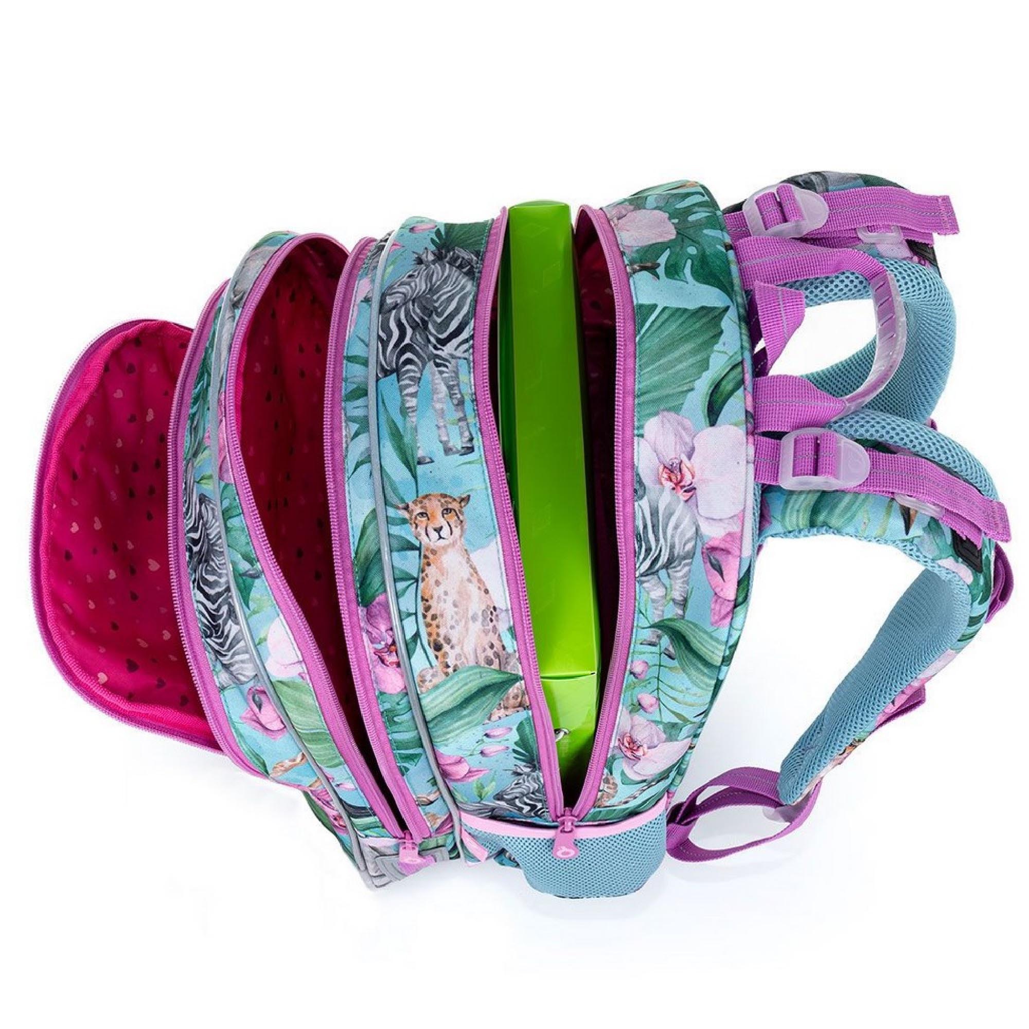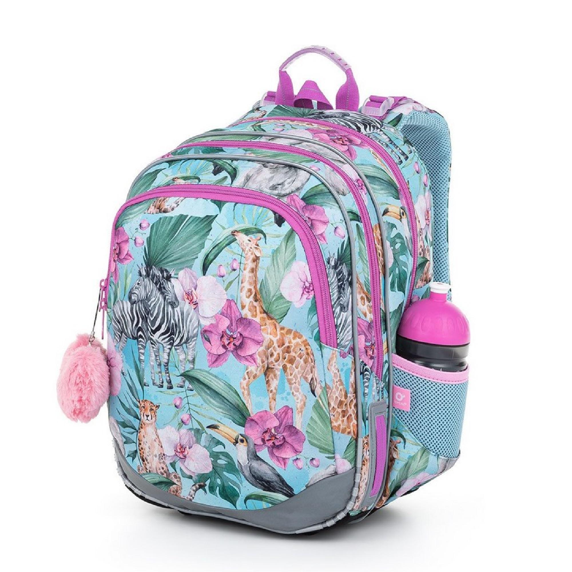 Model ELLY neváží ani kilogram, proto je ideální pro holčičky od první až do čtvrté třídy ZŠ. Rozkvetlé Safari plné žiraf, zeber, gepardů a tukanů navštívila také plyšová panda.