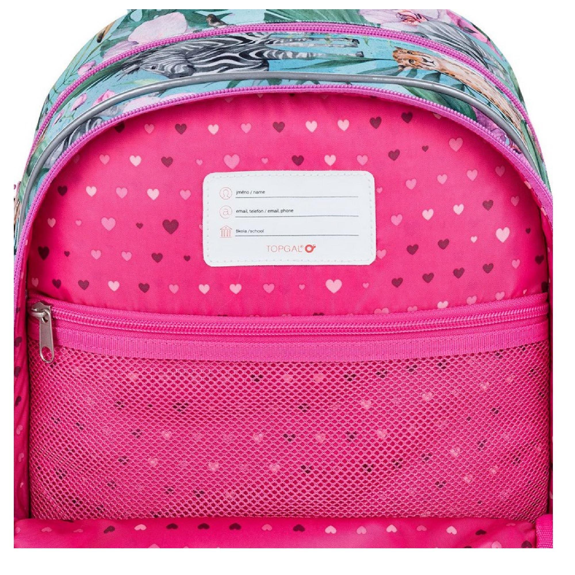 Batoh má dvě objemné hlavní komory. Zadní komora je objemnější a spolehlivě pojme všechno učení. Přední komora je o něco užší a je v ní umístěna ještě malá síťová kapsa na zip a jmenovka. Přední hluboká kapsa pojme např. penál PENN 23004 ve stejném designu nebo krabičku na svačinku. Do bočních kapes se vejdou lahvičky o objemu 0,5 litru, např. naše ZIVA.
