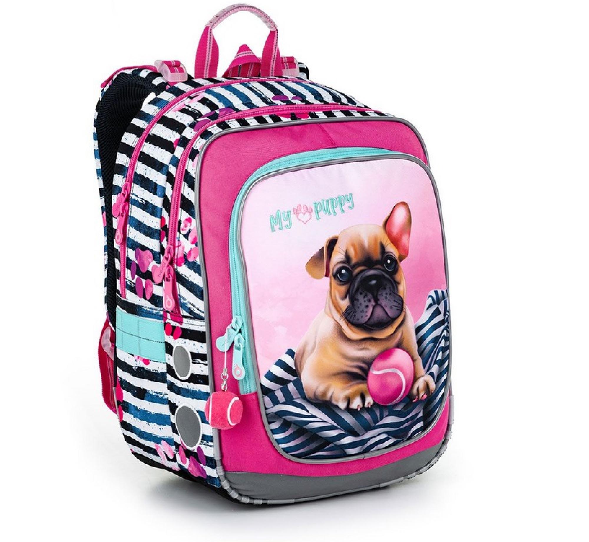 Pejsci jsou naše stálice. Letos jsme na oblíbený střih ENDY nakreslili obrázek francouzského buldočka s růžovým tenisákem, který najdete i jako přívěsek na zipu. Batoh ENDY je klasika do 1. – 3. třídy ZŠ; jeho hlavní výhodou je lehká váha.