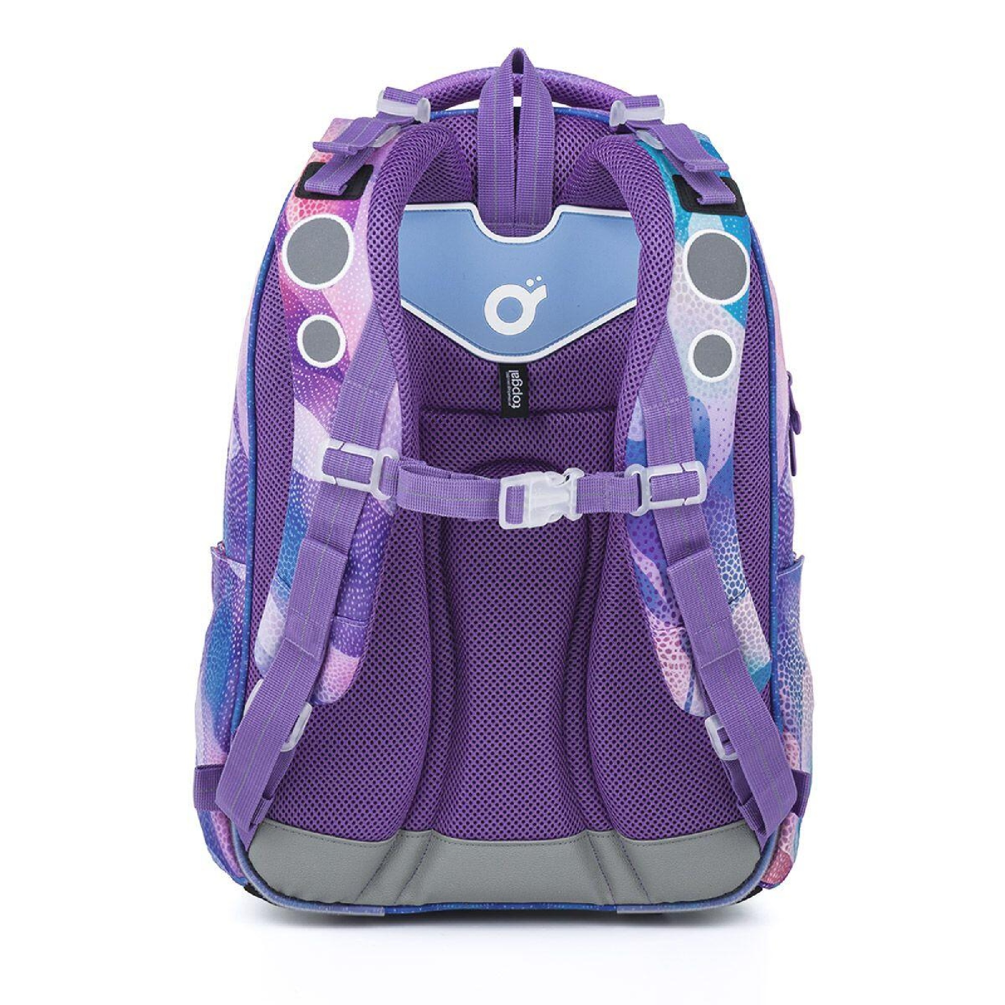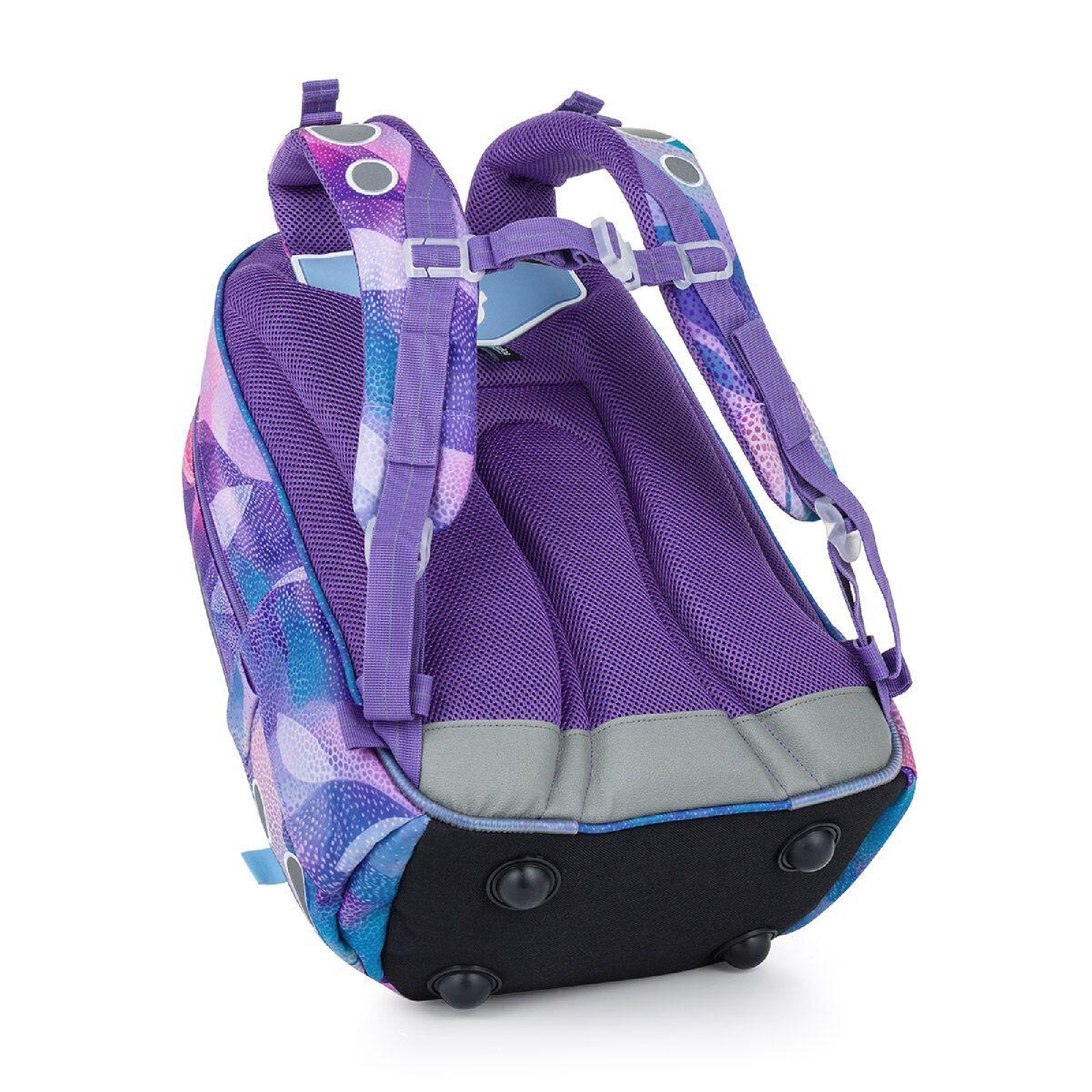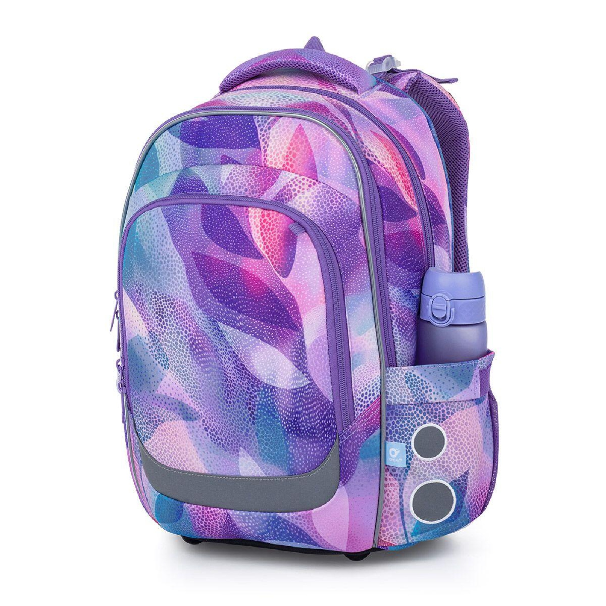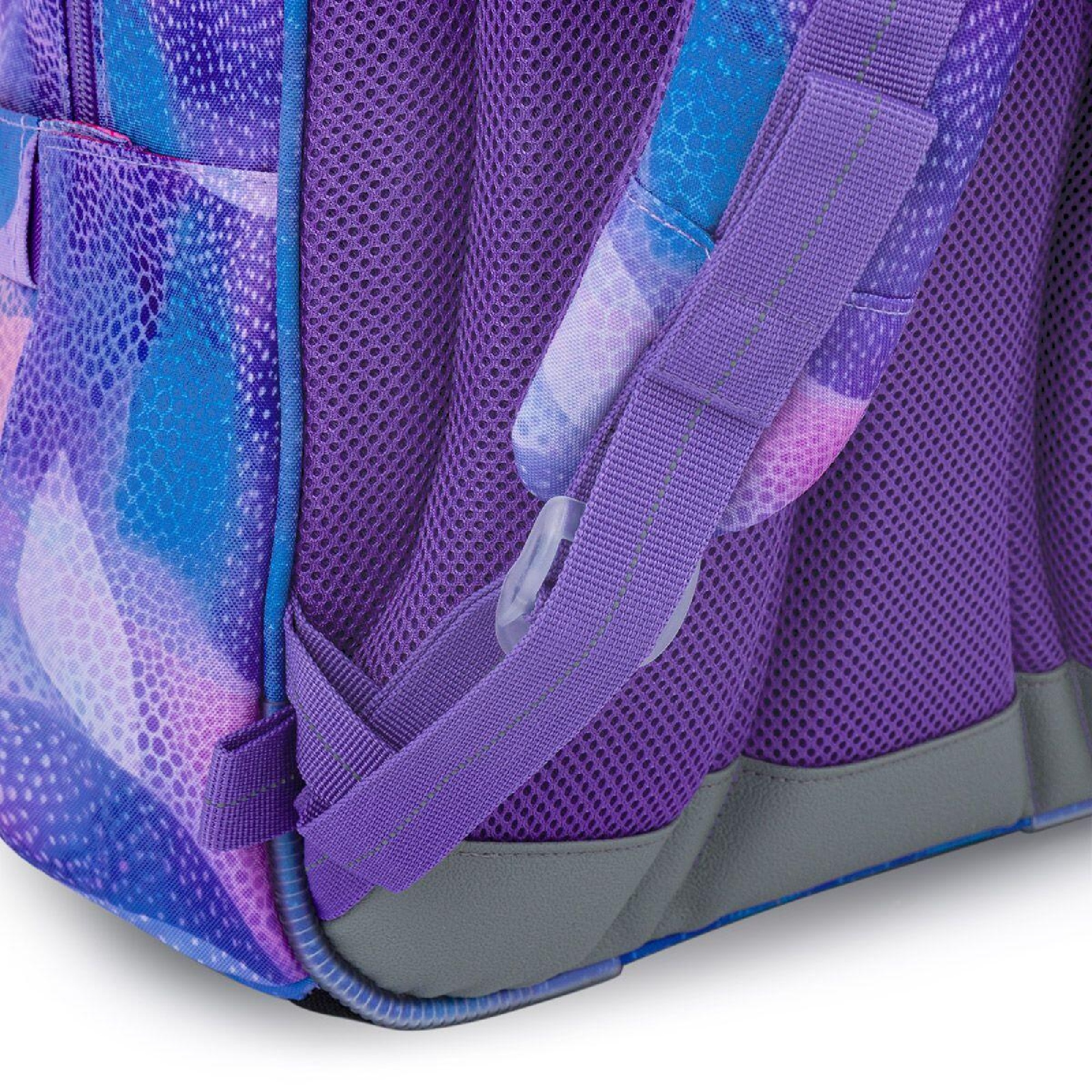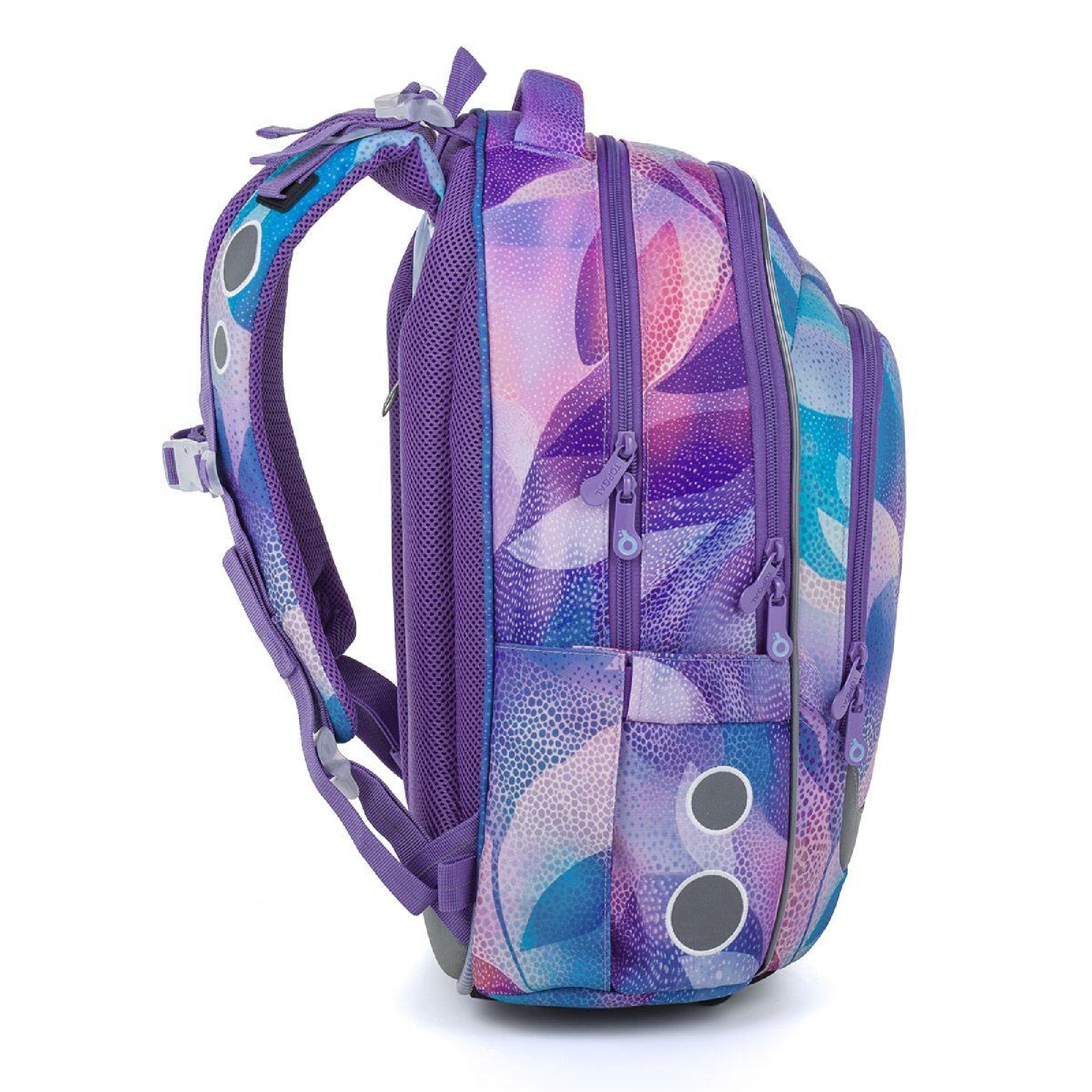 Školní batoh LORI 26009 je navržený pro školačky od 125 cm a díky svému objemu i konstrukci bez problémů vydrží až do 6. třídy. Pastelový abstraktní motiv v odstínech fialové, růžové a tyrkysové působí jemně, ale zároveň originálně – batoh tak skvěle doplní školní i volnočasový styl.