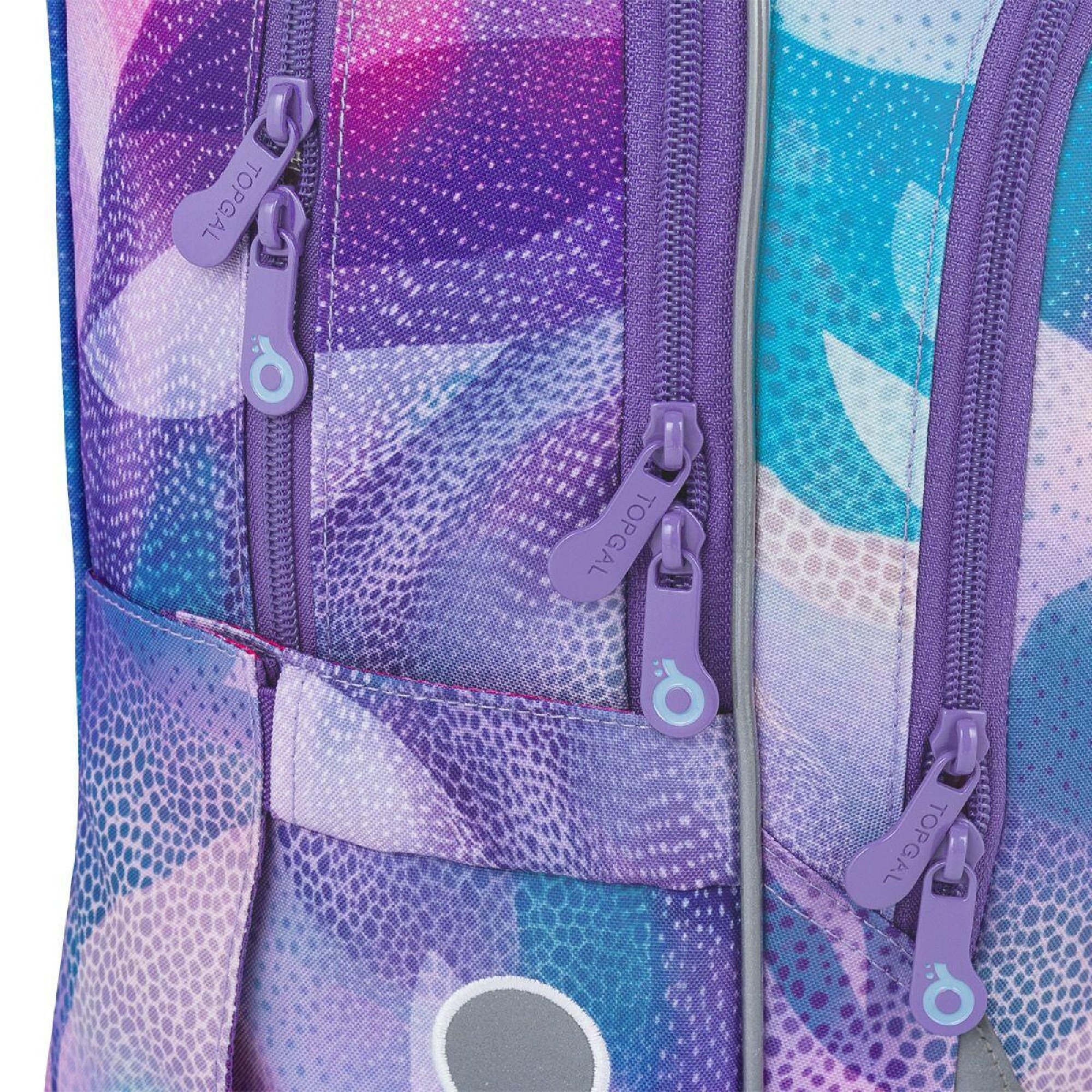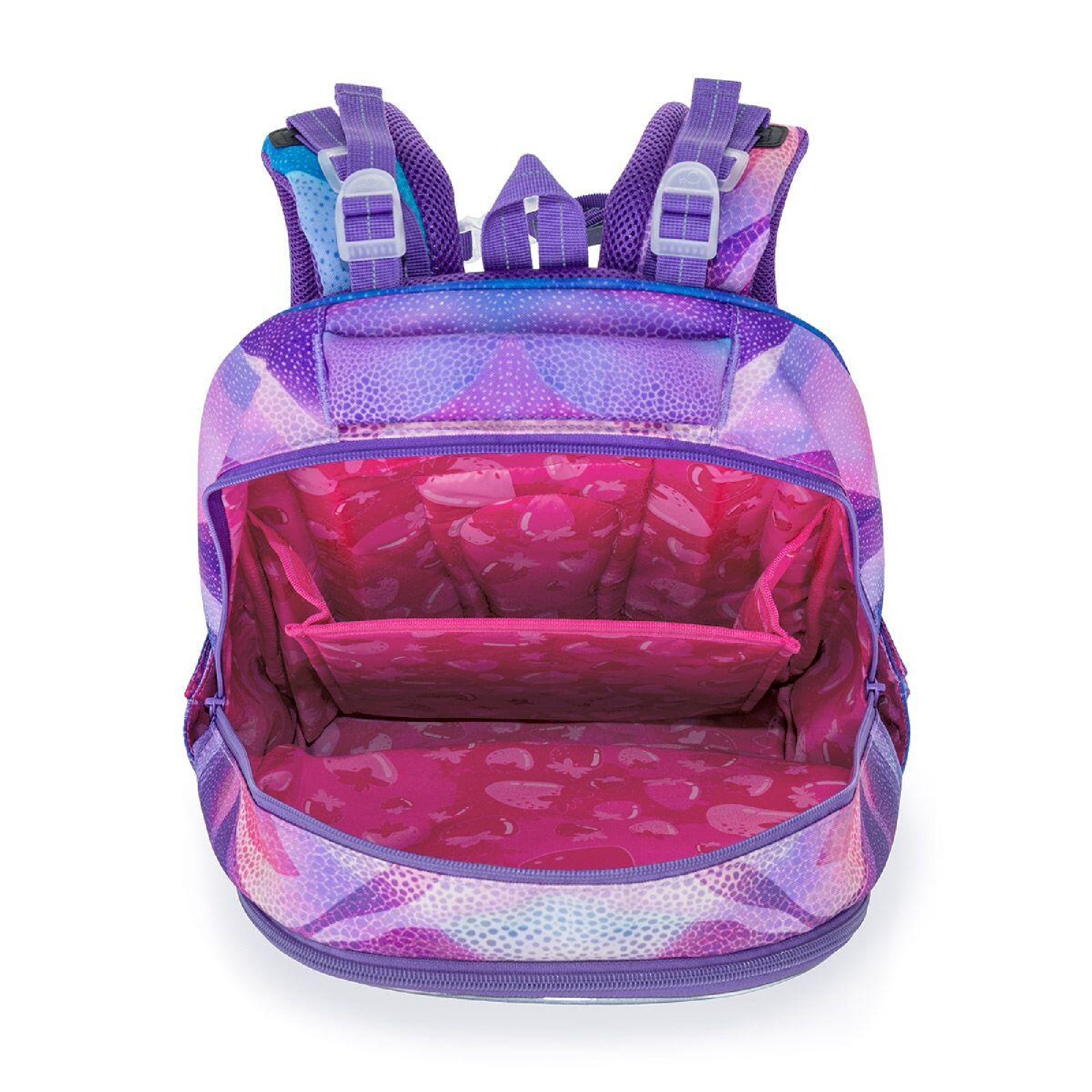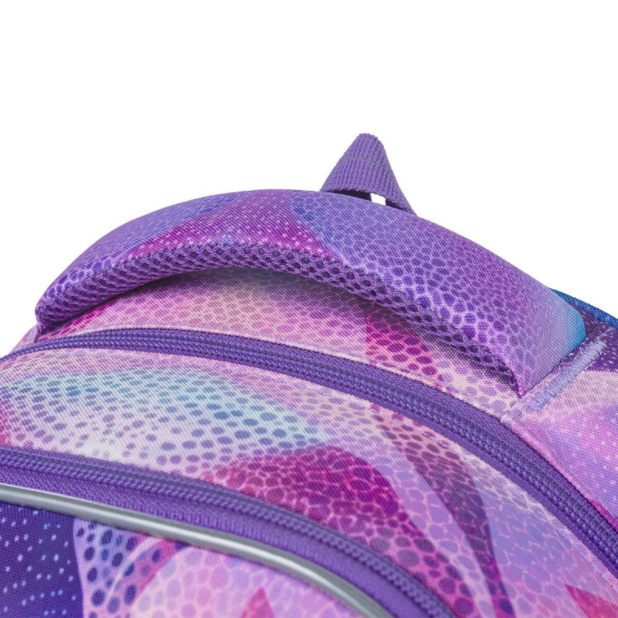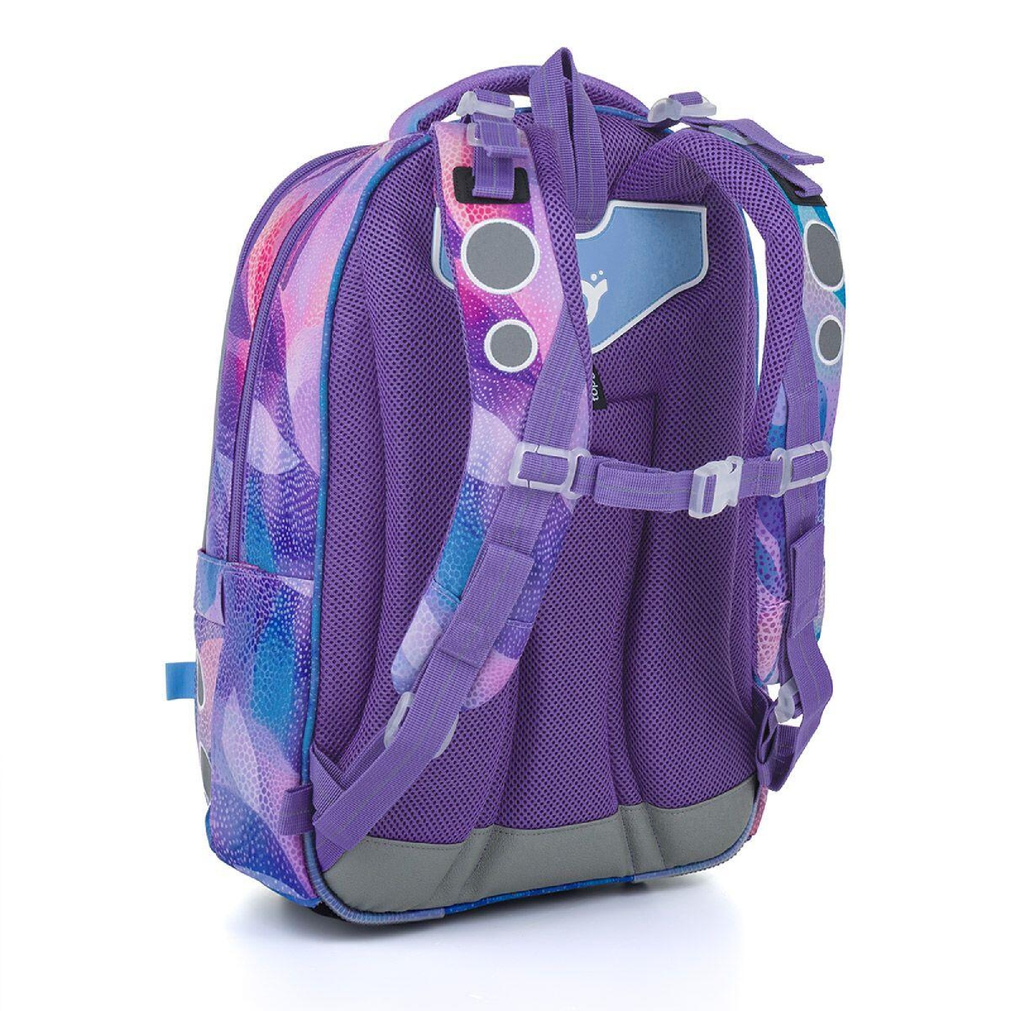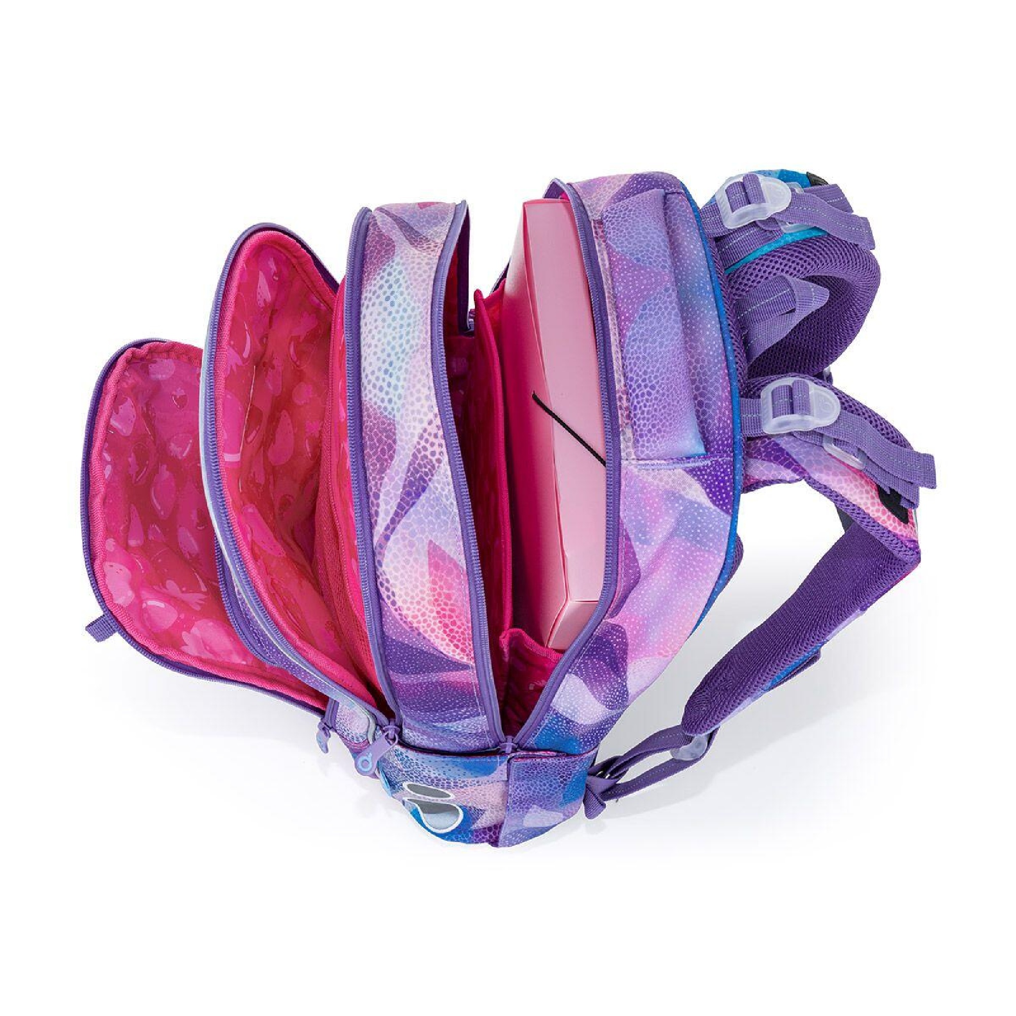 Školní batoh LORI 26009 je navržený pro školačky od 125 cm a díky svému objemu i konstrukci bez problémů vydrží až do 6. třídy. Pastelový abstraktní motiv v odstínech fialové, růžové a tyrkysové působí jemně, ale zároveň originálně – batoh tak skvěle doplní školní i volnočasový styl.