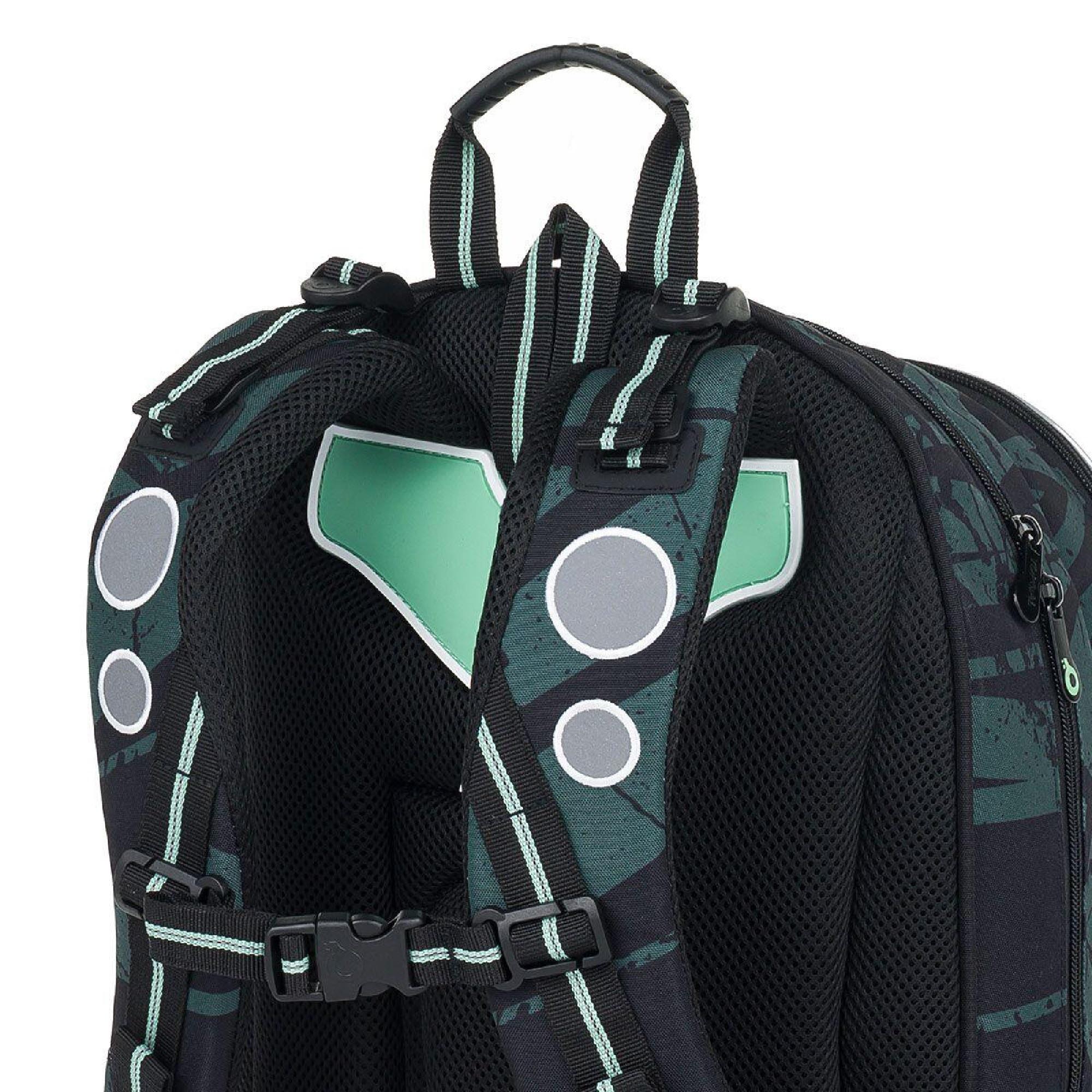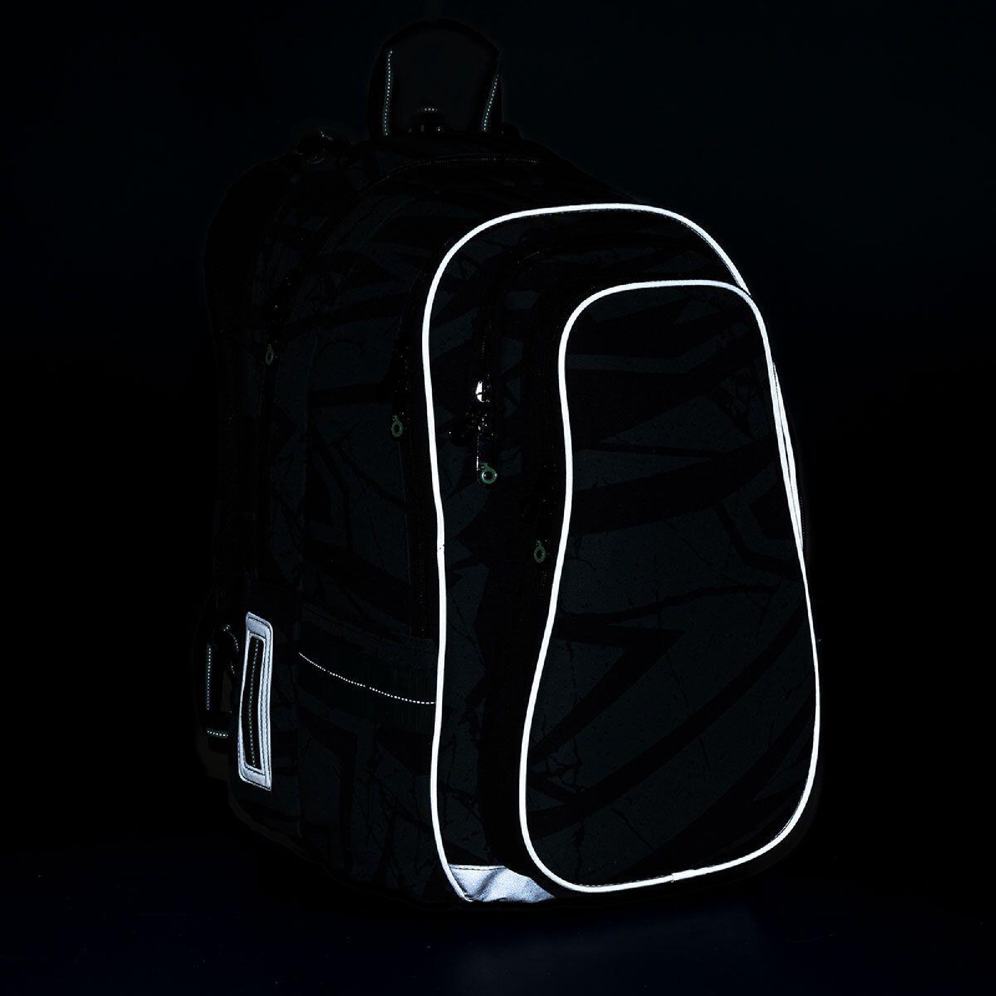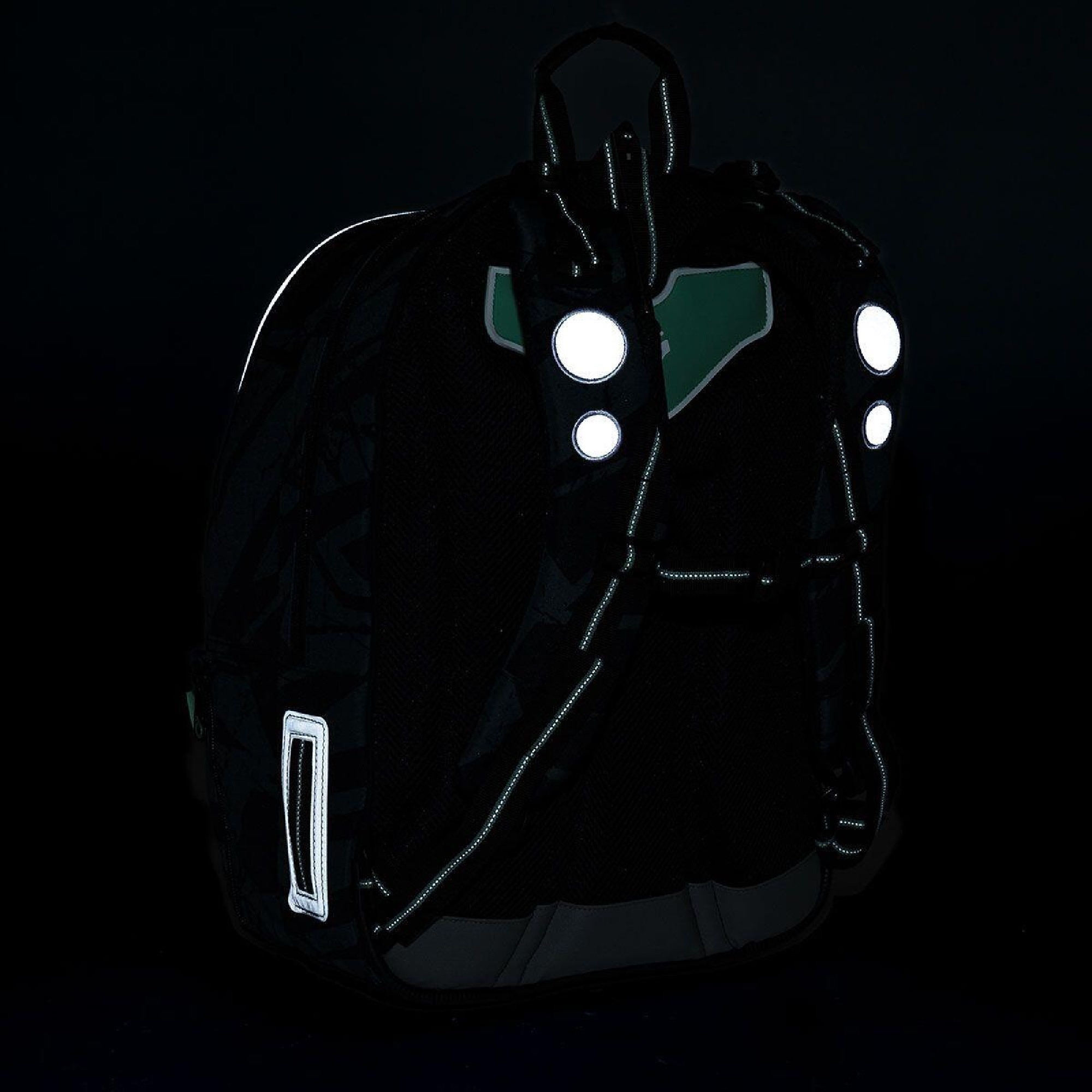 reflexní prvky: na čele a bocích batohu, na ramenních popruzích