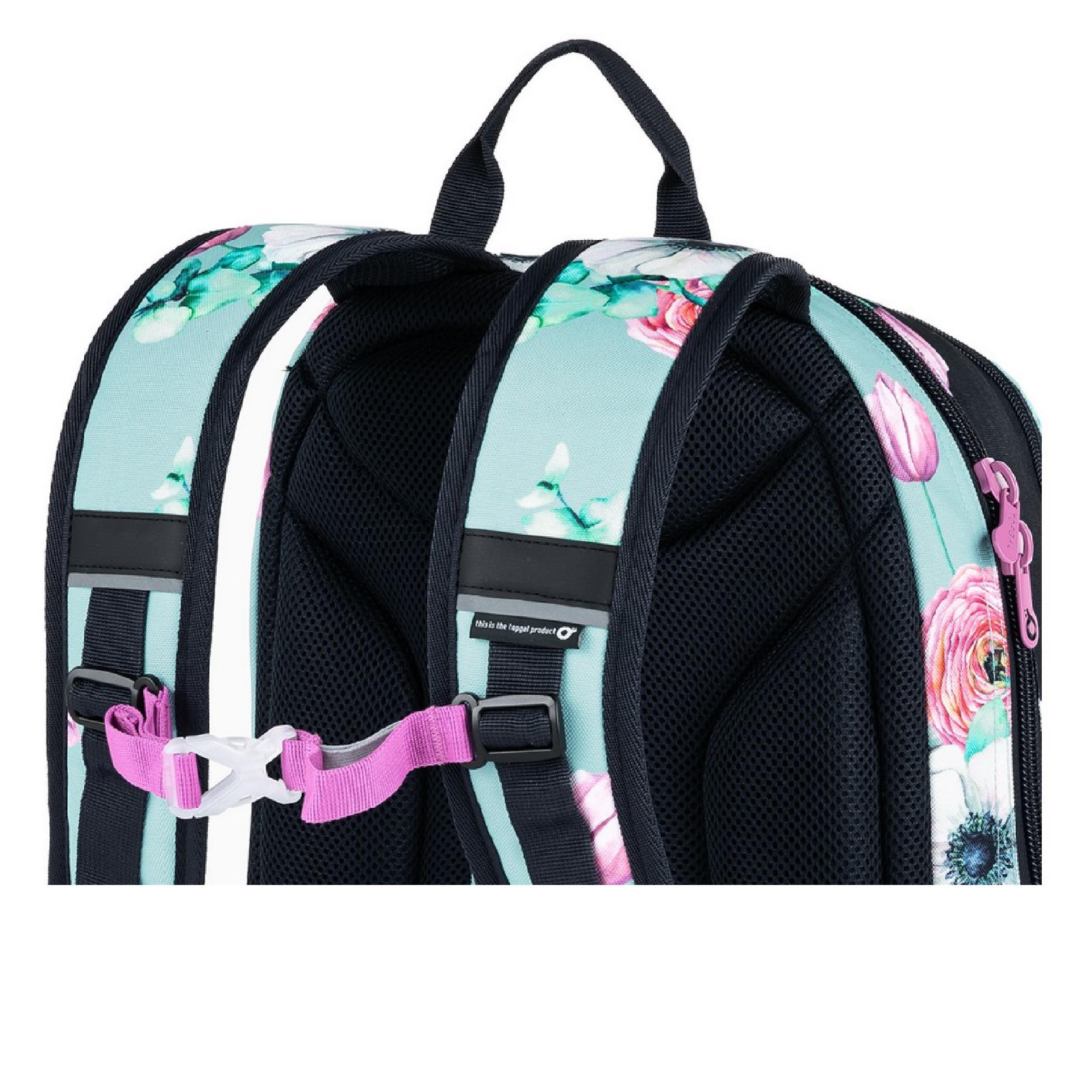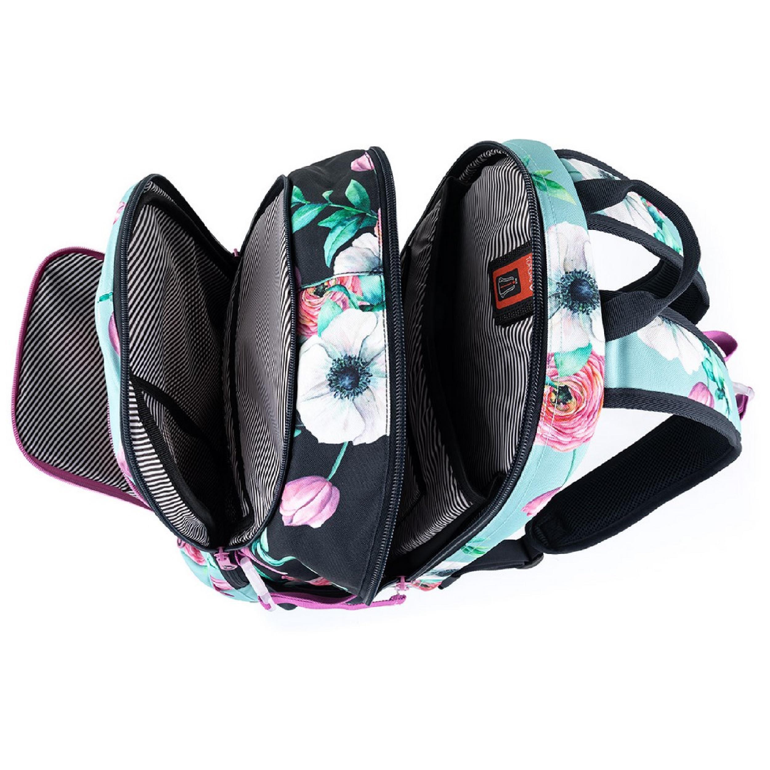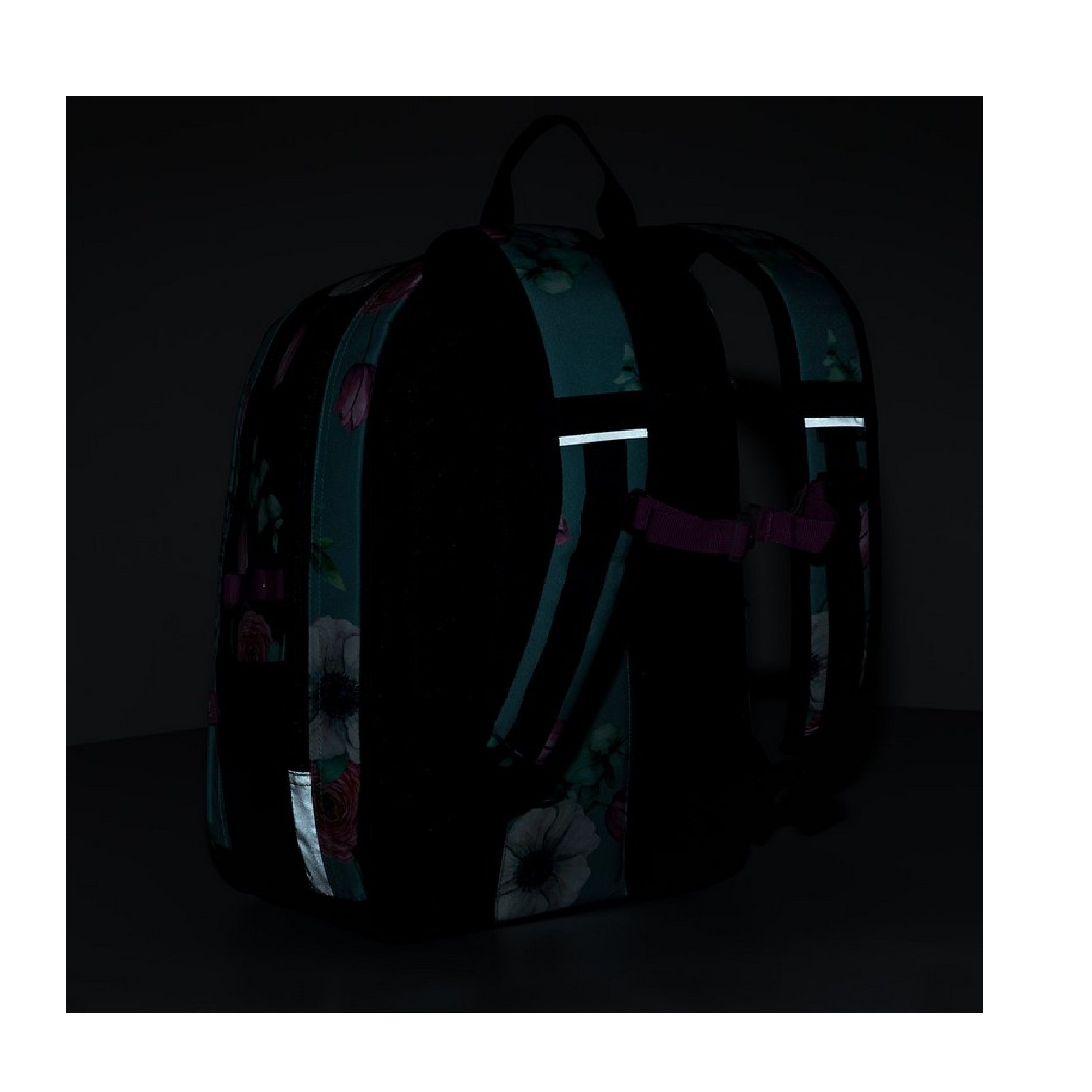 Zadní komora je nejobjemnější, pojme všechno potřebné těžké učení. Na zádové části je uvnitř našitá polstrovaná kapsa na notebook nebo dokumenty a ještě jedna menší, třeba na mobil. Přední užší komora ukrývá síťovou kapsu na drobnosti a pruženku s karabinkou na klíče. Na přední části batohu jsou pak dvě menší kapsy. Do obou se bez problémů vejde penál ETUE 21028 ve stejném designu.