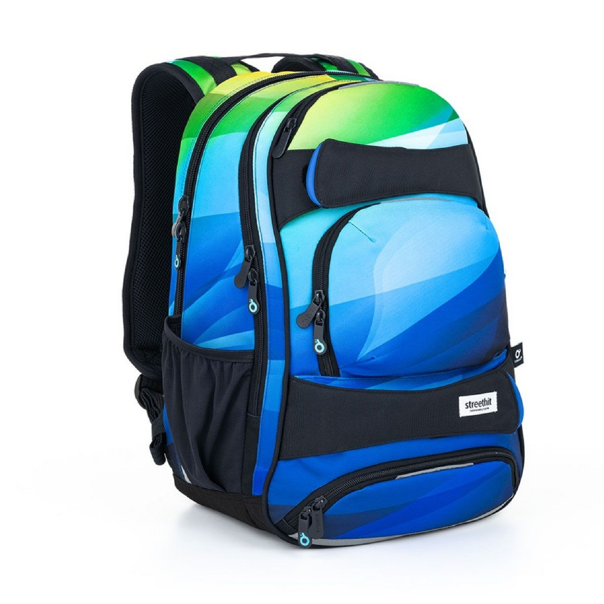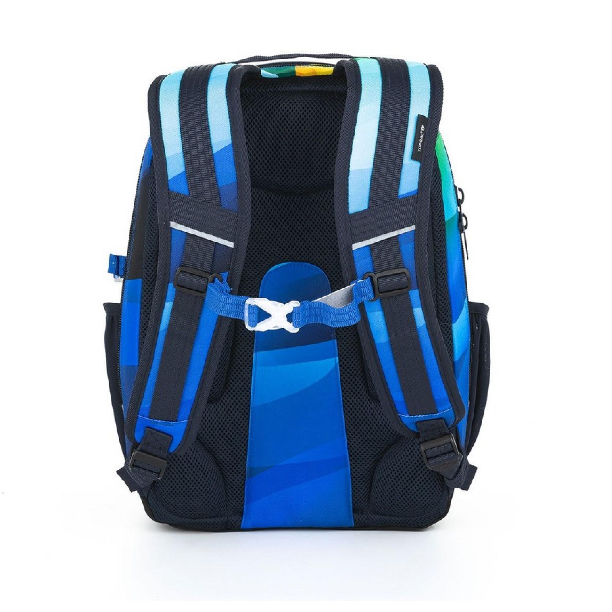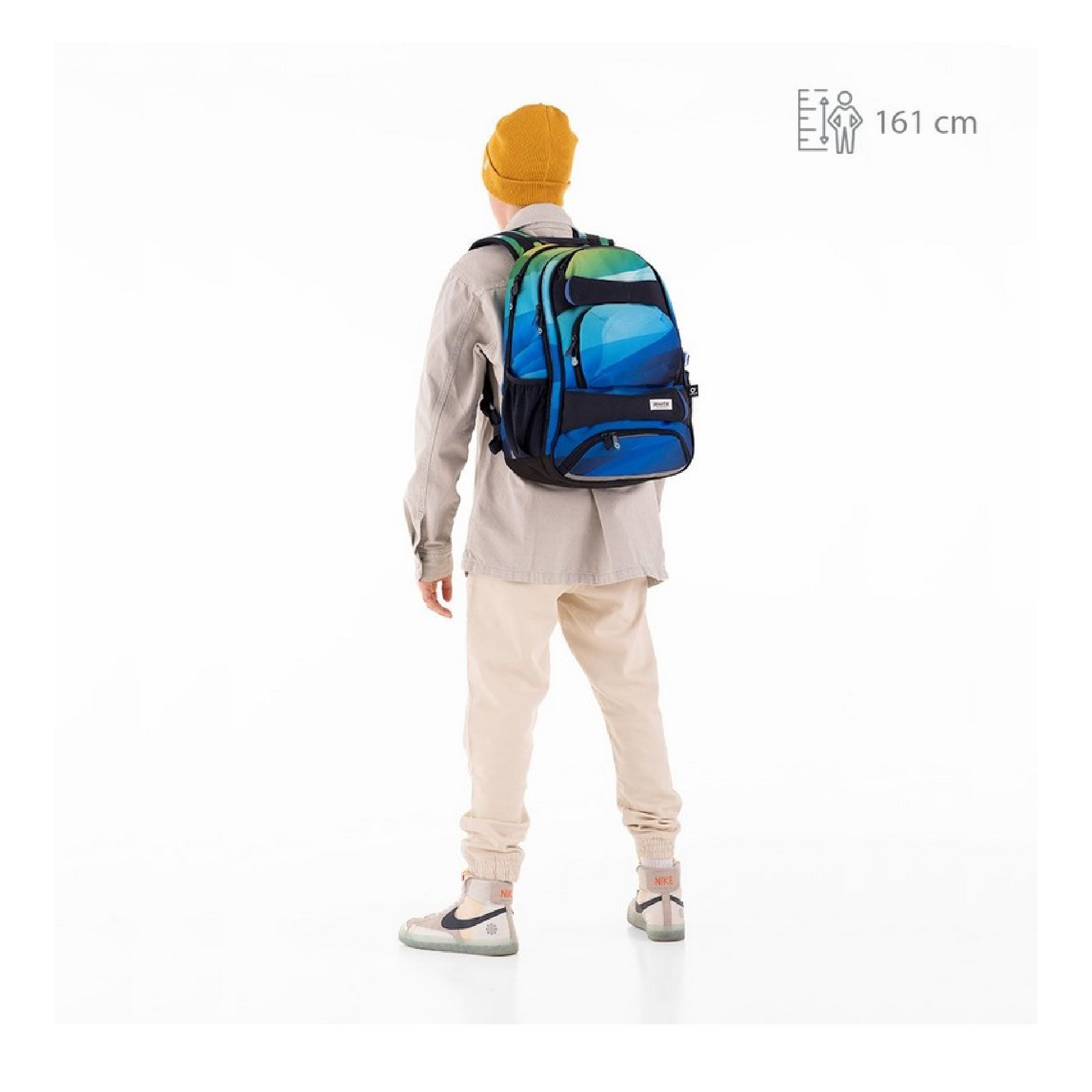YUMI, stálice mezi studentskými střihy letos v modro zelených barvách na tmavě modrém základu. Batoh doporučujeme od druhého stupně ZŠ, nebo od 150 cm výšky.