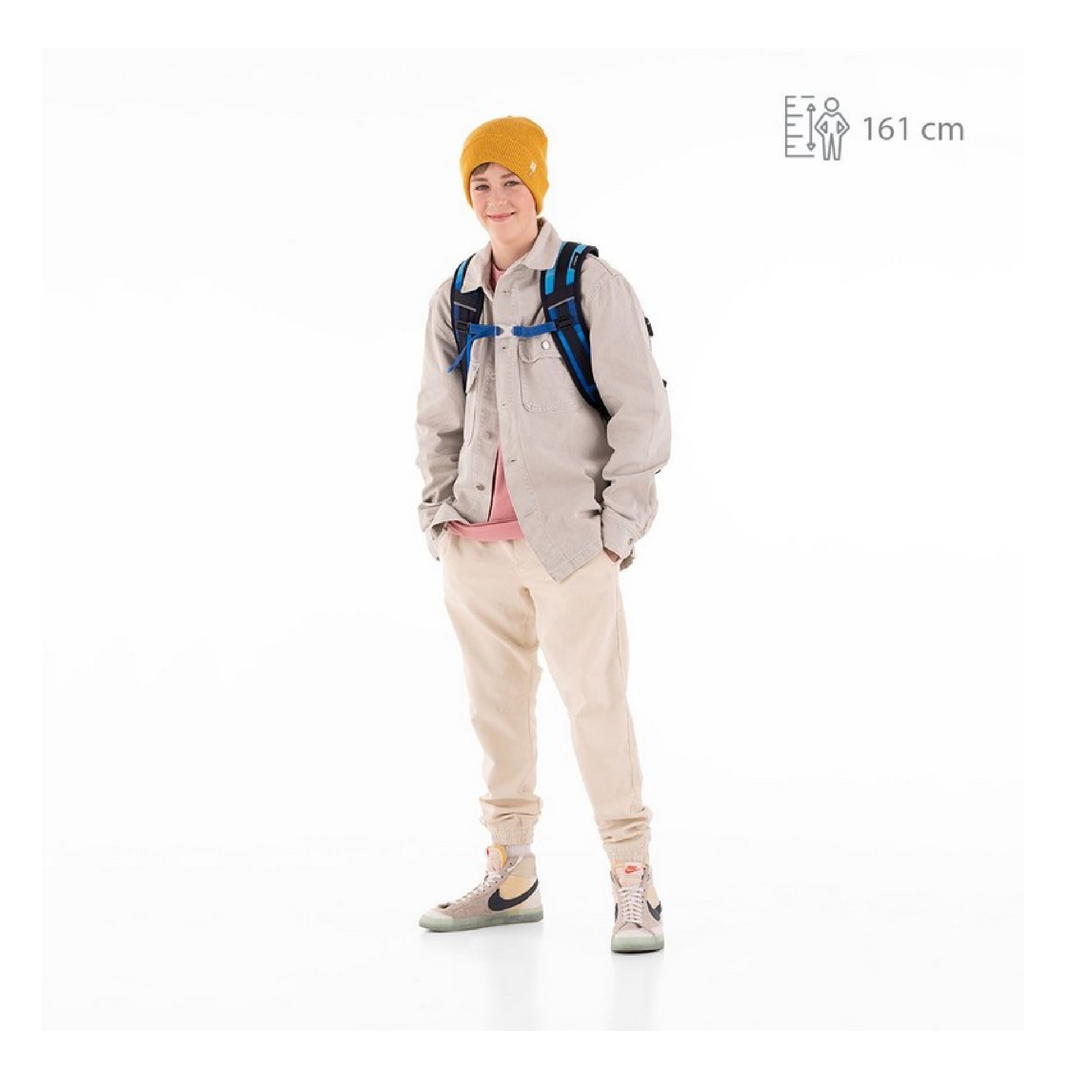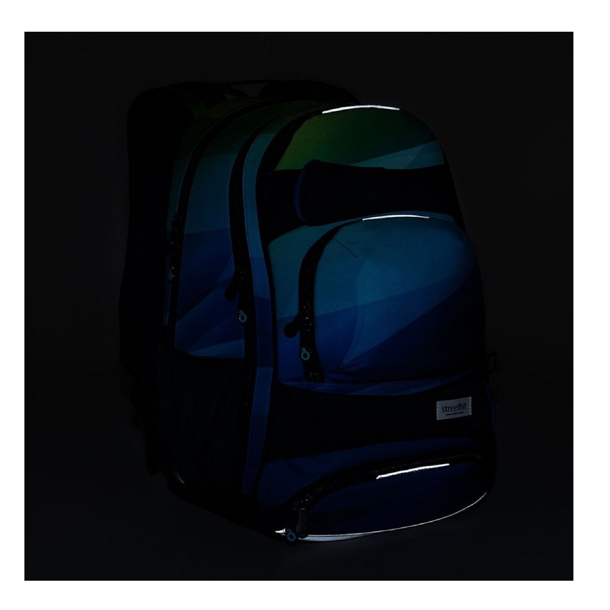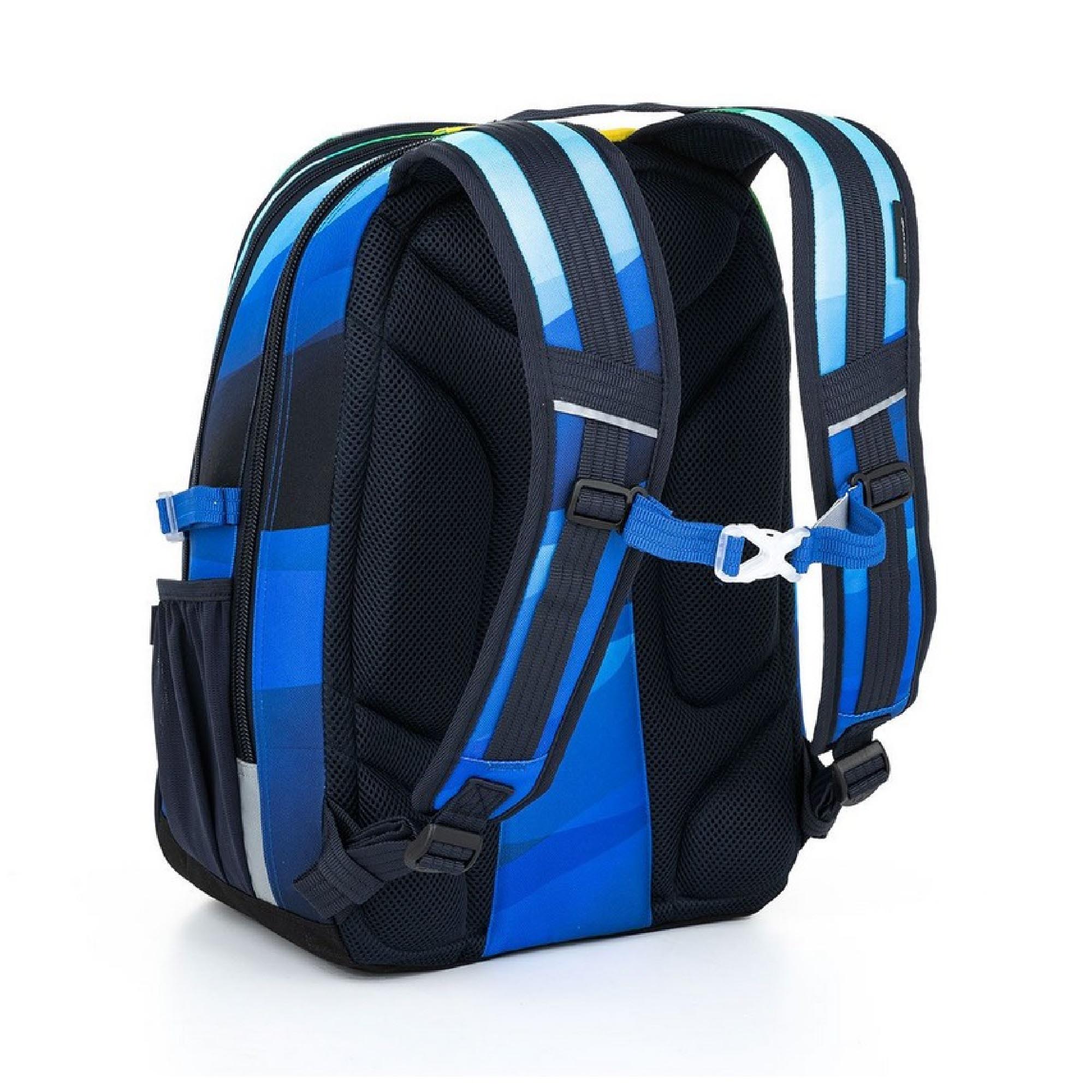 YUMI, stálice mezi studentskými střihy letos v modro zelených barvách na tmavě modrém základu. Batoh doporučujeme od druhého stupně ZŠ, nebo od 150 cm výšky.