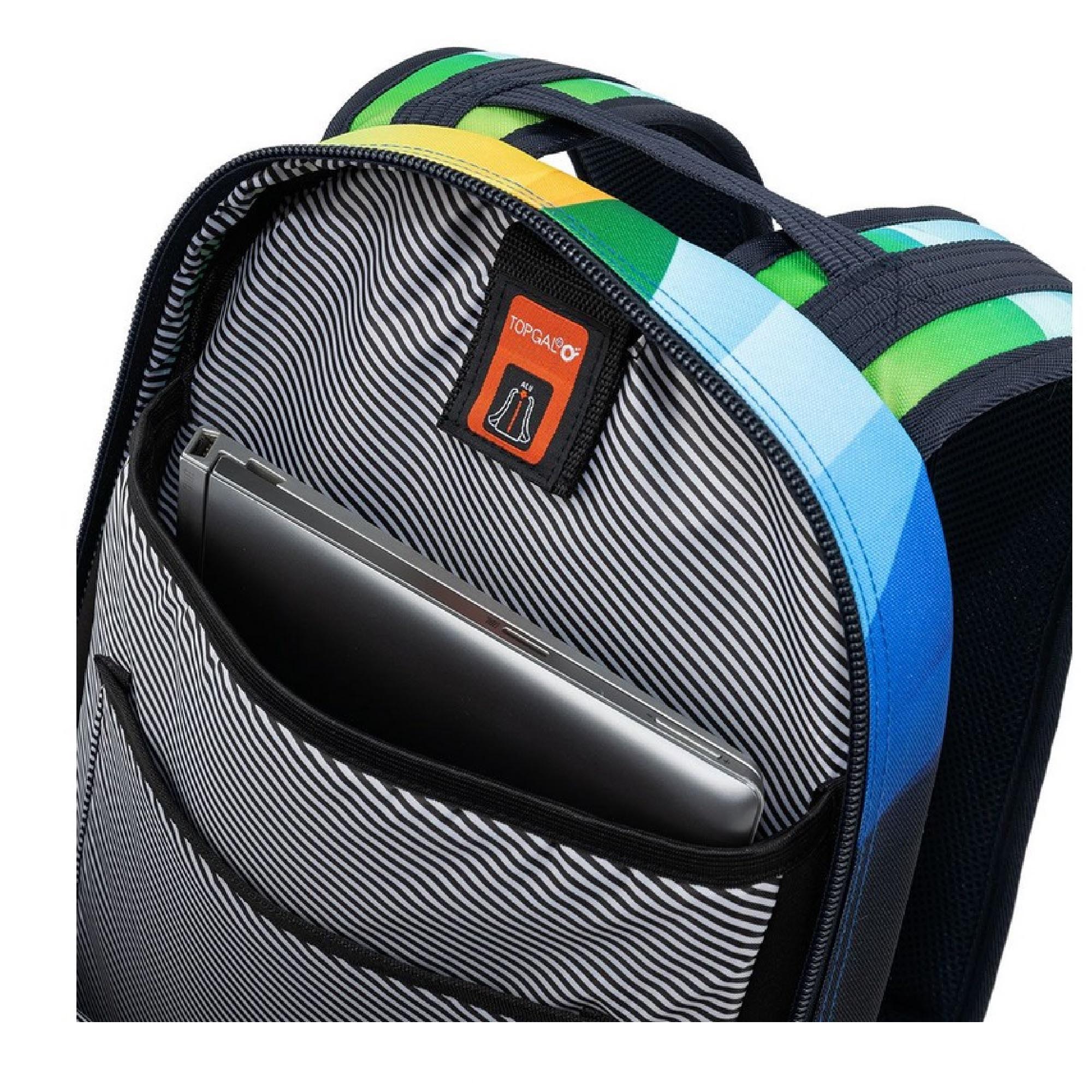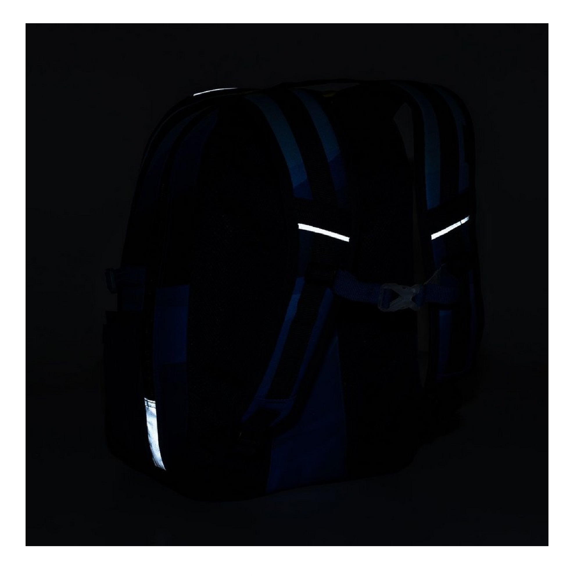 Batoh je dělen na dvě hlavní komory a další kapsy. Zadní komora je velmi objemná, studenti, kteří nosí do školy notebook, v ní určitě ocení polstrovanou kapsu na notebook a další menší polstrovanou kapsu, třeba na mobil, nebo tablet. V přední užší komoře je praktická síťová kapsa na zip a karabina na klíče, která je našita na dlouhé pružence.