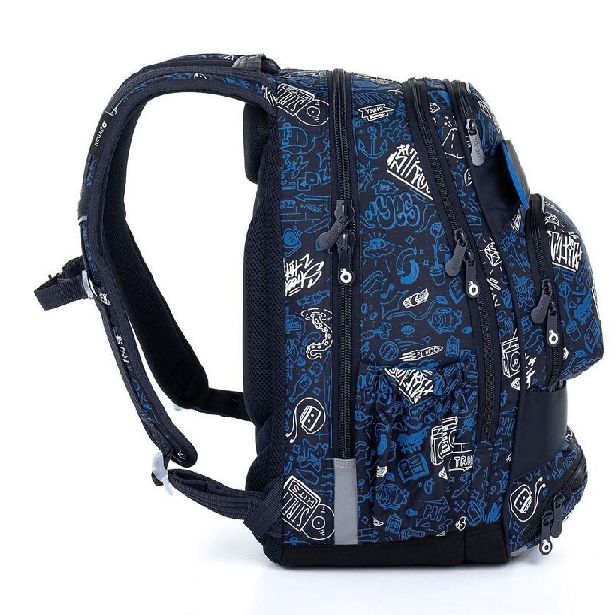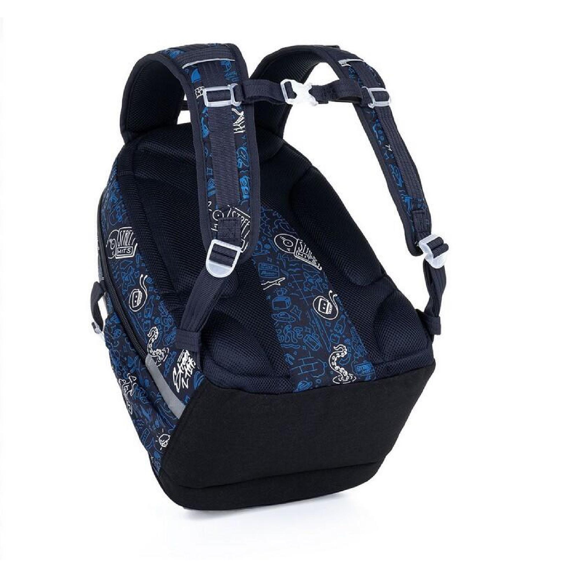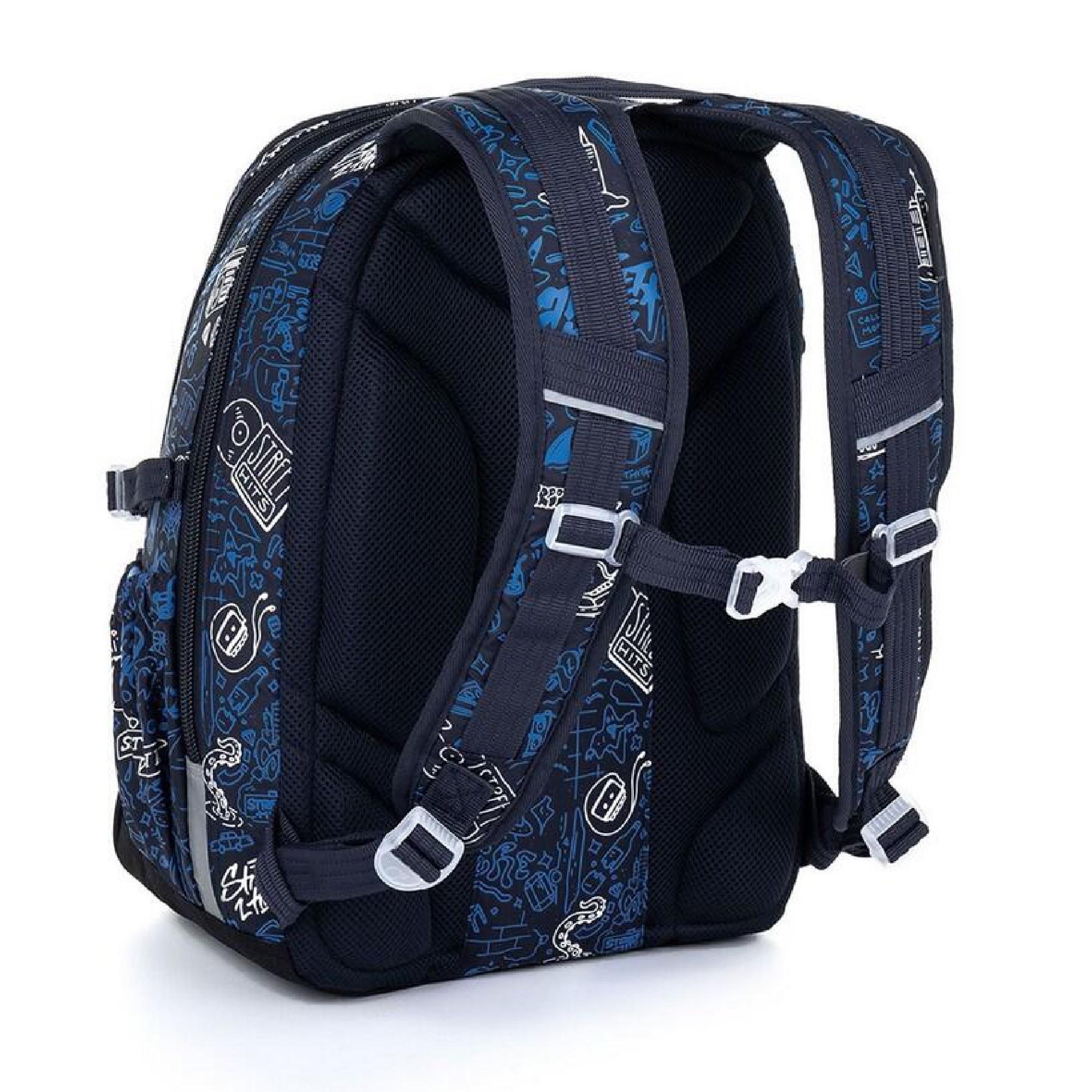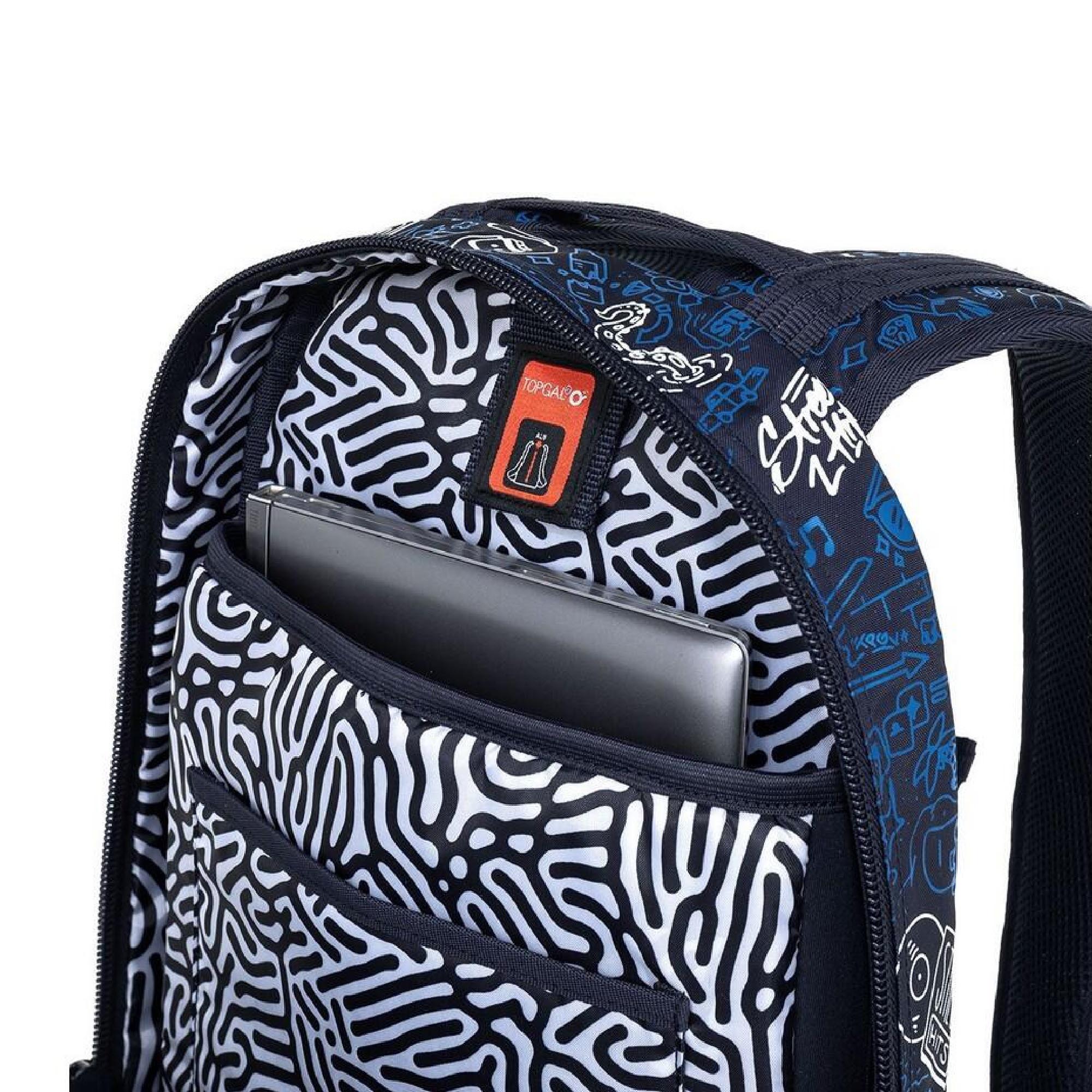 Objemný dvoukomorový batoh s módními doodle art obrázky. Záda batohu jsou polstrovaná, anatomicky tvarovaná a pevná díky lehké hliníkové výztuze. Uvnitř zadní komory je umístěna polstrovaná kapsa na notebook i tablet a druhá menší na mobil či powerbanku.