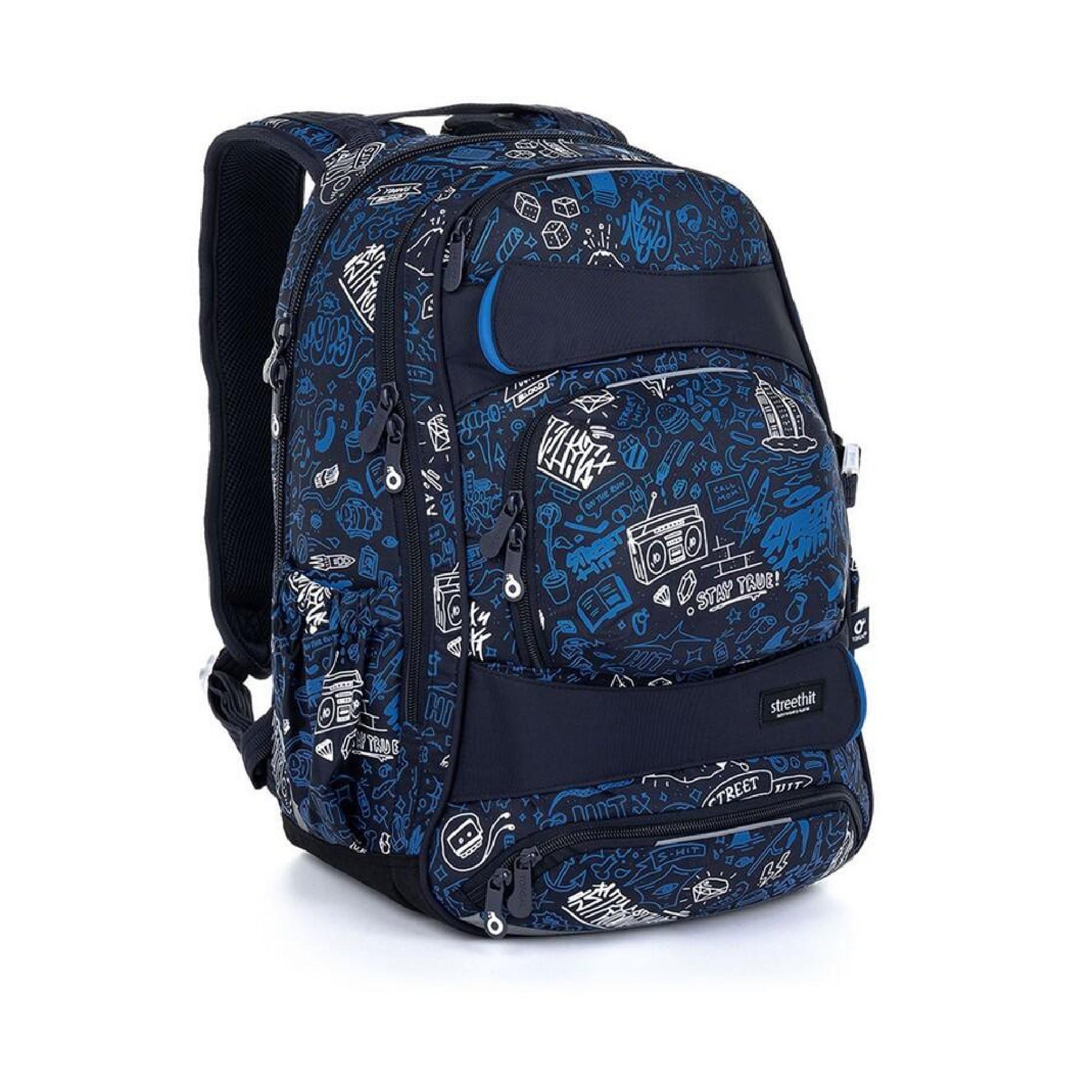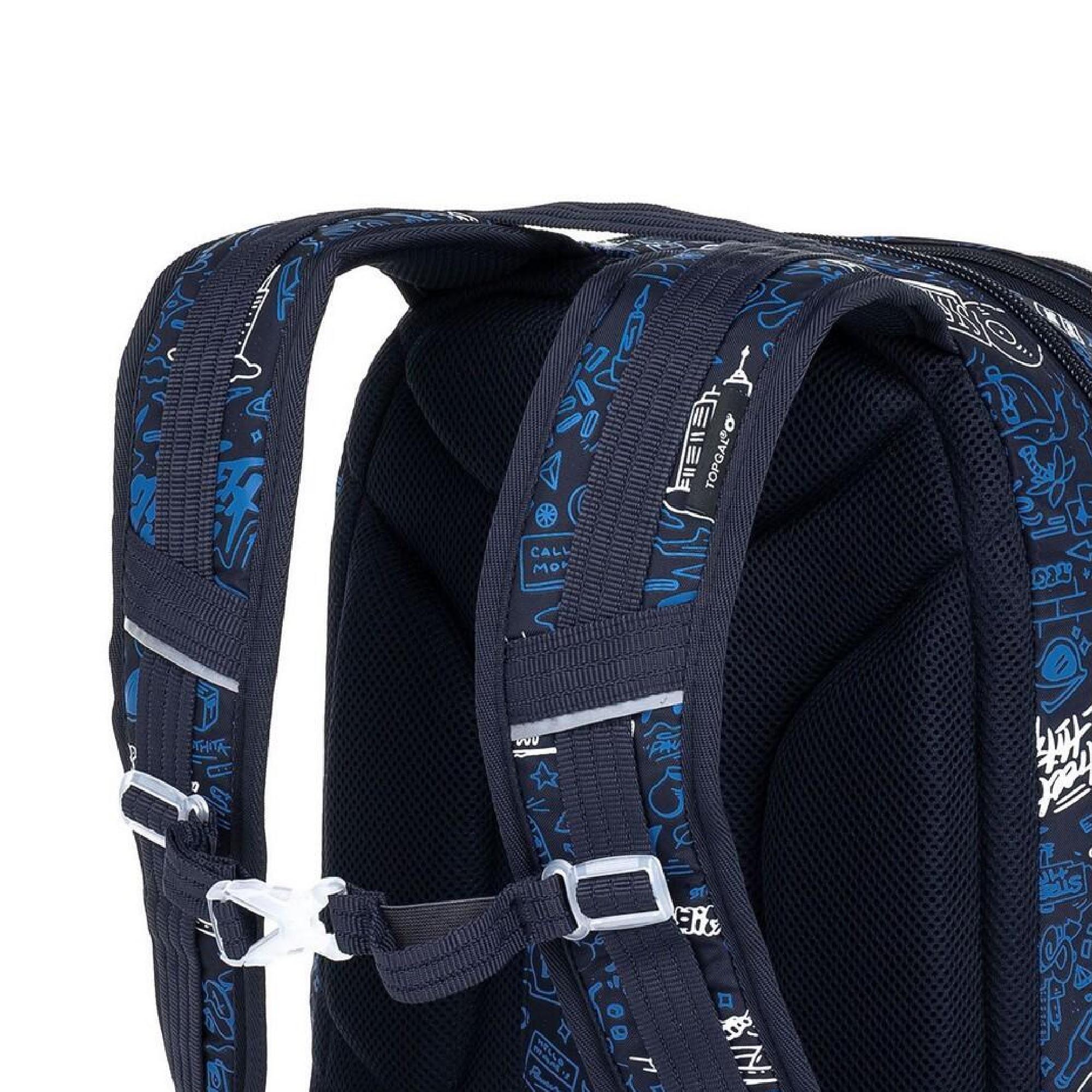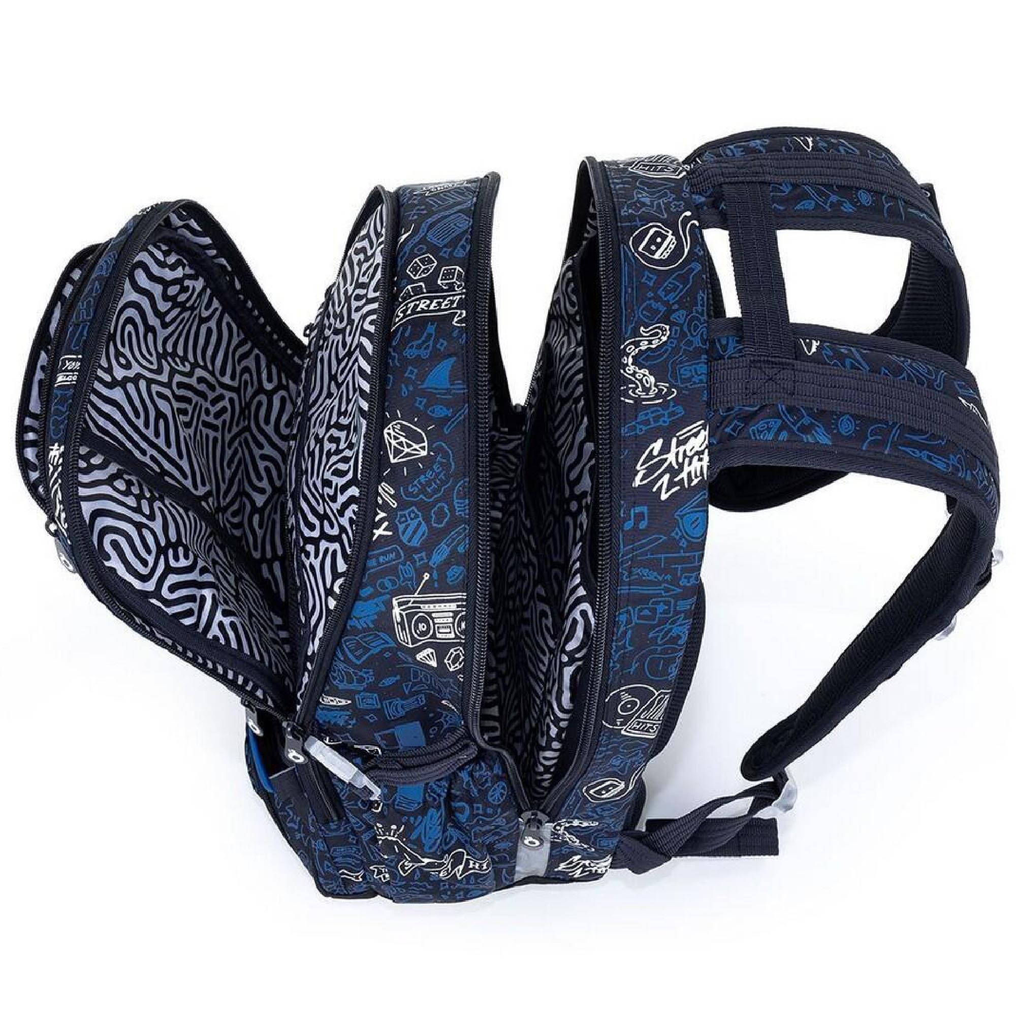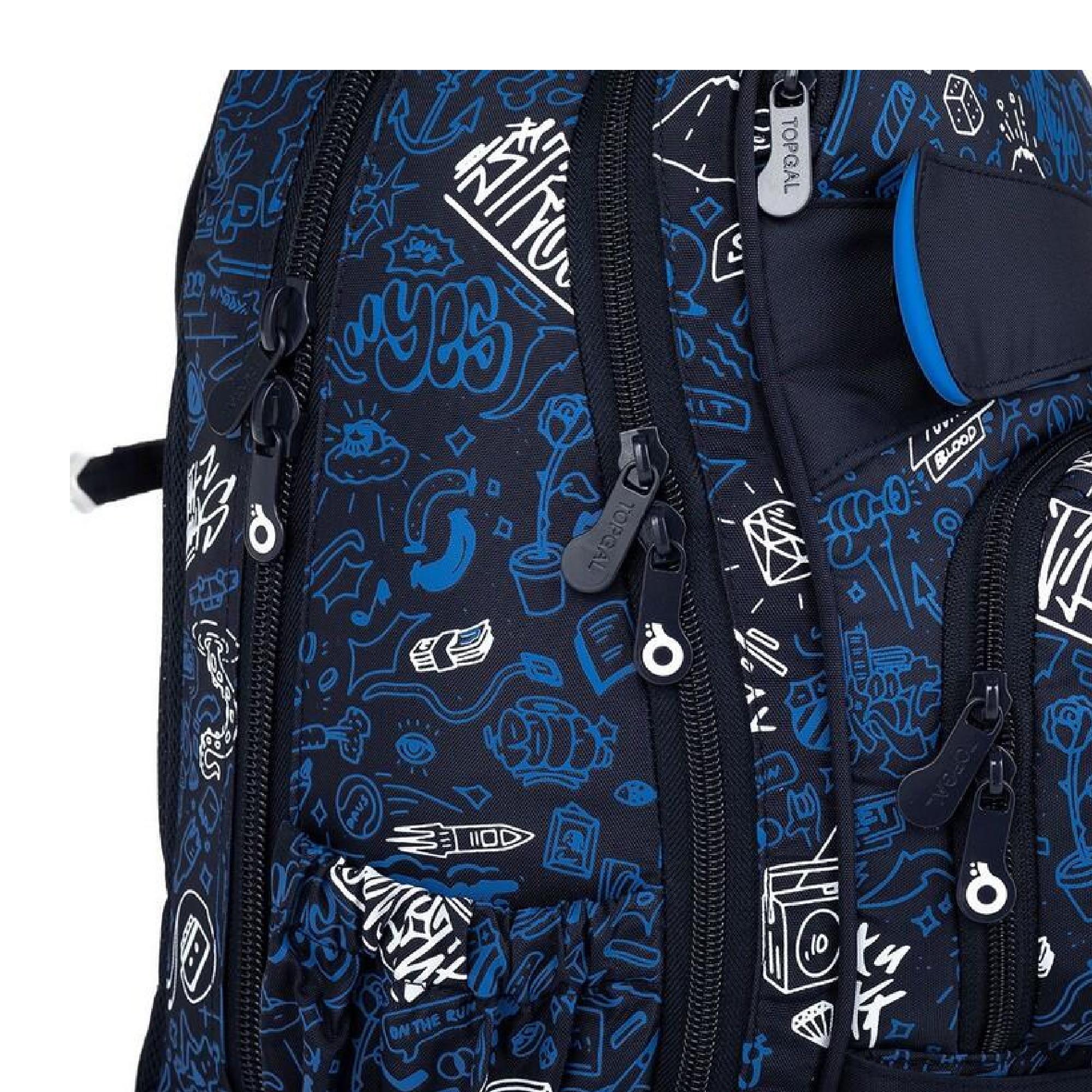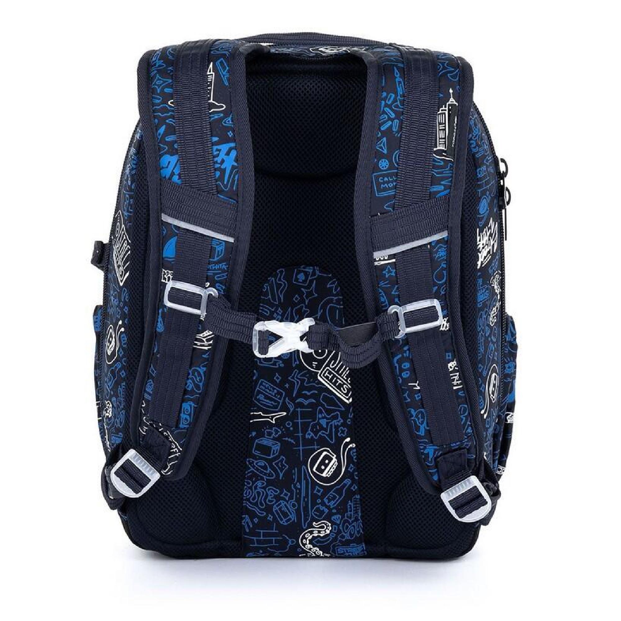 Objemný dvoukomorový batoh s módními doodle art obrázky. Záda batohu jsou polstrovaná, anatomicky tvarovaná a pevná díky lehké hliníkové výztuze. Uvnitř zadní komory je umístěna polstrovaná kapsa na notebook i tablet a druhá menší na mobil či powerbanku.