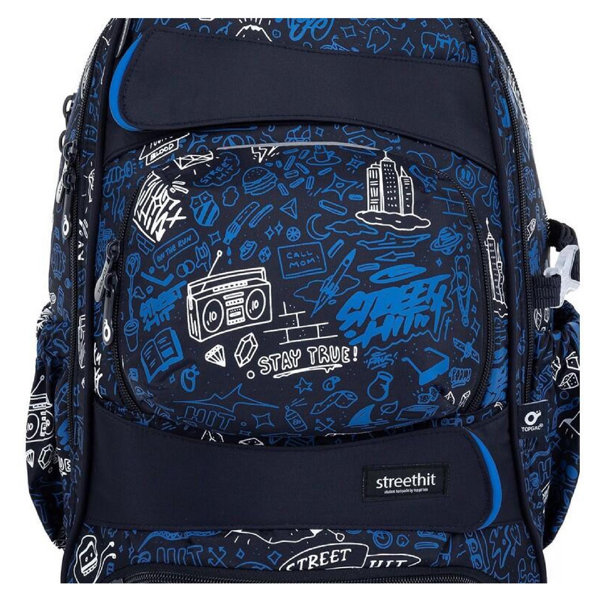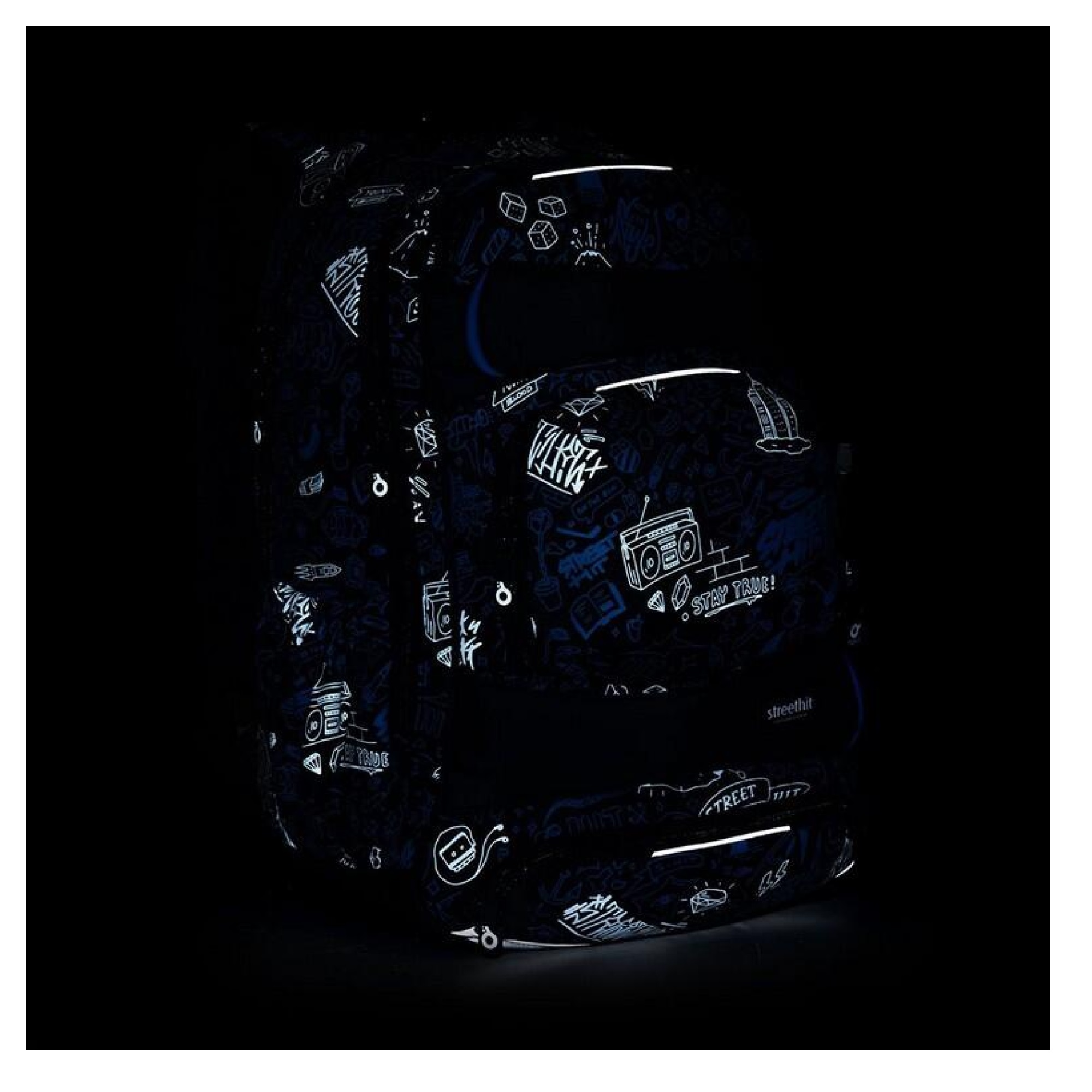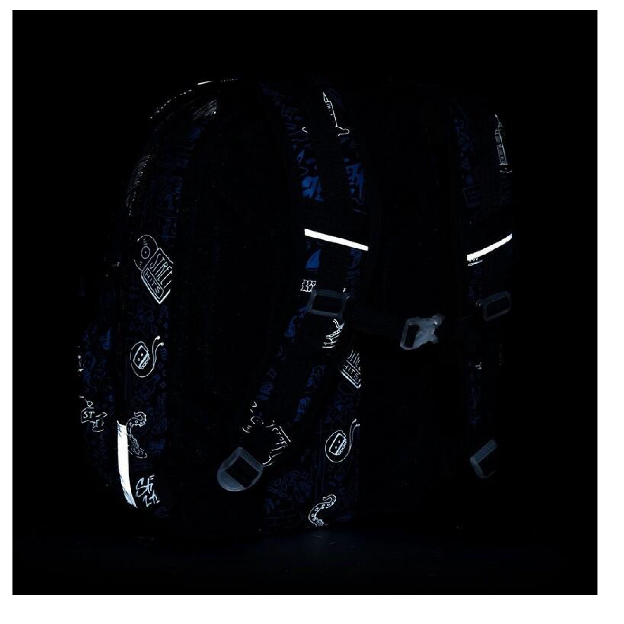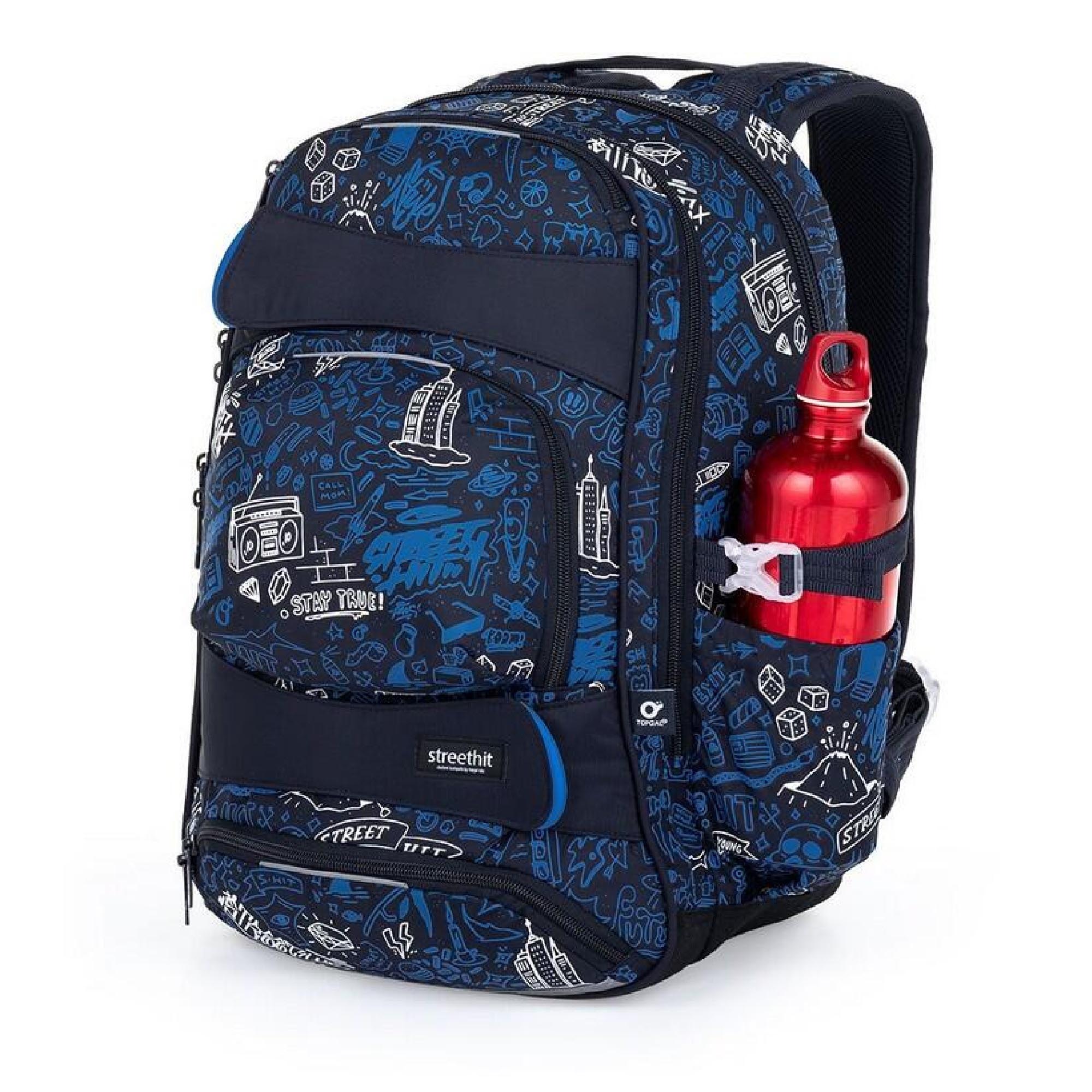 Objemný dvoukomorový batoh s módními doodle art obrázky. Záda batohu jsou polstrovaná, anatomicky tvarovaná a pevná díky lehké hliníkové výztuze. Uvnitř zadní komory je umístěna polstrovaná kapsa na notebook i tablet a druhá menší na mobil či powerbanku.