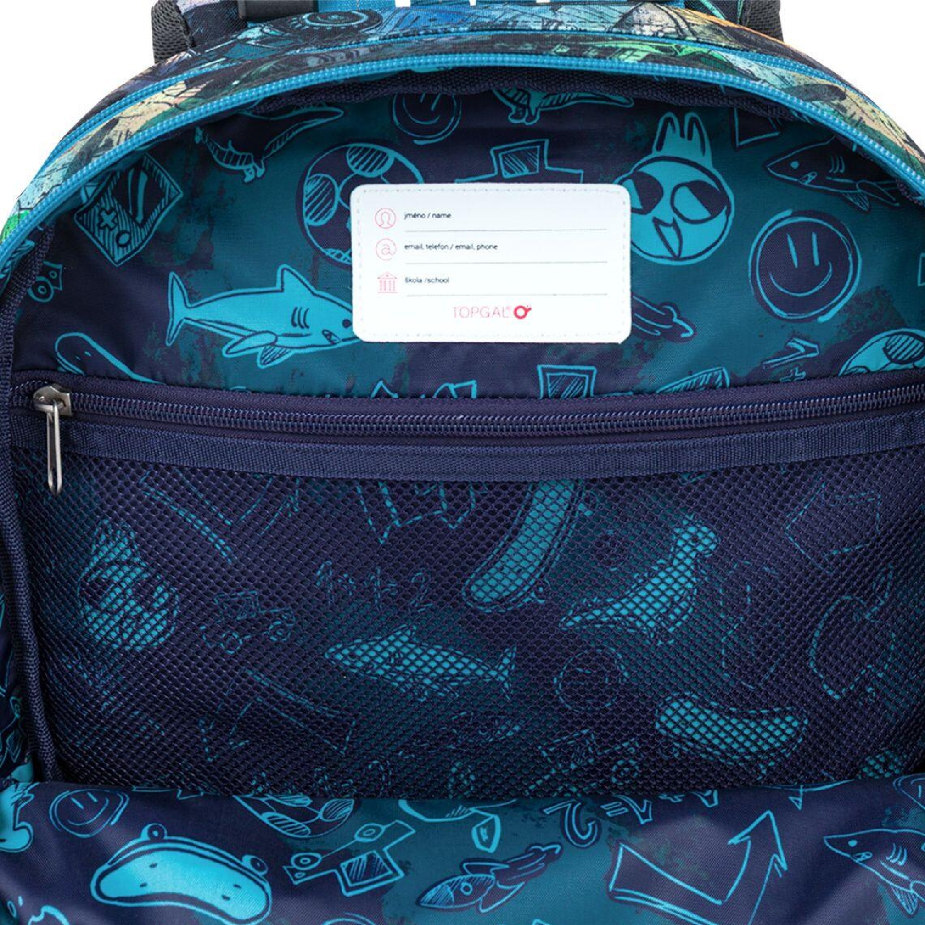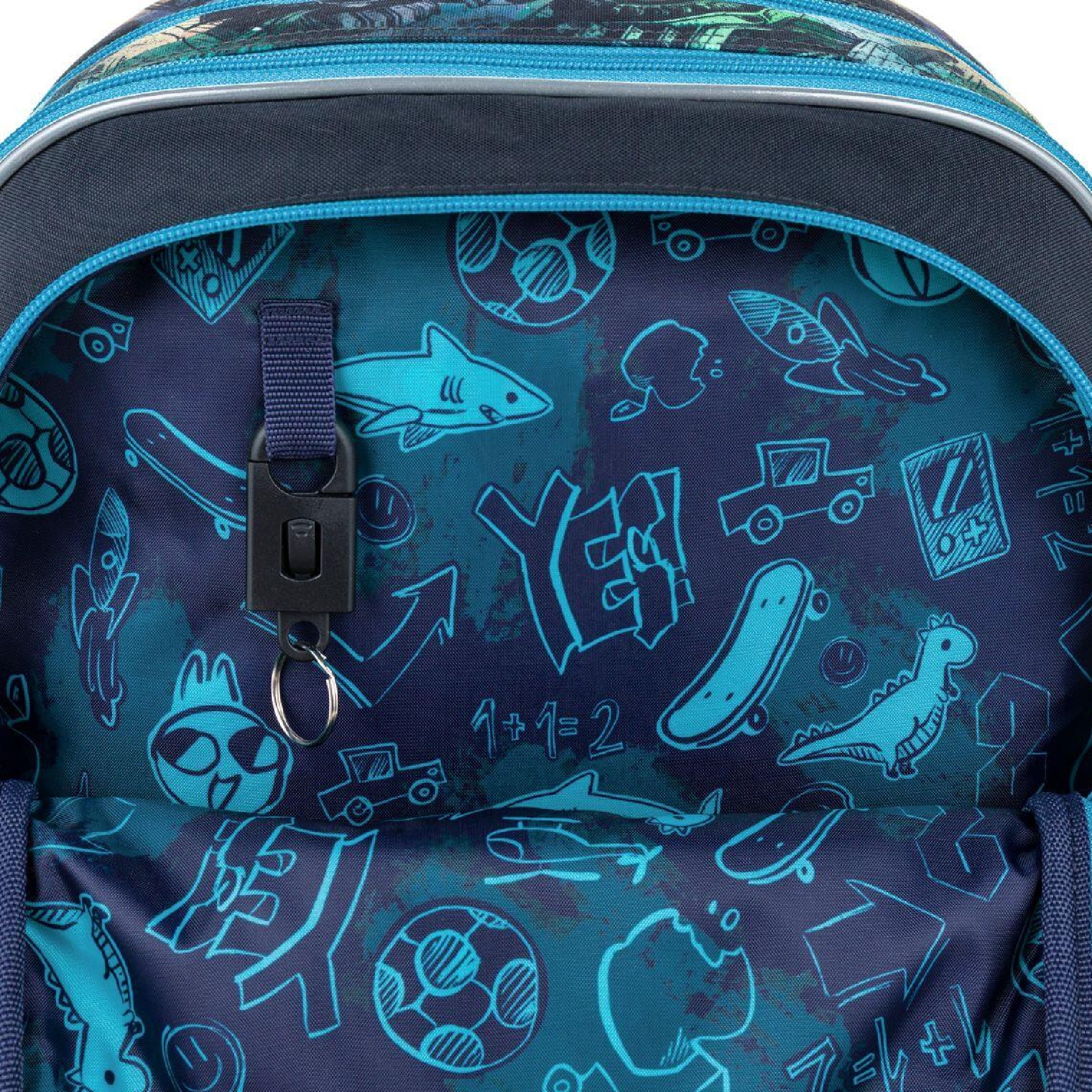 Vnitřní prostor je přehledně členěný tak, aby se v něm malé děti snadno orientovaly. Do hlavní komory doporučujeme uložit učebnice nebo desky na sešity, přední kapsa je ideální na lehčí školní výbavu, například penál nebo box na svačinu. Samozřejmostí je také odnímatelná karabina na klíče.