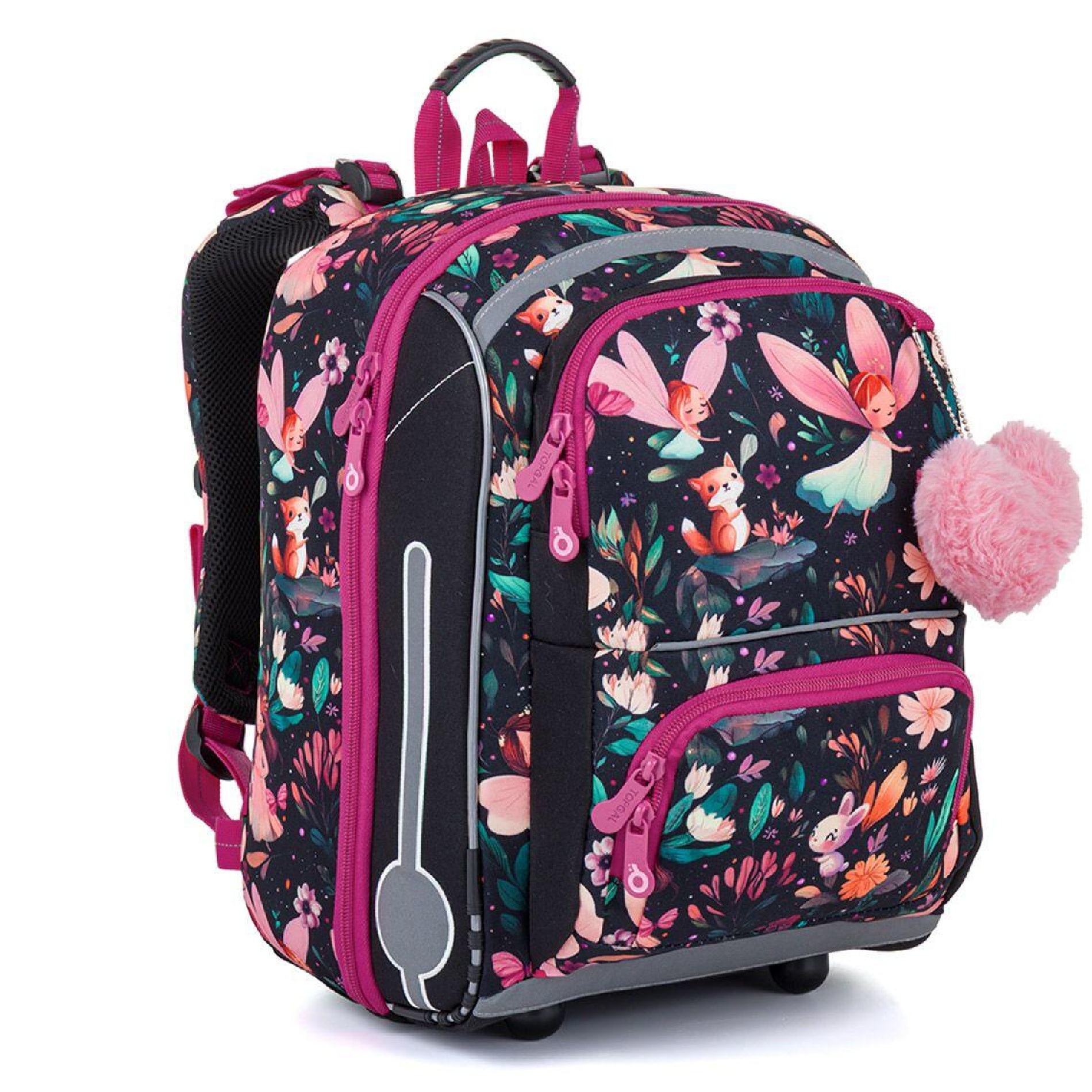 Batoh má pevná, ergonomicky tvarovaná záda a měkce polstrované ramenní popruhy, které se snadno přizpůsobí drobnější postavě dítěte. Výškově nastavitelná hrudní přezka pomáhá udržet batoh správně usazený na zádech a zvyšuje pohodlí při nošení.