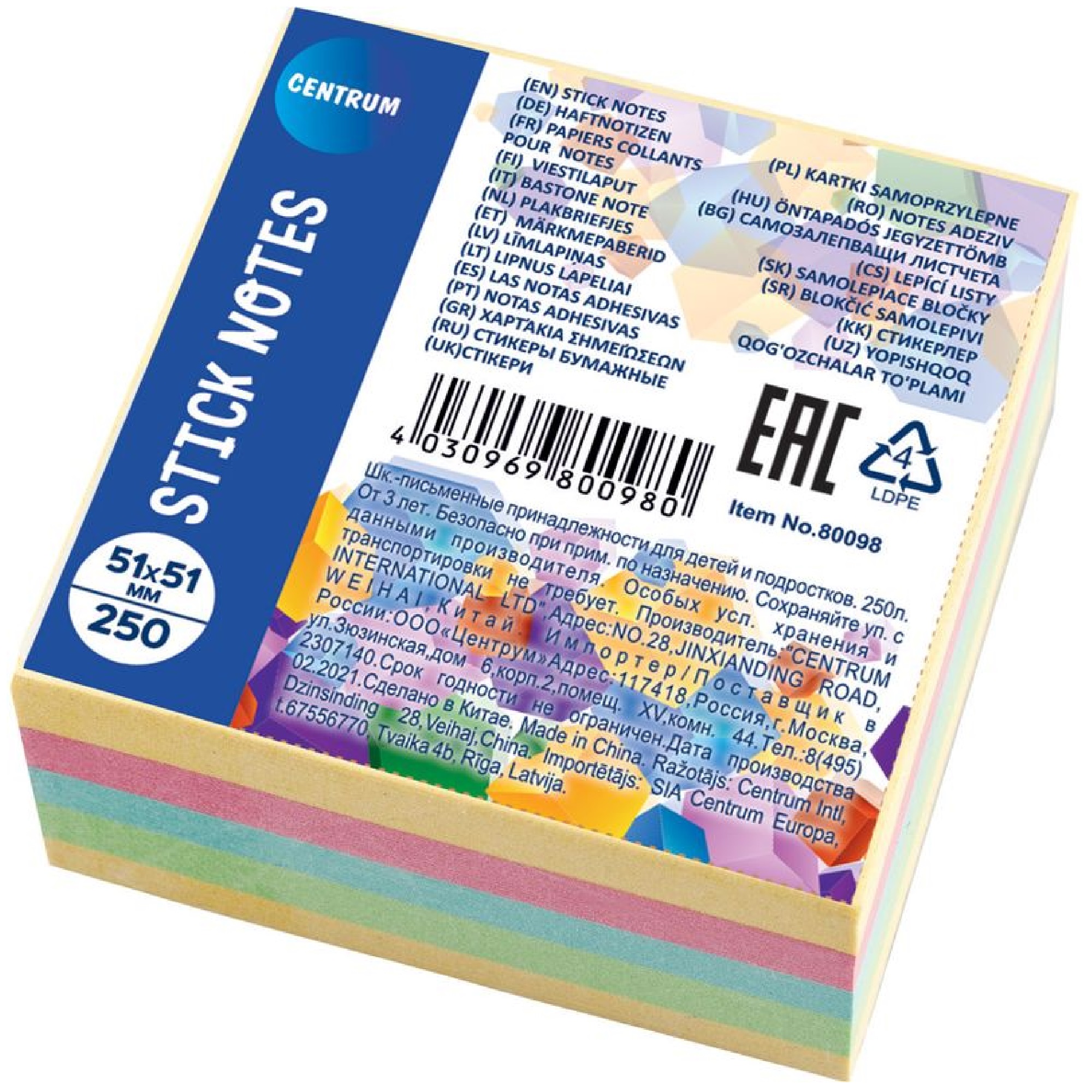 Popis:Samolepicí bločky ve tvaru kostky. 250 listů.Rozměr 51 x 51 mm/5x50 listů