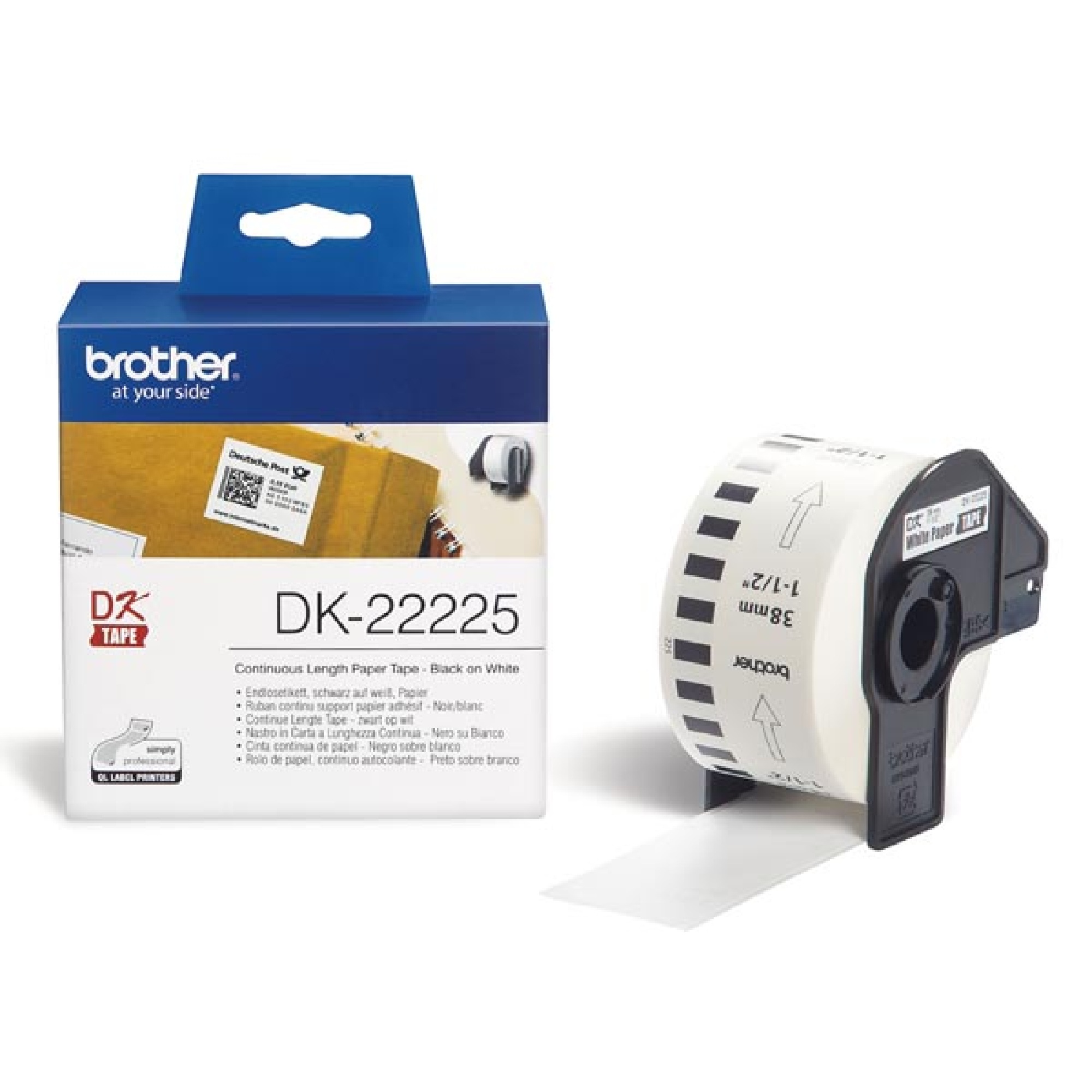 Popis:Originální Brother DK-22225 kontinuální papírová role – černá na bílé, 38 mm šířka