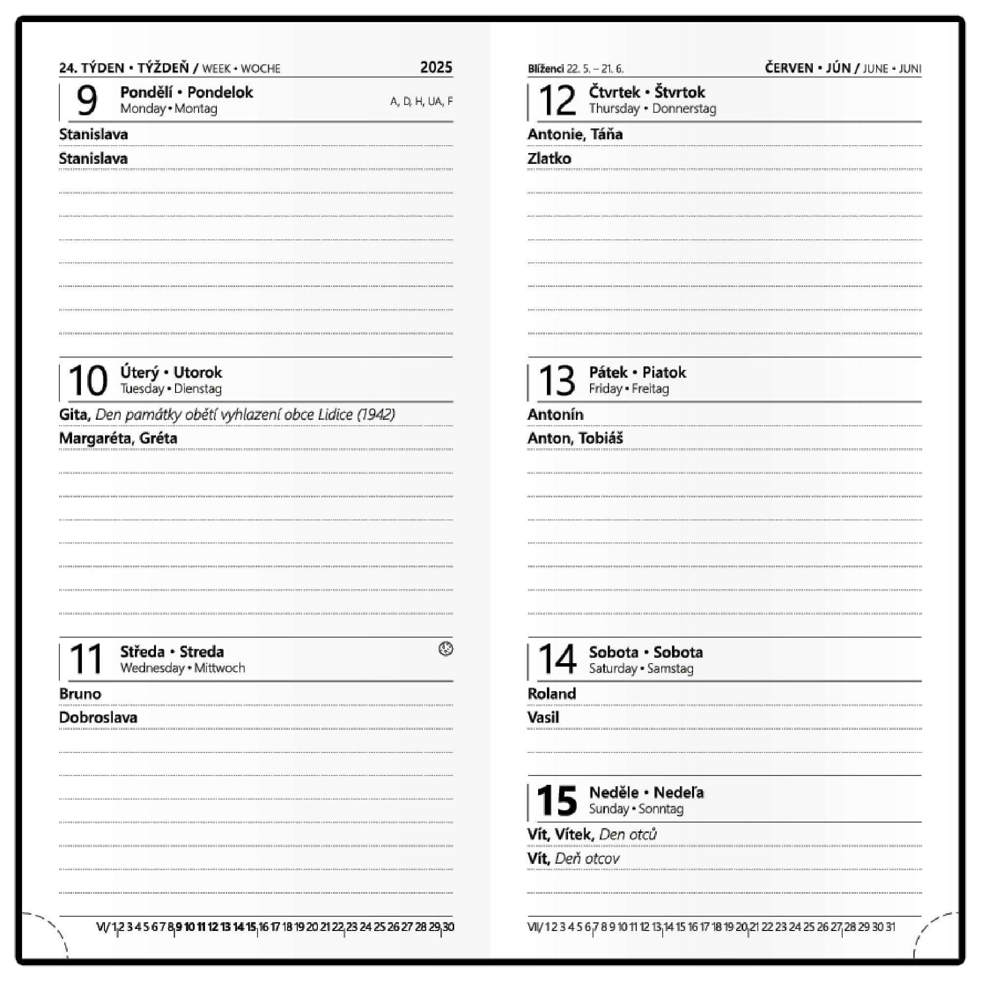 Popis:Kapesní týdenní diář v modrém odstínu je vyráběný v matném laminu s parciálním lakem. Trendy a praktický doplněk do každé kapsy. Diář má velký prostor pro poznámky a plánování. Informace o kalendáriu: měsíční fáze, roční období, letní a zimní čas, znamení zvěrokruhu, řádkový přehled 2 měsíců, dny a měsíce v 4 jazycích - CS, SK, EN, DE, mezinárodní svátky: CZ, SK, A, D, PL, H, GB, E, F, I, UA. Informační stránky obsahují: osobní údaje, přehledný kalendář aktuálního roku a následujícího roku, měsíční plánování aktuálního roku, plán dovolených aktuálního roku, jmenný seznam CZ/SK, mezinárodní svátky, roční plánovací kalendář CZ aktuálního roku, místo pro poznámky. Rozměry: 75 x 150 mm.