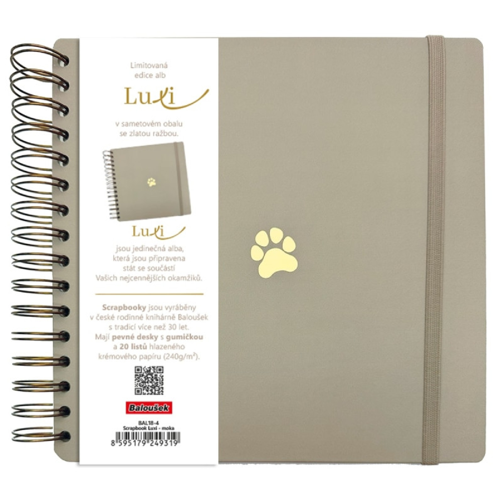 Popis:limitovaná edice scrapbooků se sametovým přebalem v moderní moka barvě a se zlatým motivem Tlapky, jedinečná alba Luxi s krémovým papírem, kroužkovou vazbou a gumičkou pro všechna vaše tvoření, ručně vyráběná v České republice, pevné desky s gumičkou, uvnitř 40 stran 240g papíru umožňujících vlepování fotografií i psaní různými popisovači, počet stran je přizpůsoben spirále tak, aby se album i po zaplnění pohodlně uzavíralo, krásná a trvanlivá alba připravená stát se součástí vašich nejcennějších okamžiků, rozměry 210×210 mm, 20 listů