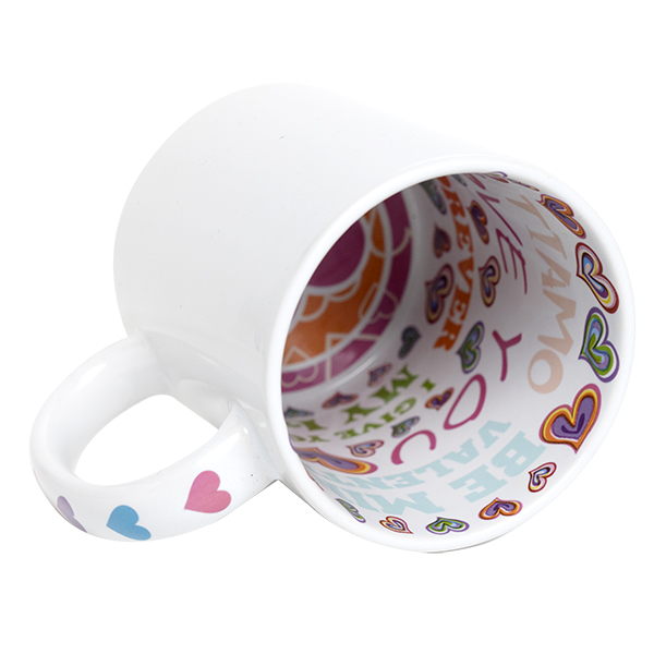 Popis:Keramický bílý hrnek 250 ml s vnitřním potiskem a barevným uchem - I LOVE YOU Tento tématický hrnek je každoročně velkým hithem na trhu! Speciální plnobarevný motiv uvnitř hrnku s motivem Miluji Tě. Tím ale možnosti nekončí! Samozřejmě můžete stále přenášet obrázky i na povrch těchto hrnečků!Kvalita: AAAPrůměr: 82 mmObjem: 300 mlVýška: 95 mmPlocha k potisku: 90 x 200 mm Nastavení pro potisk: Teplota: 180oCČas: 20 vteřin ( výtisky z tiskáren Sawgrass a Ricoh )Pro potisk použijte manžetu - obj. Číslo: SU-005-typ-1-NEW