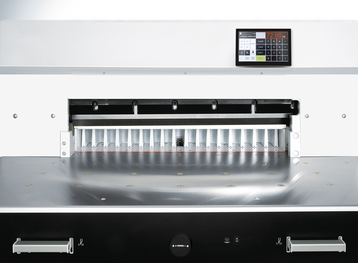 Popis:Elektrická stohová řezačka s hdraulickým lisem šíře 720 mm Hydraulický pohon nože a lisu. Lišta s děr EUR/drátkroužky, čirá perforovaná páska na drátěný hřbet. Vybaveno novými technologiemi - patentovaný EASY - CUT aktivace nože pomocí lišty a bezpečné řezání.- jednoduchá výměna nože s bezpečným uložením do ochranného krytu a snadná výměna řezné lišty bez rizika zranení. Elektronické nastavení zadního dorazu pomocí dotykvého ovládání pro snadné nastavení.- 99 programů s 99 kroky v každém programu ( až 15 opakování řezu mohou být integrovány do programu, jako jediný krok programu ). Program se spustí automaticky.- hlavní vypínač a bezpečnostní zámek s klíčem elektronicky řízeným do skutečného provozu dvouručním ovládáním kontrolní prvek 24 voltů (nízké napětí)- kompletní s podstavcem, skladovací policí, praktickým držákem nástrojů. Volitelná sada bočních stolků je k dispozici za příplatek.- elektronické ruční kolečko pro manuální nastavení zadníhod orazu s plynulou regulaci otáček ( od velmi pomalé až velmi rychlý ).- měření odečet v cm nebo palcích ( displej s přesností na 1/10 mm nebo 1/100 palce ).- ergonomická pracovní výška 94 cm zaručuje snadnou obsluhu. - vybaven SCS bezpečnostním balíčkem- výklopná, elektronicky řízená světelná závora na předním stole- bezpečnostní kryt na zadním stole- bezpečnostní zastavení nože a lisu, návrat z každé pozice- kotoučová brzda pro okamžité zastavení nože - čepel změnou zařízení s krytou ostří nože- nastavení hloubky z vnějšku stroje- vícejazyčné vedení obsluhy s digitálním displejem.- 10 tlačítek pro rychlé nastavní rozměru.- předprogramované míry pro A3 až A6 standardní formáty papíru.- paměť klávesnice pro opakované řezy.- funkce automatického SET pro referenční měření pomocí tlačítka START. - programovatelné EJECT funkce - pro vysunutí papíru.- self -diagnostický systém s chybovým hlášením na displeji.- ovladač pro nastavení tlaku (min. 200 / max. 1.100 daN) a manometr. - lišta pro řezání choulostivých materiálů. - nůž z vysoce kvalitní HSS oceli- masivní ocelový unašeč nože, nastavitelné usazení. - nastavitelný zadní doraz s úzkými separátory a plastovými kluzáky. - optická řezná linka s jasným a trvanlivým LED paprskem.- boční pevné dorazy.- pevná celokovová konstrukce.- předlis - ano- přípojná hodnota 700 V- typ lisu - hydraulický- výška stohu - 80 mm