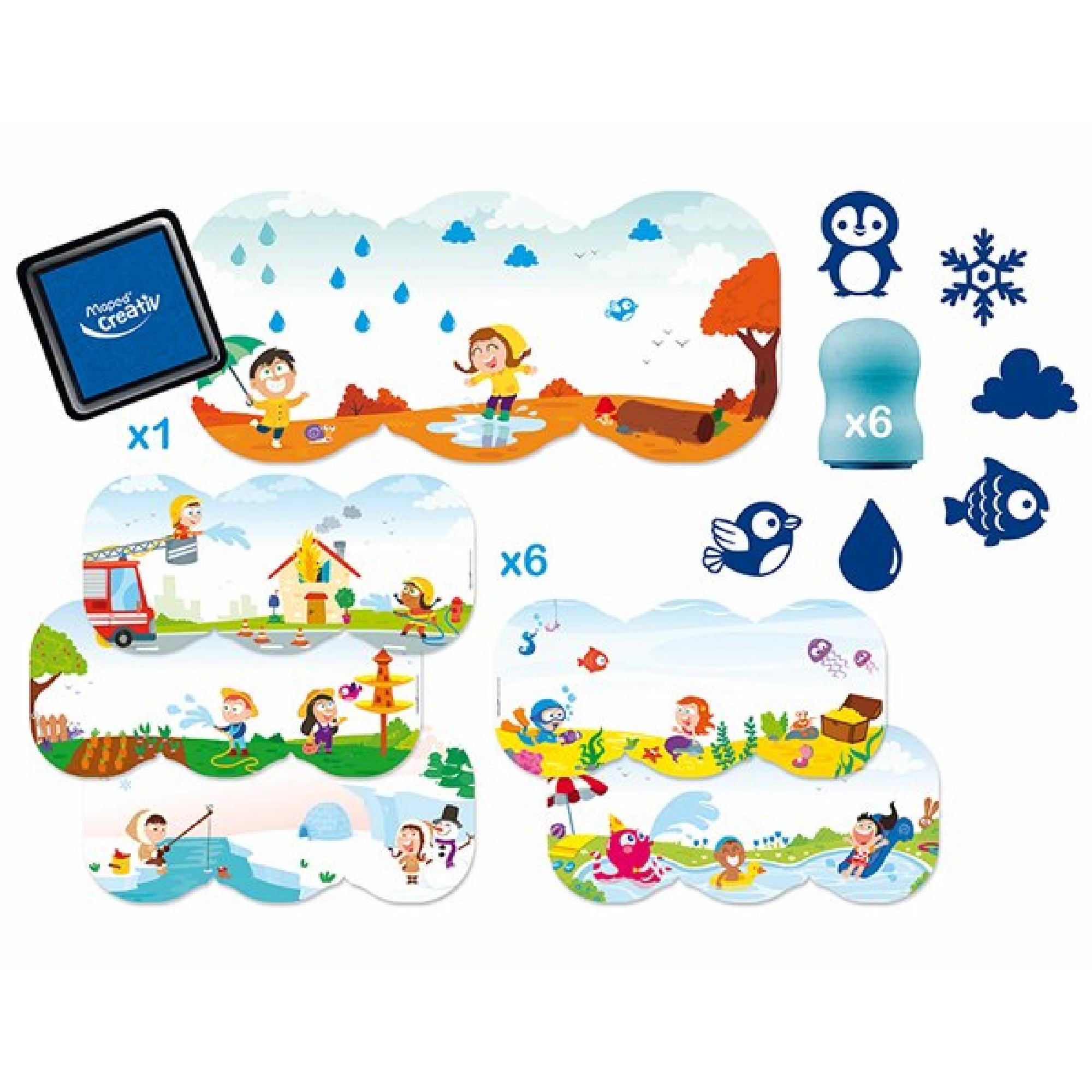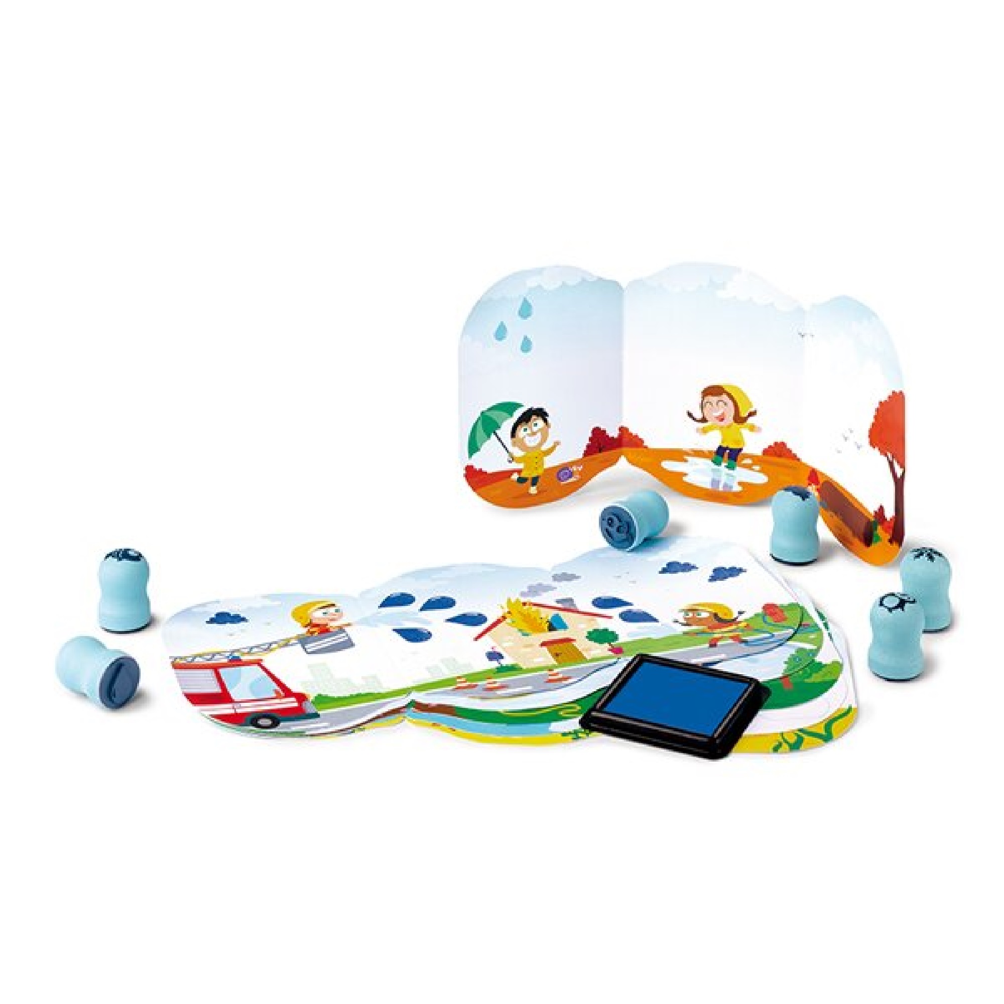 Souprava obsahuje razítka, s dětskými motivy, která jsouspeciálně navržena pro malou ručku a díky měkkému povrchu se příjemně drží. V praktickém kufříku je 6 plakátků, 6 razítek a polštářek s inkoustem, který jde lehce setřít z dětských prstů.