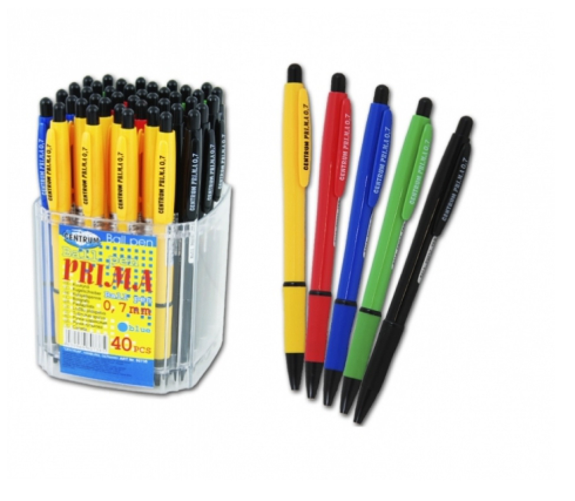 Popis:Kuličkové pero Prima, 0,7 mm, mix barev, modrá náplň.