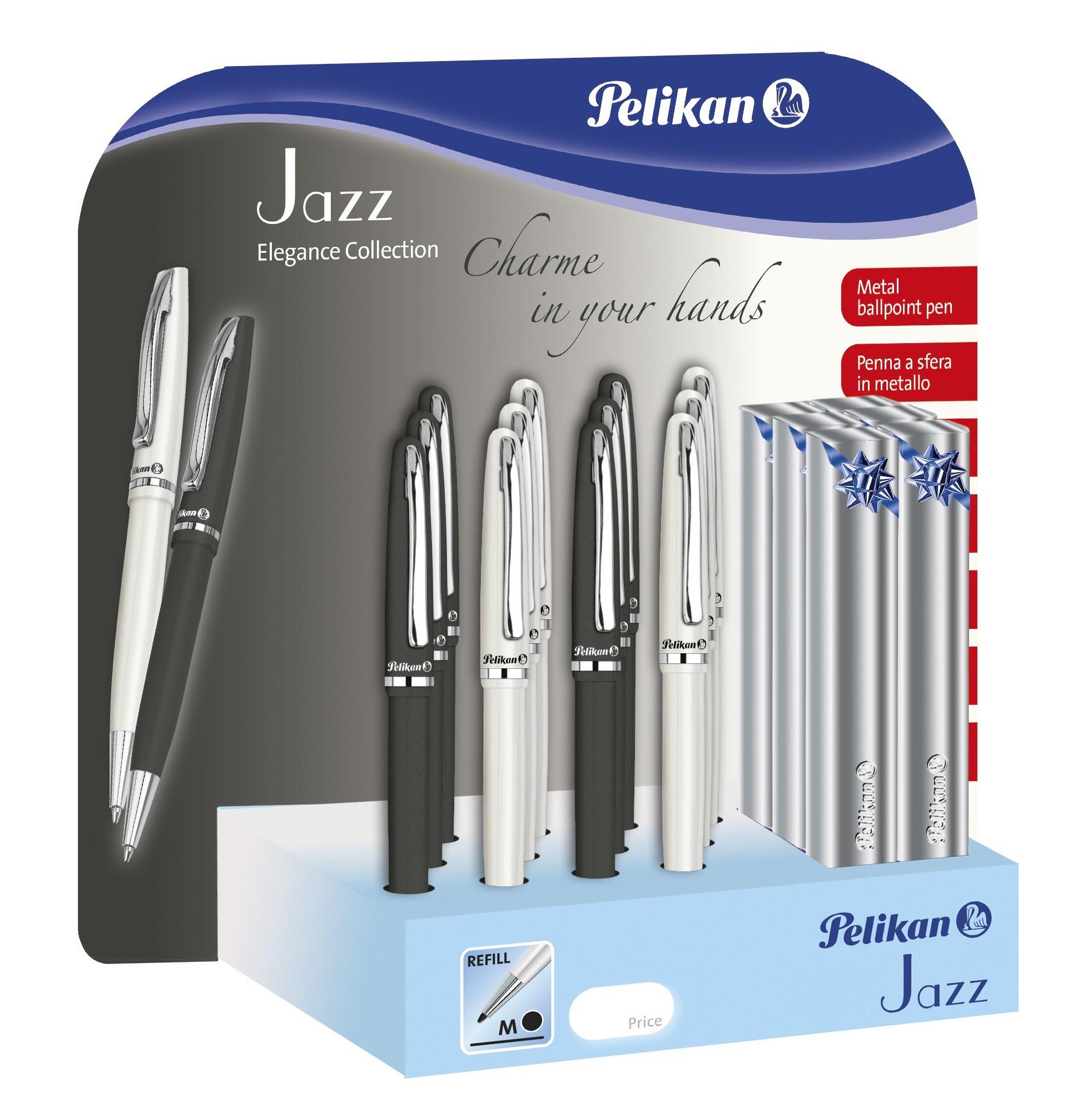 Elegance, kovové, matně lakované, černé nebo bílé tělo s kovovým klipem, náplň Pelikan 337 M modrá.