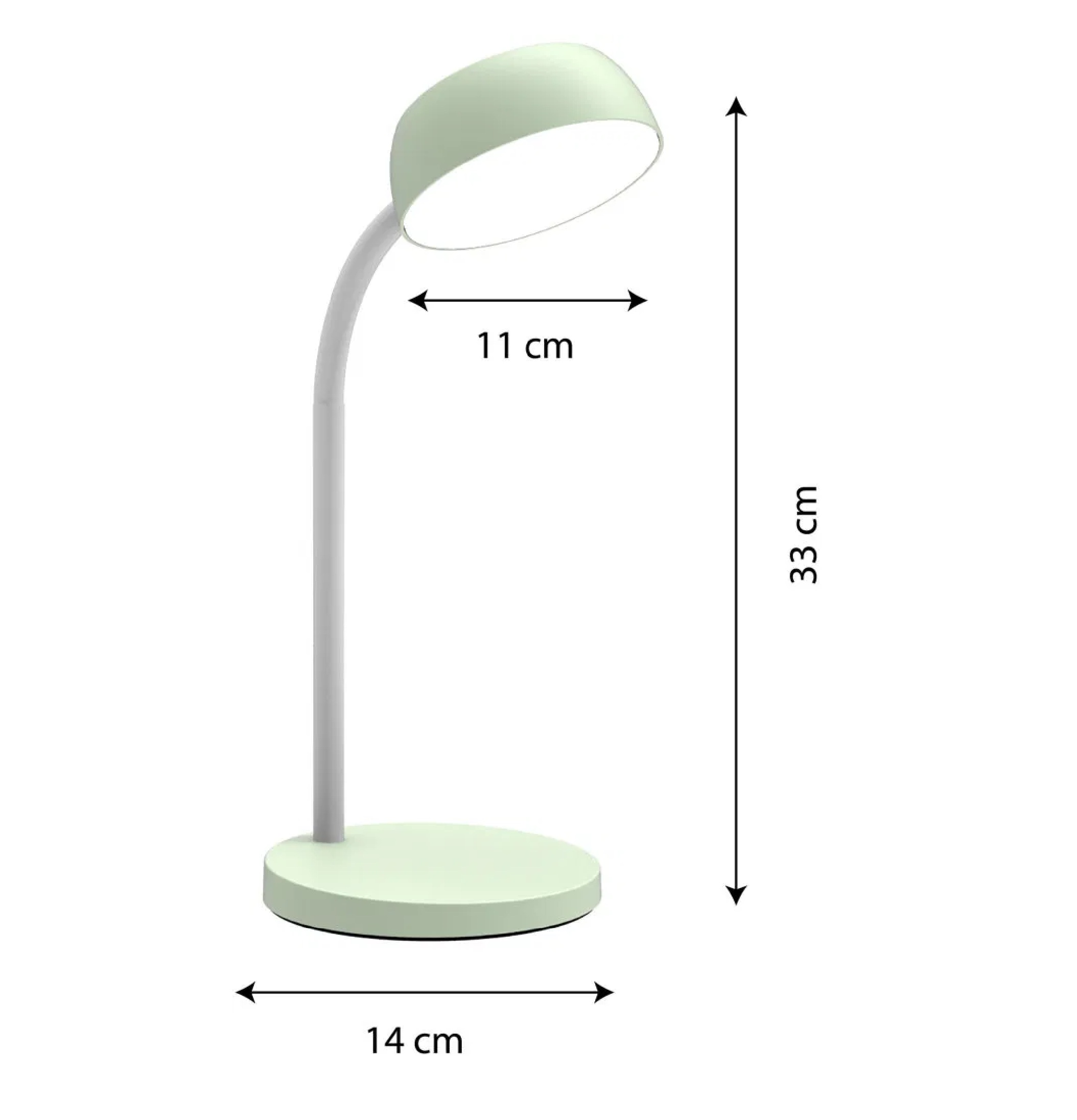 Popis:LED, 625 lumenů, 6 W, 104 lm/W, 84 CRI, 3000 K, 840 lux, 20000 hod, výška 33 cm, šířka 14 cm,˙ energeticky šetrná, vypínač na kabelu, ABS plastová hlava a základna, kovové rameno s gumovým povrchem