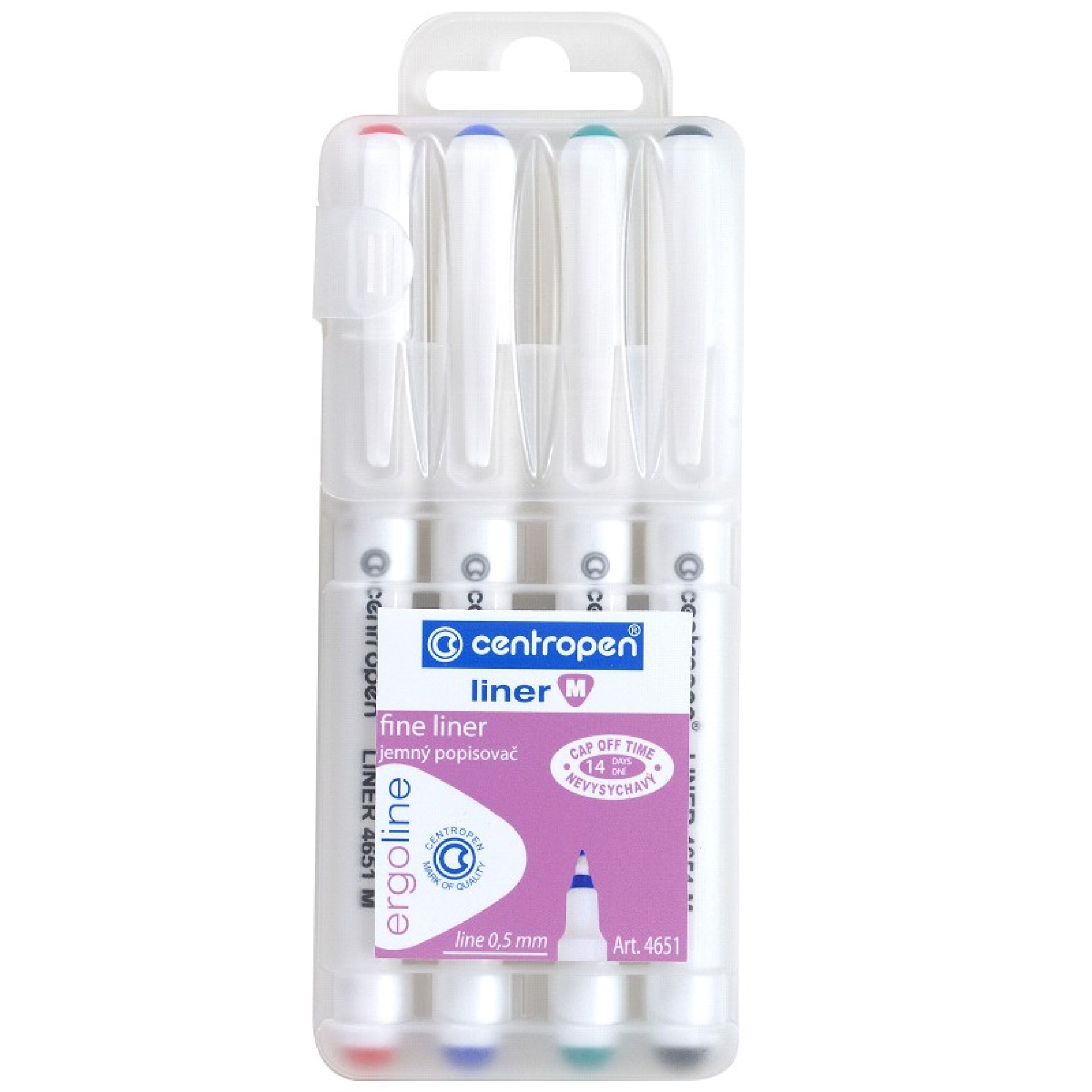 Šířka stopy 0,5 mm? Obsahuje 4 popisovače: černý, červený, modrý a zelený.