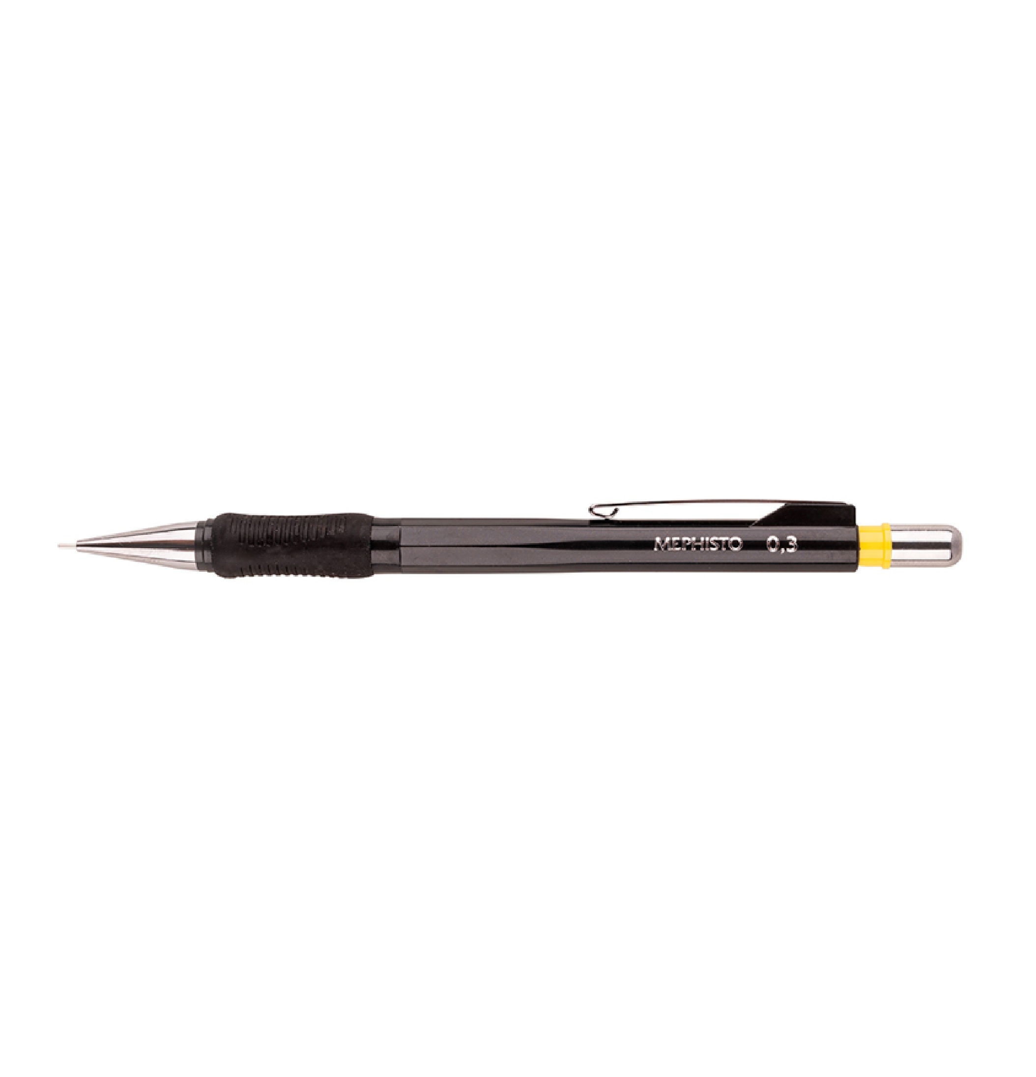Výrobek se používá jako mechanická tužka pro běžné psaní. Mechanická tužka MEPHISTO. Mix barev pláště: černá, červená, modrá. Gumový úchyt. Gumička. Průměr cca 10 mm, délka 150 mm. Kovový klip. Součástí je grafitová tuha průměr 0,3, gradace B.