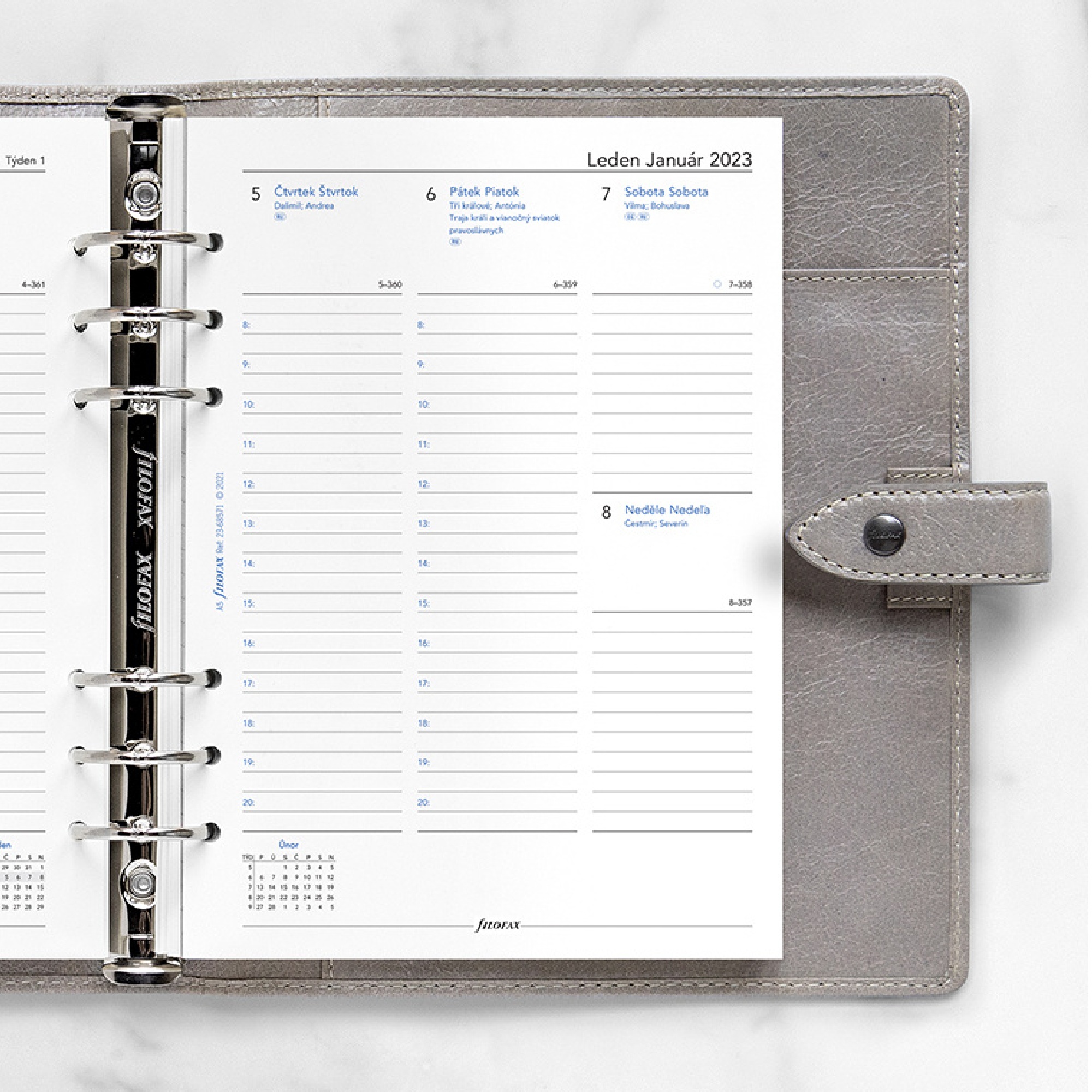 Kalendář A5 v českém a slovenském jazyce se 2 stranami týdnů a rozvrhem.