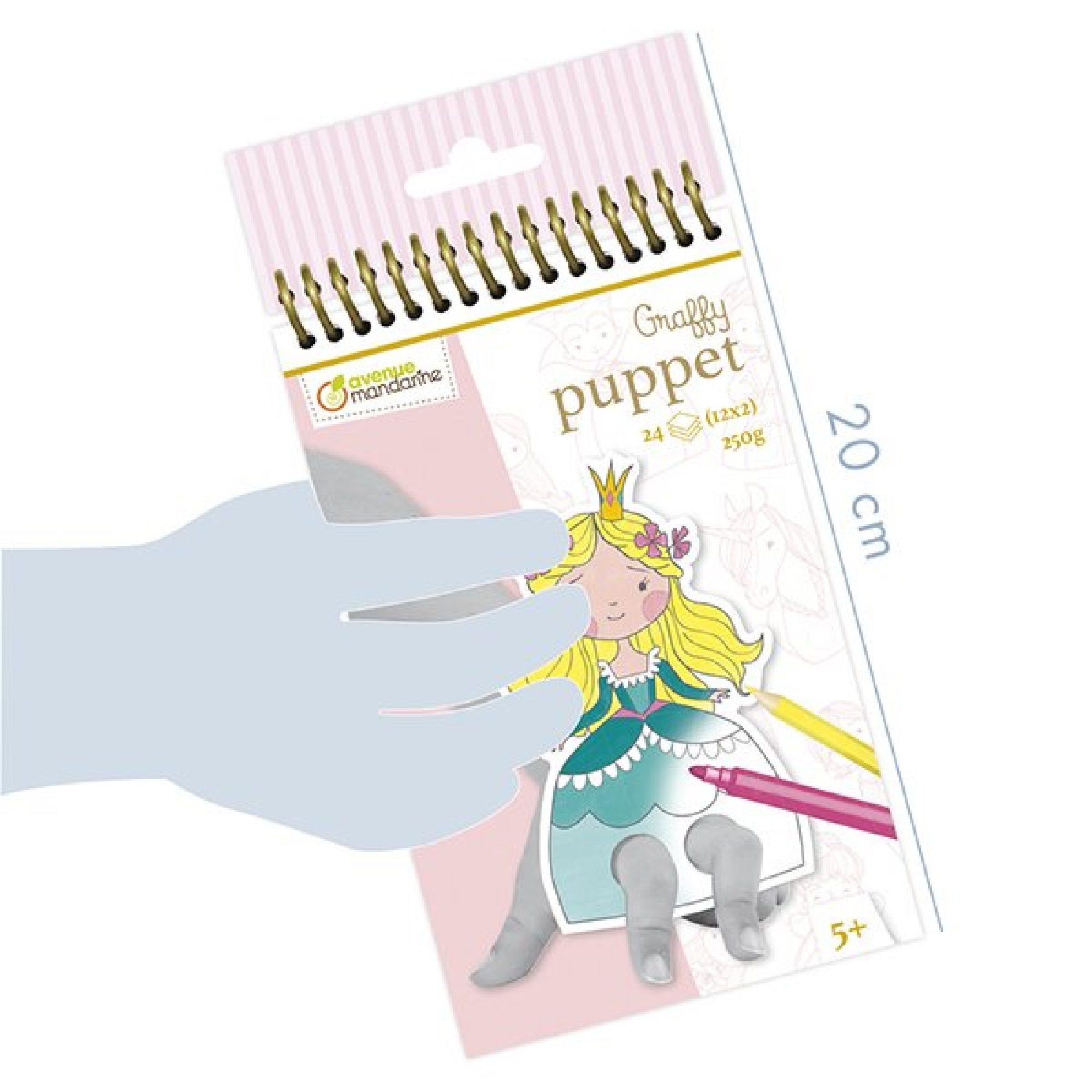 Popis:Omalovánky Avenue Mandarine Graffy Puppet s motivy princezen. Omalovánky předem připravené a upravené pro následné použití jako prstové loutky, stačí je vybarvit a hrát si. Omalovánky obsahují 24 listů, 12 motivů po 2 ks, kroužková vazba. Lze použít na techniky: pastelky, fixy, akvarel atd.