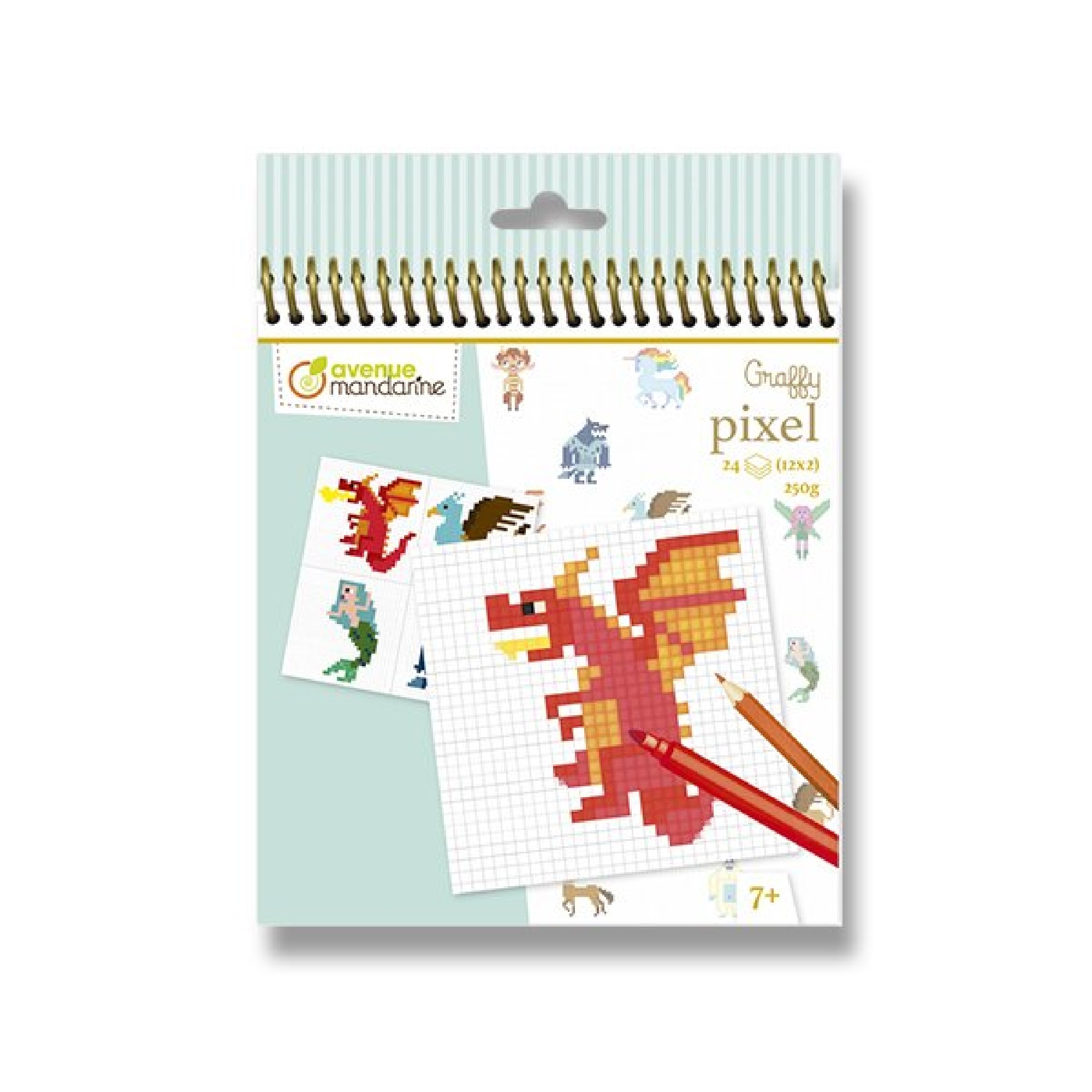 Popis:Omalovánky Avenue Mandarine Graffy Pixel s různými motivy. Omalovánky jsou určené k překreslení modelu z předchozí stránky. Omalovánky mají kroužkovou vazbu pro zajištění rovného podkladu a čtverečkový papír usnadňující překreslení. Obsahují 24 listů, 12 motivů po 2 ks. Gramáž 250 g. Lze použít na všechny techniky - pastelky, fixy, akvarel atd.