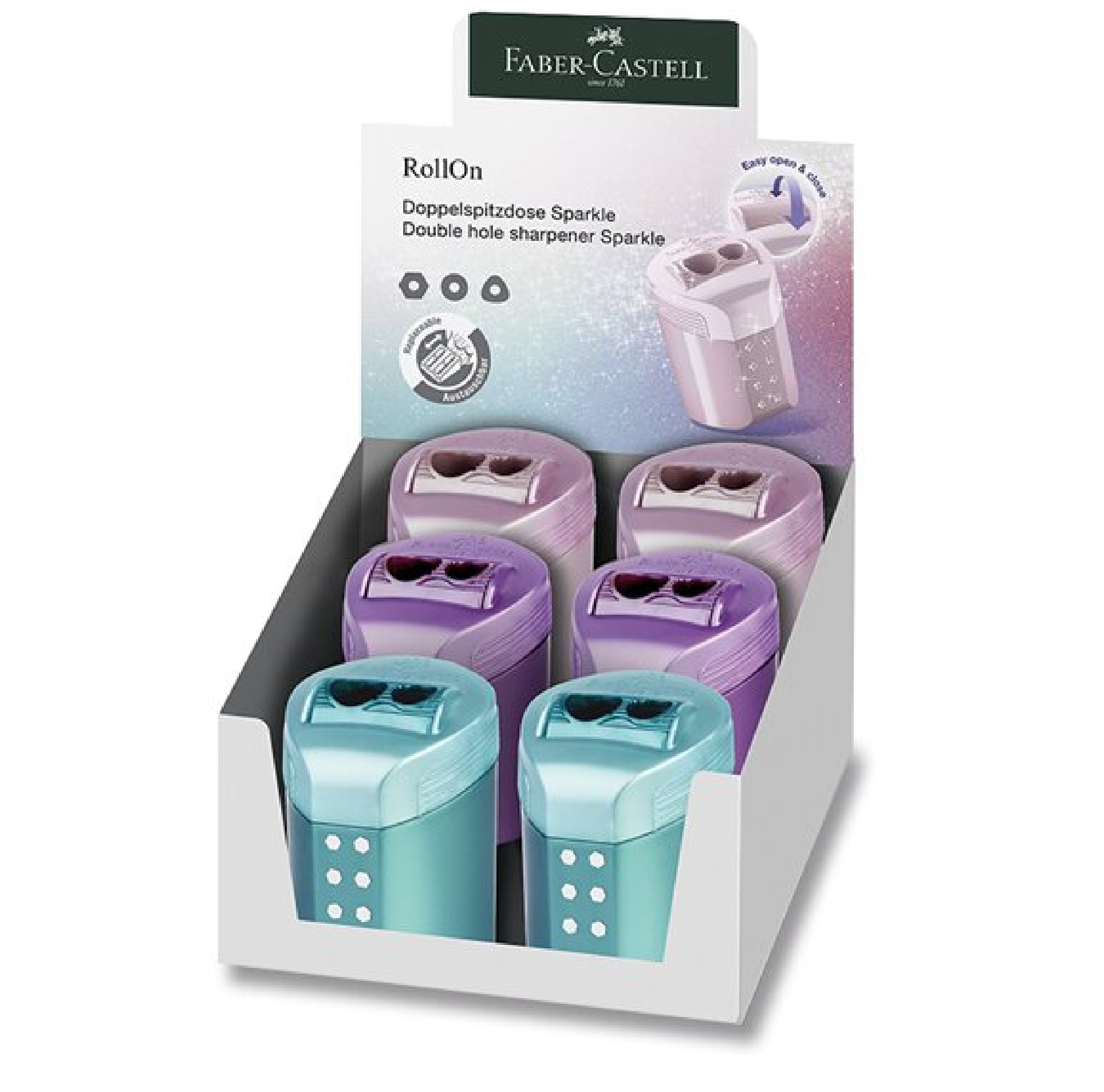 Popis:Kvalitní ořezávátko Faber-Castell RollOn Sparkle s glitrovým efektem na těle, odpadní nádobkou a 2 otvory. Vhodné je pro klasické i silné (JUMBO) pastelky a grafitové tužky. Má rolovací mechanismus, který zabraňuje vypadávání odpadu.