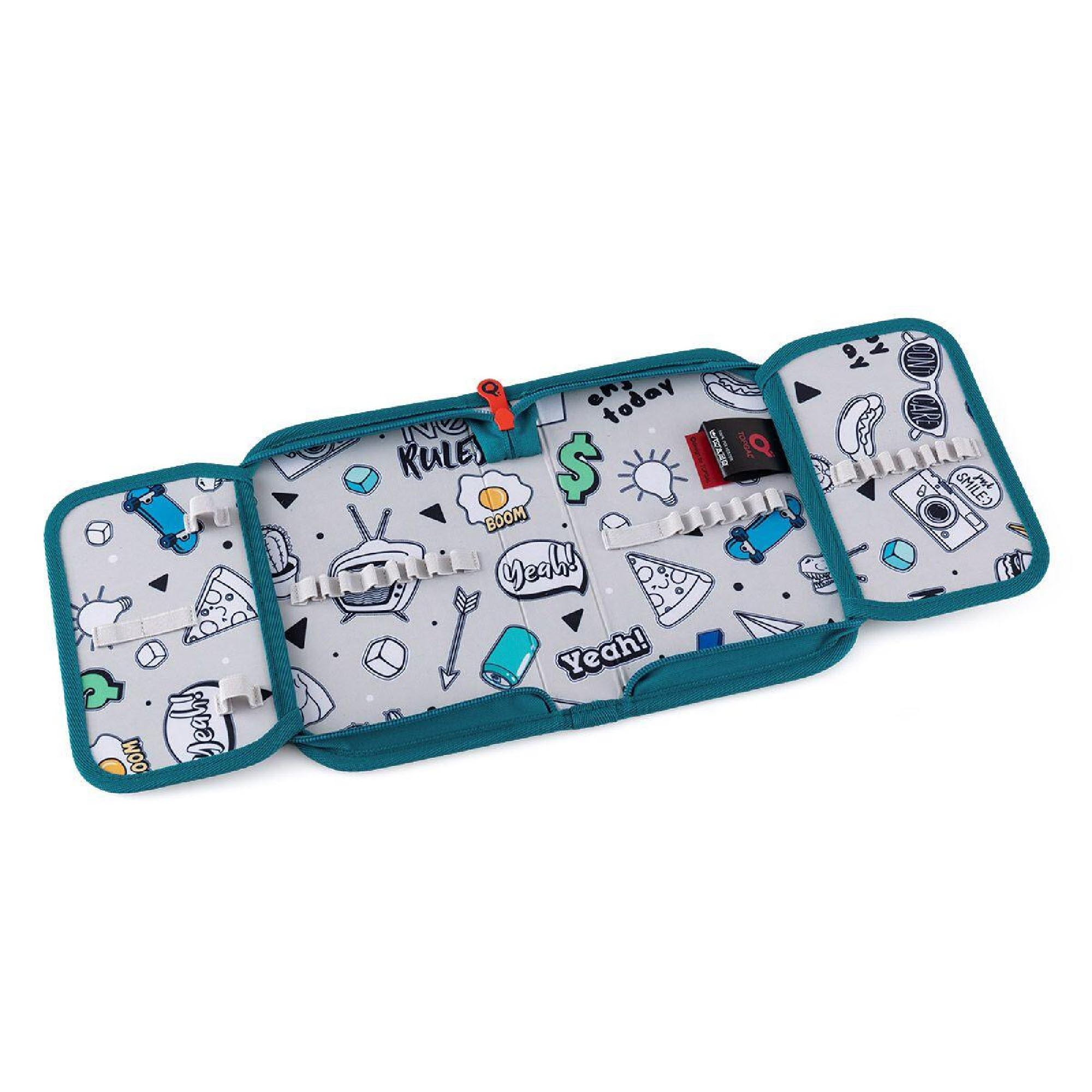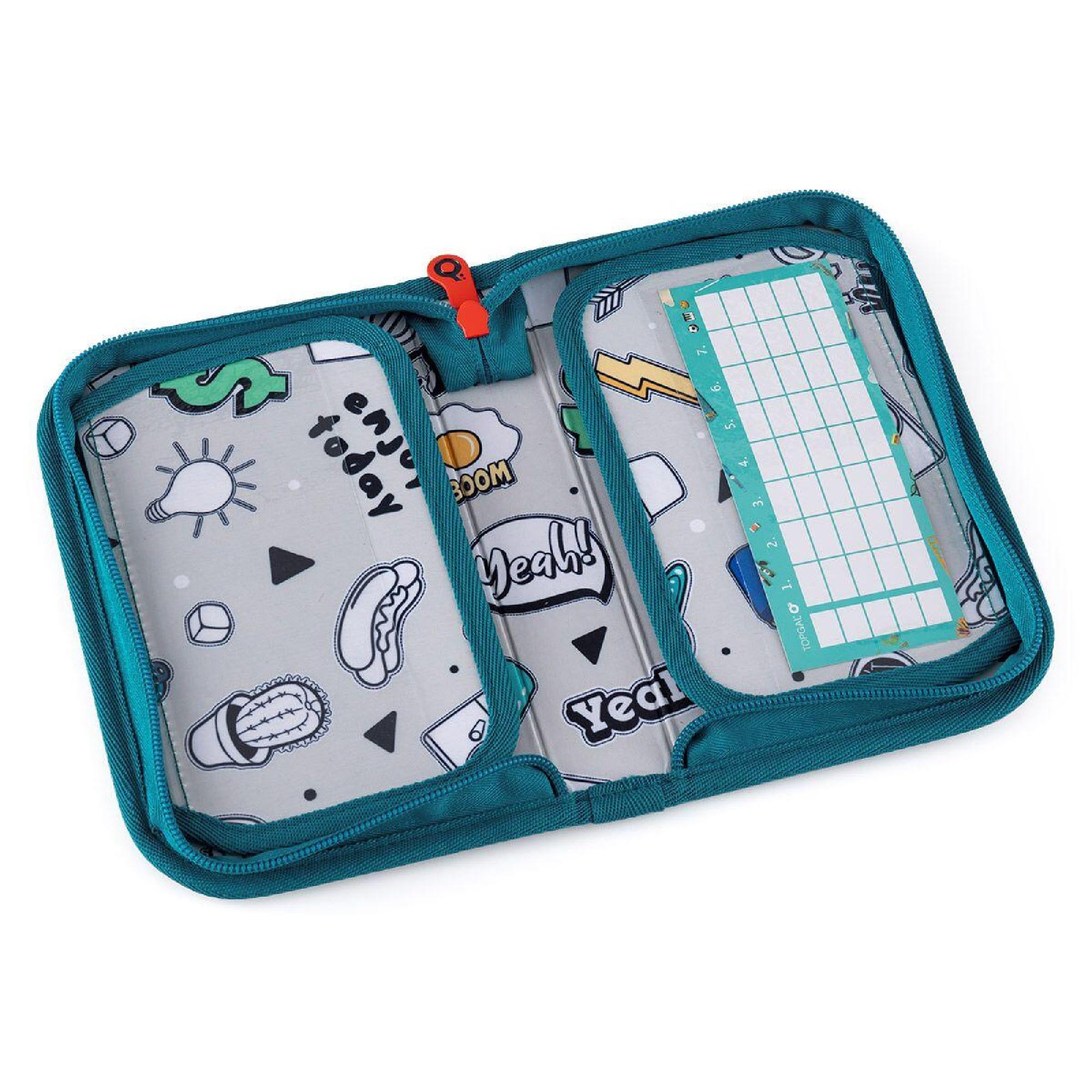 Kreslení povoleno! Vnitřní podšívka pouzdra je vyrobena z šedé látky s natištěnými obrázky. Ty si mohou děti vybarvit dle nálady a chuti. Naše malé doporučení - pro vybarvování budou lepší pastelky, fixy by se mohly rozpíjet.