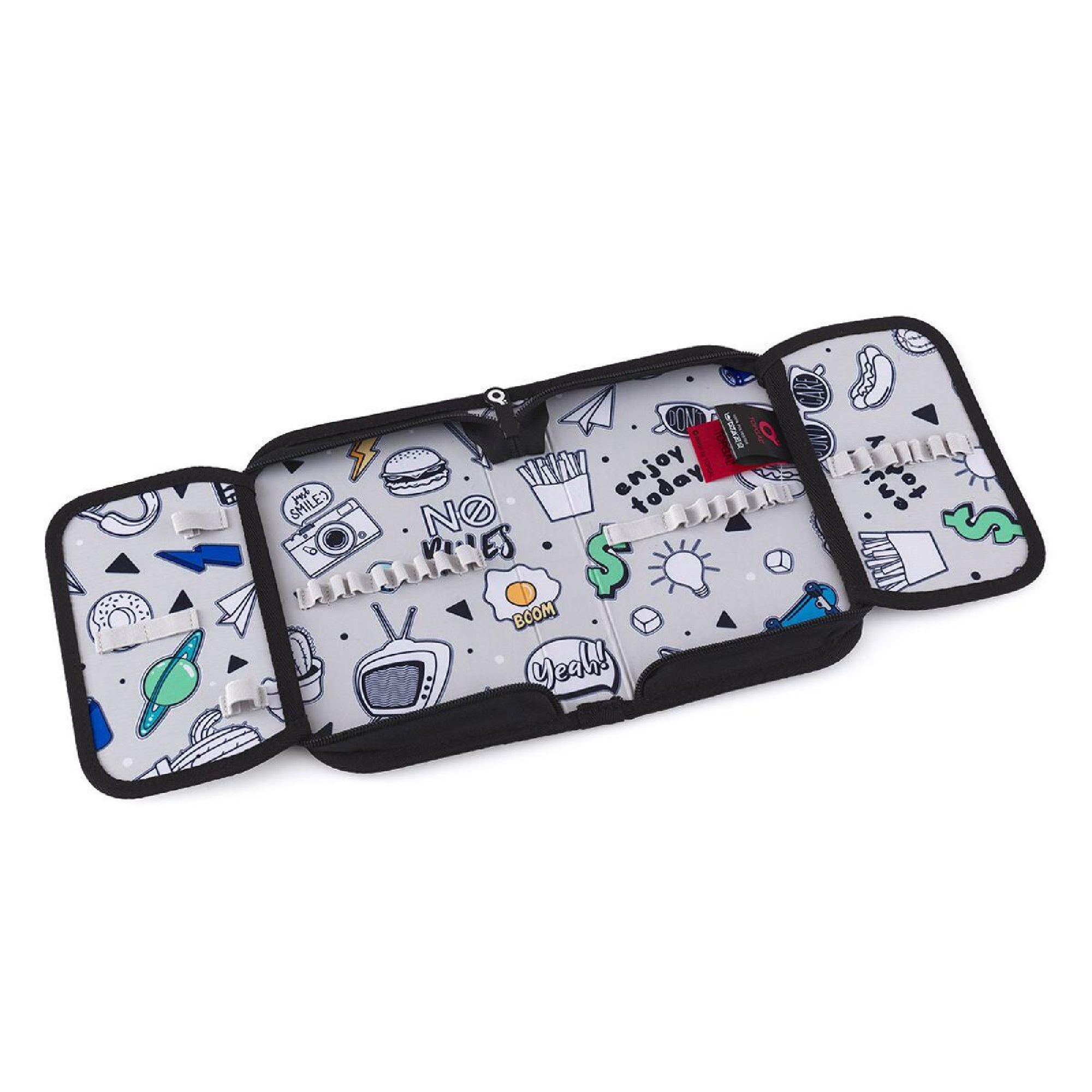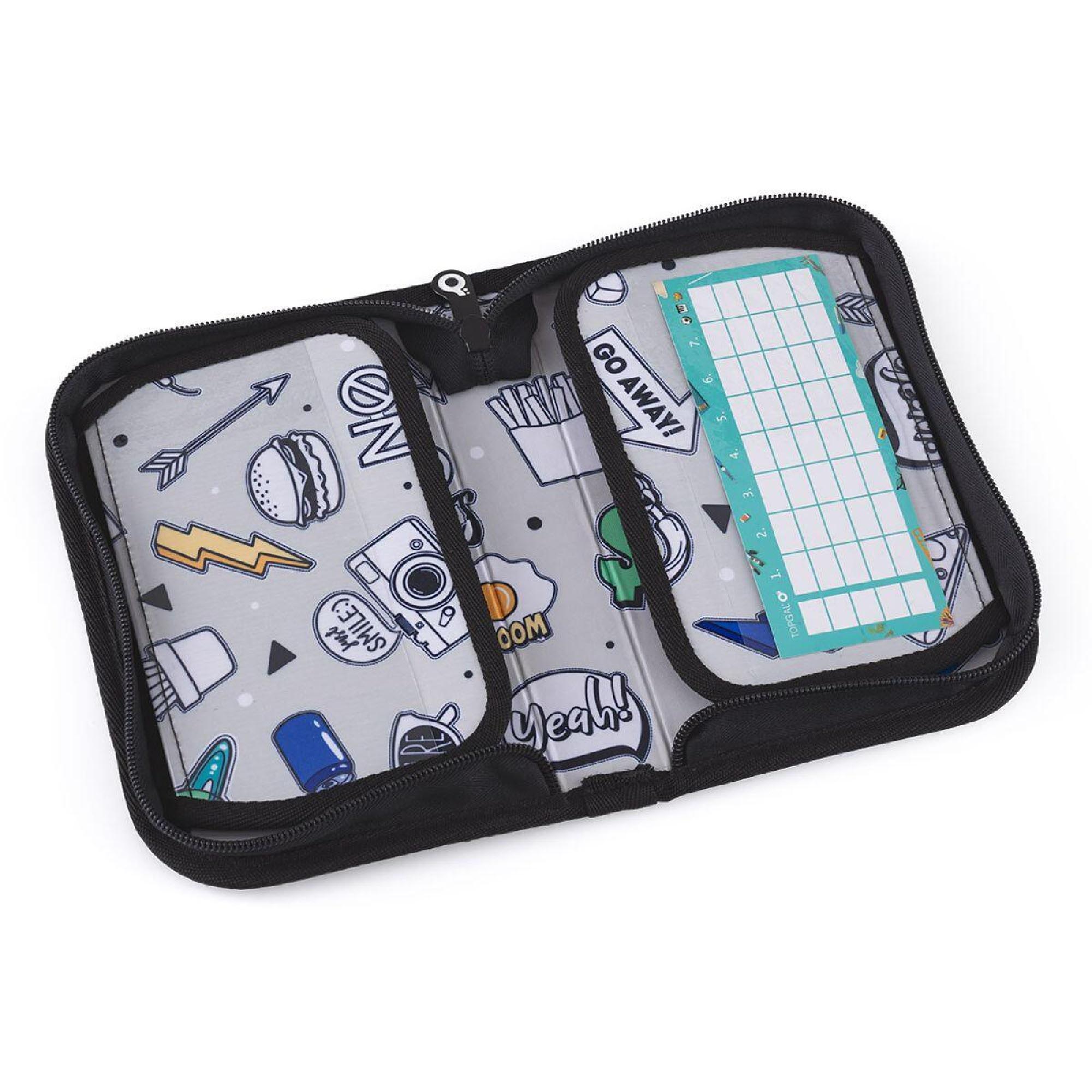 Kreslení povoleno! Vnitřní podšívka pouzdra je vyrobena z šedé látky s natištěnými obrázky. Ty si mohou děti vybarvit dle nálady a chuti. Naše malé doporučení - pro vybarvování budou lepší pastelky, fixy by se mohly rozpíjet.