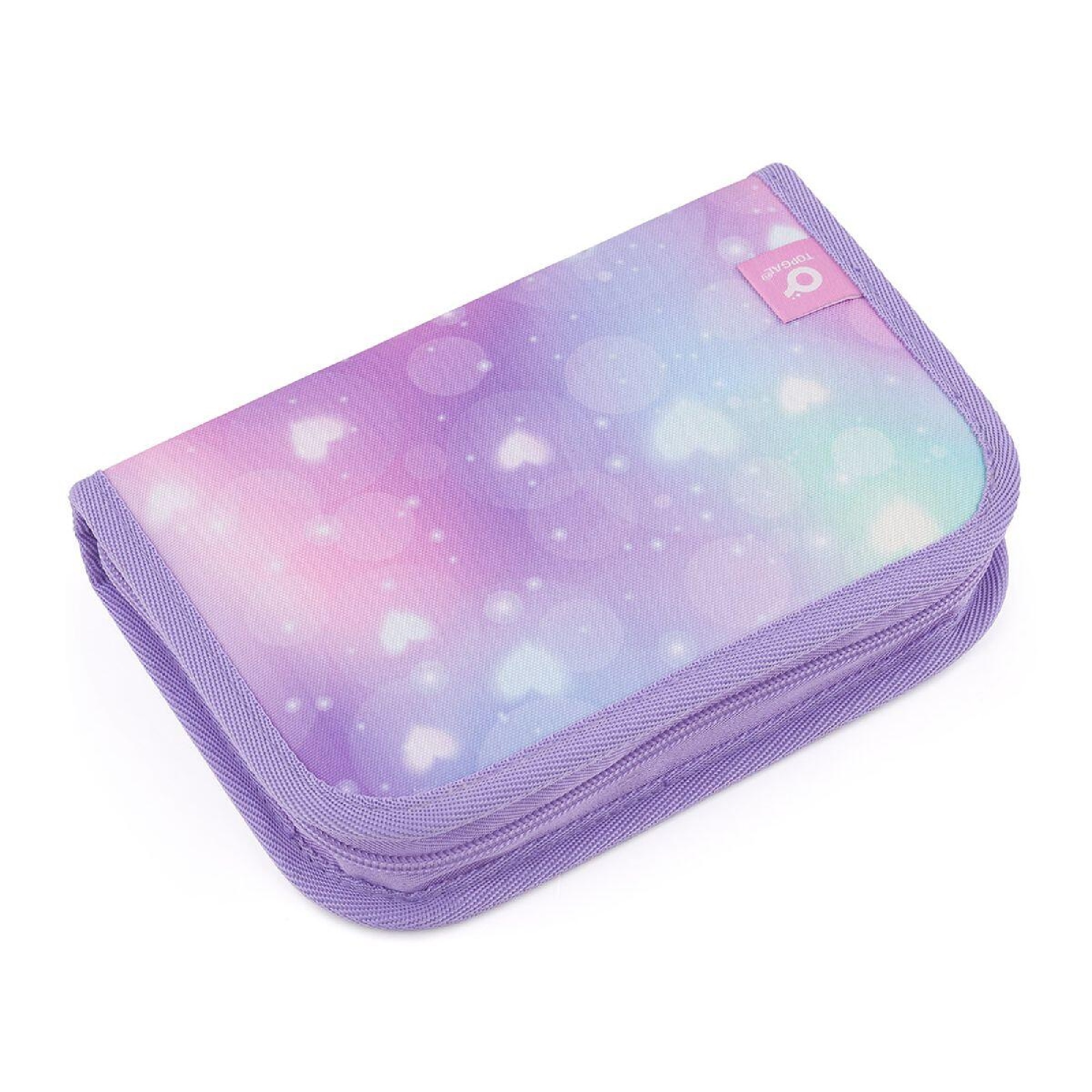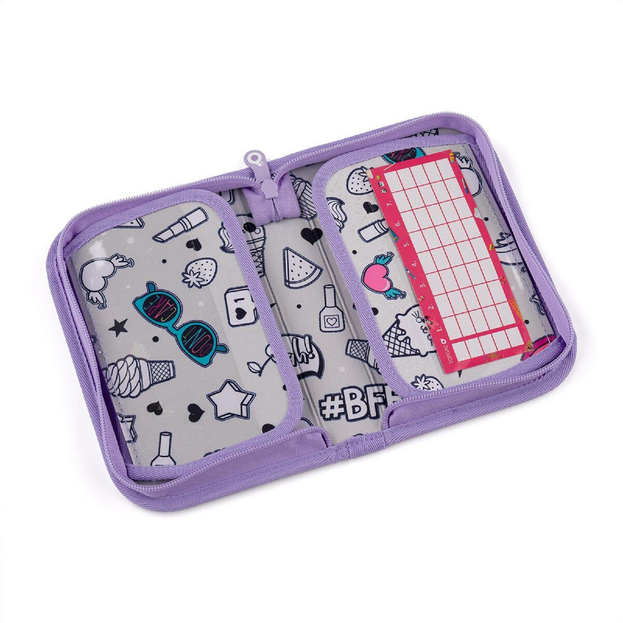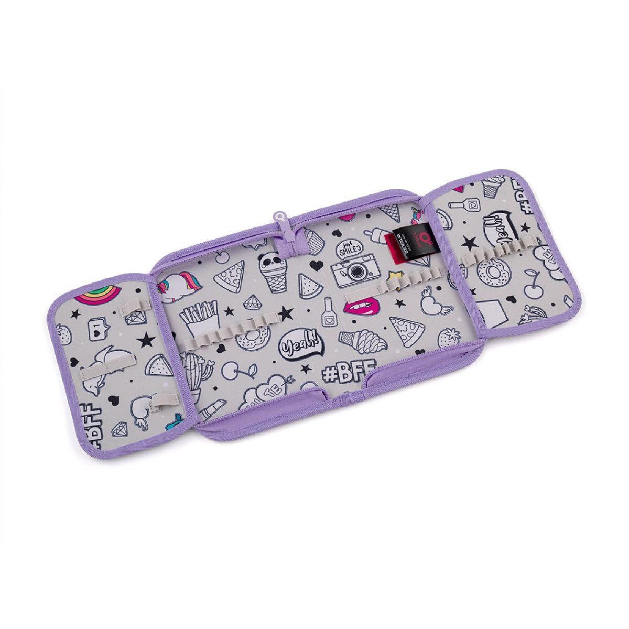 Jednopatrové školní pouzdro se dvěma klopami. Díky gumovým úchytům se do nich vejde celkem dvacetjedna pastelek, tužek a fixek. Tři širší úchyty poslouží na pravítko, kružítko či nůžky. Dva větší na gumu a ořezávátko.