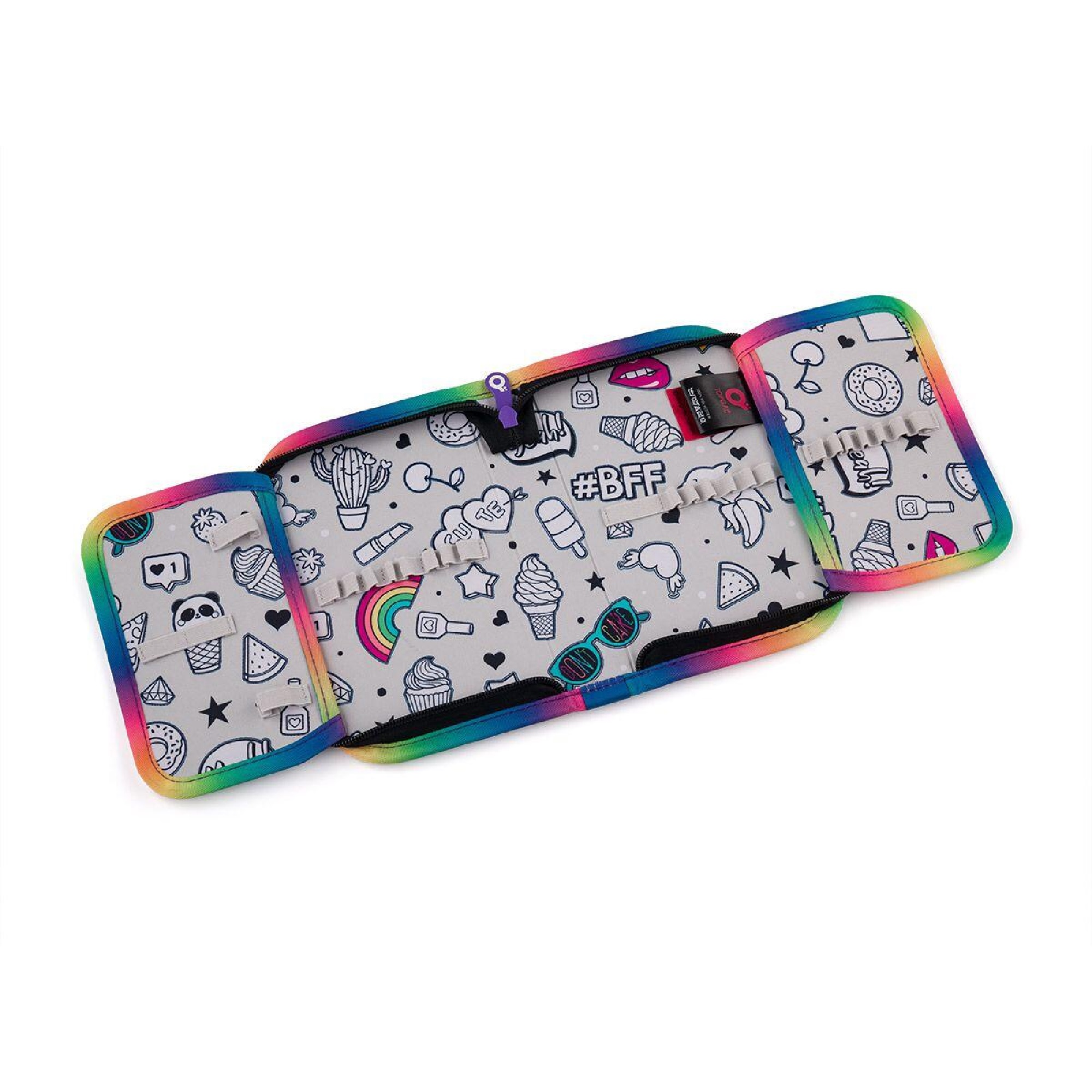 Jednopatrové školní pouzdro se dvěma klopami. Díky gumovým úchytům se do nich vejde celkem dvacetjedna pastelek, tužek a fixek. Tři širší úchyty poslouží na pravítko, kružítko či nůžky. Dva větší na gumu a ořezávátko.