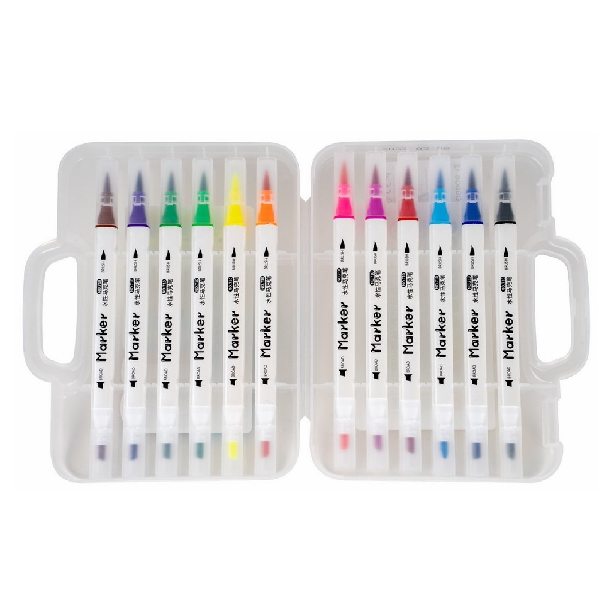 Popis:sada 12 kusů oboustranných popisovačů v elegantním plastovém kufříku s uchem, štětcový (3,2 mm) i zkosený (3,5 mm) hrot, zářivé barvy, čtvercový profil těla, inkoust na vodní bázi