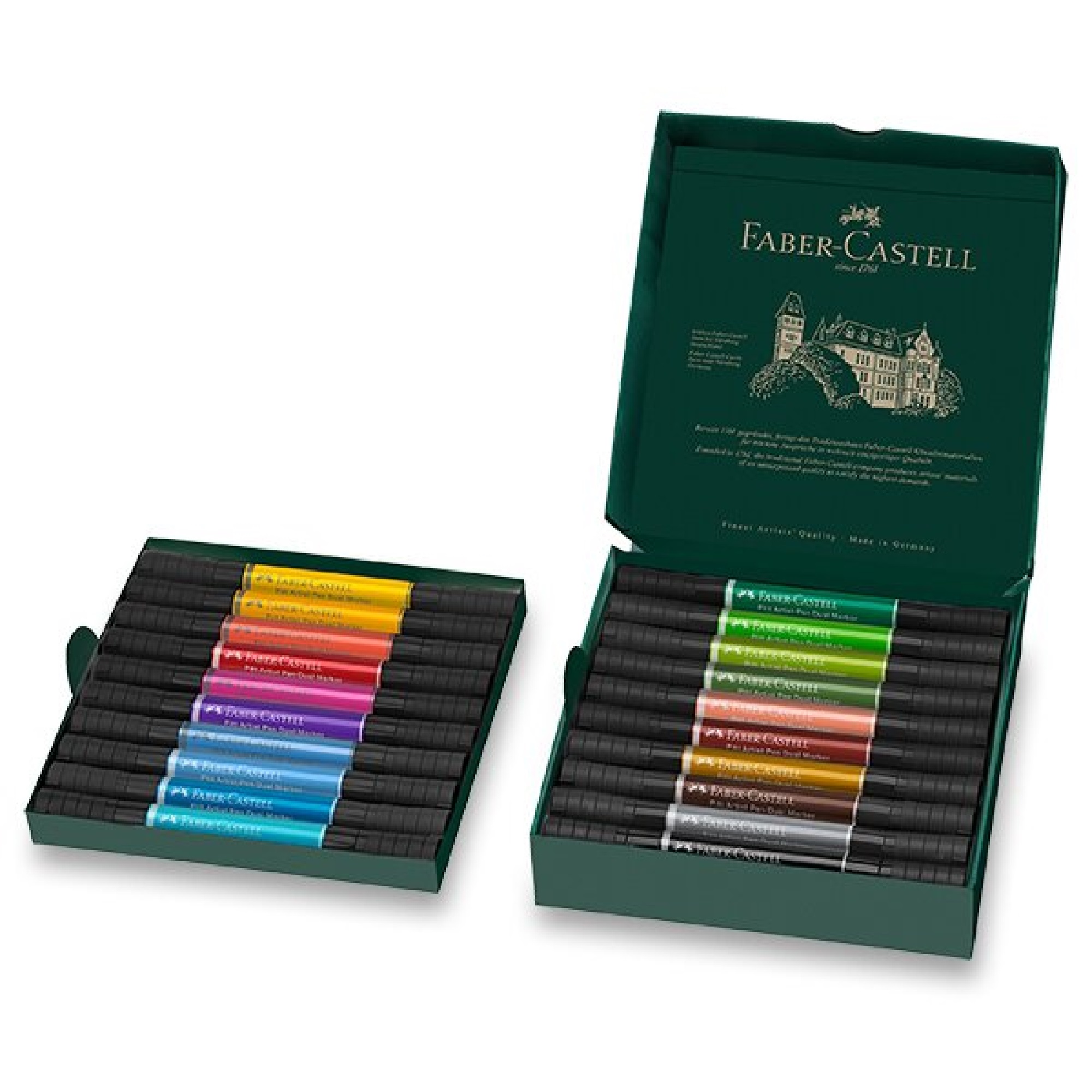 Popis:Sada 20 ks moderního uměleckého oboustranného popisovače Faber-Castell Pitt Artist Pen Dual Marker pro tušové skicování, kreslení a malbu. Popisovač má měkký štětec pro uměleckou práci a tenký hrot v kovovém pouzdře pro jemné linky kontur a detailů. Změnou úhlové polohy a změnou tlaku je možné vytvořit různé šířky čar.